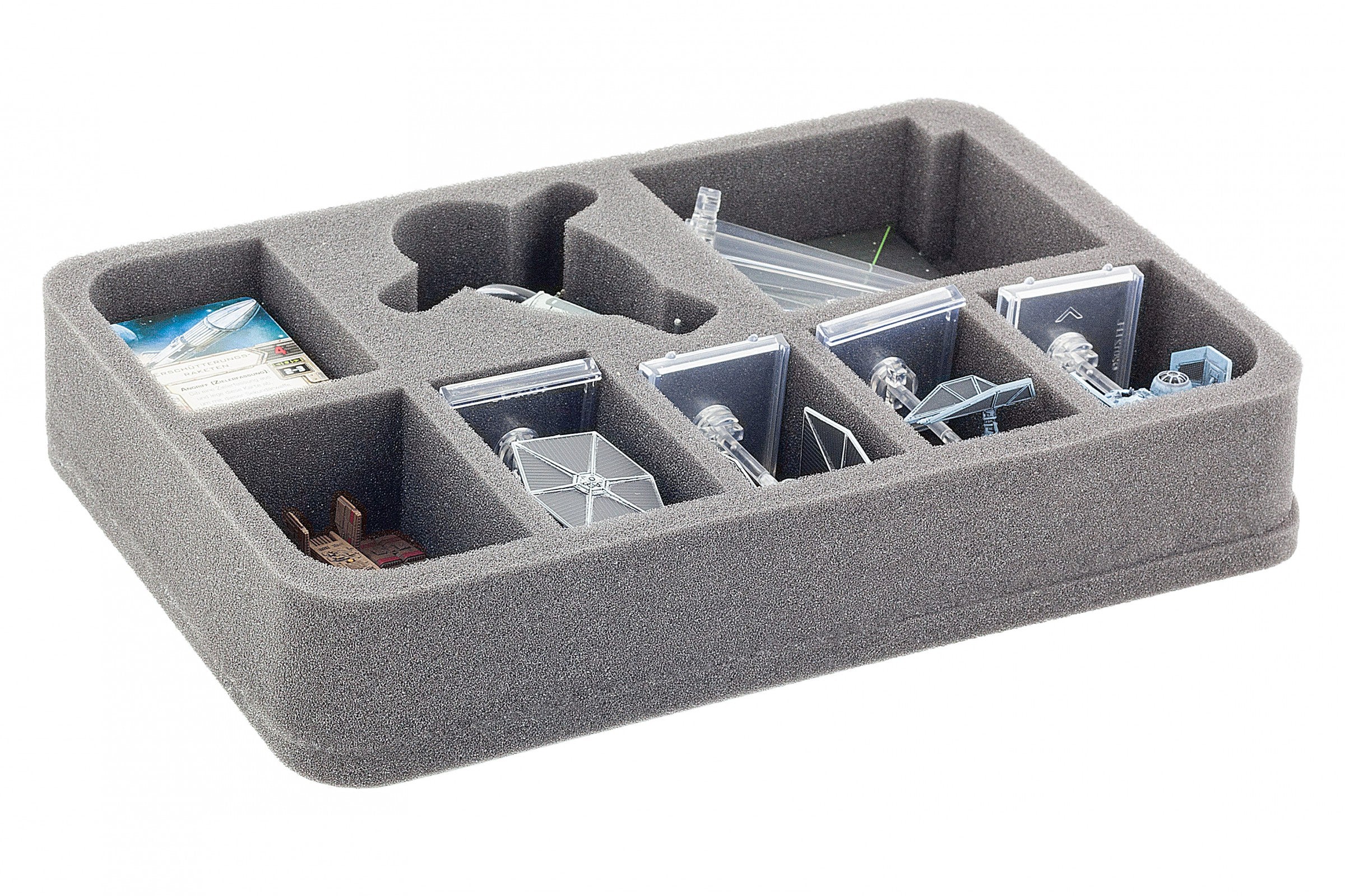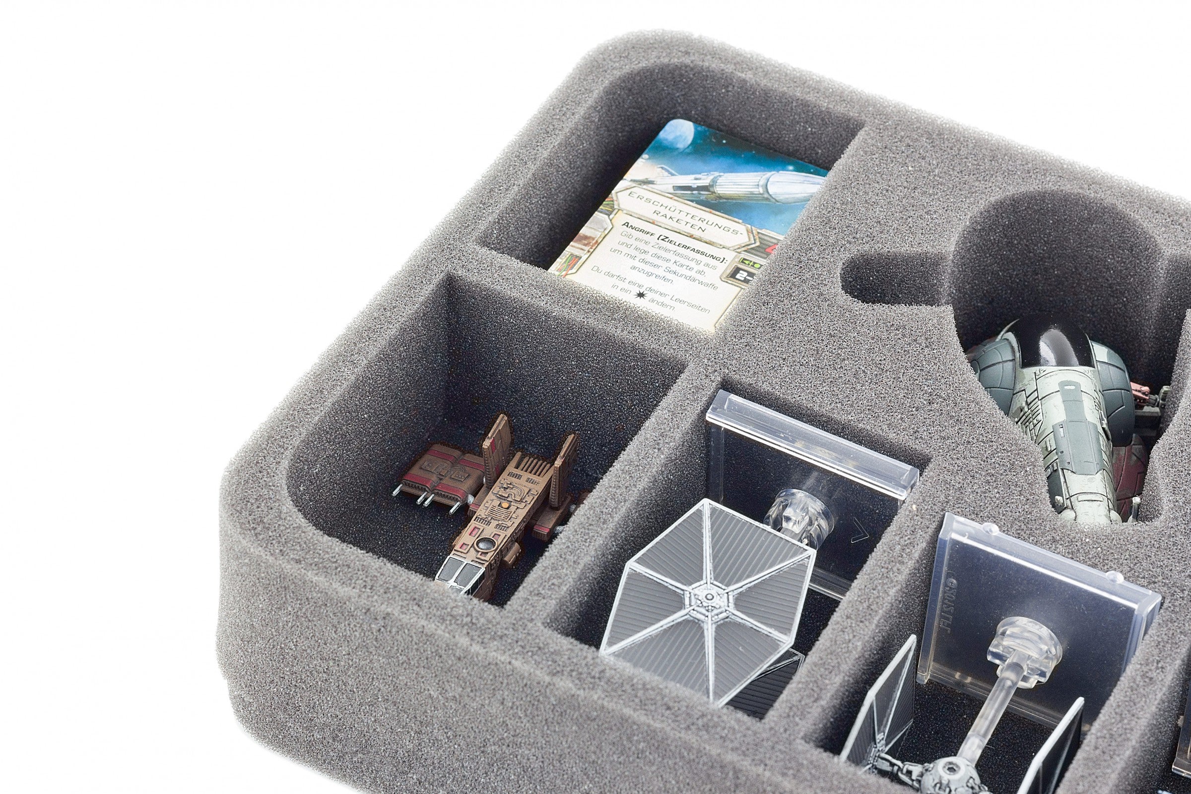 Uno scomparto è in miniatura, tagliato con precisione per adattarsi al modello Slave I (compatibile con entrambe le varianti, Slave I e Slave I di Jango Fett). Il taglio personalizzato impedisce al modello di scivolare durante il trasporto. Così non solo le ali e le altre parti sensibili sono protette da danni. Anche i colori della miniatura sono risparmiati da abrasioni e graffi.