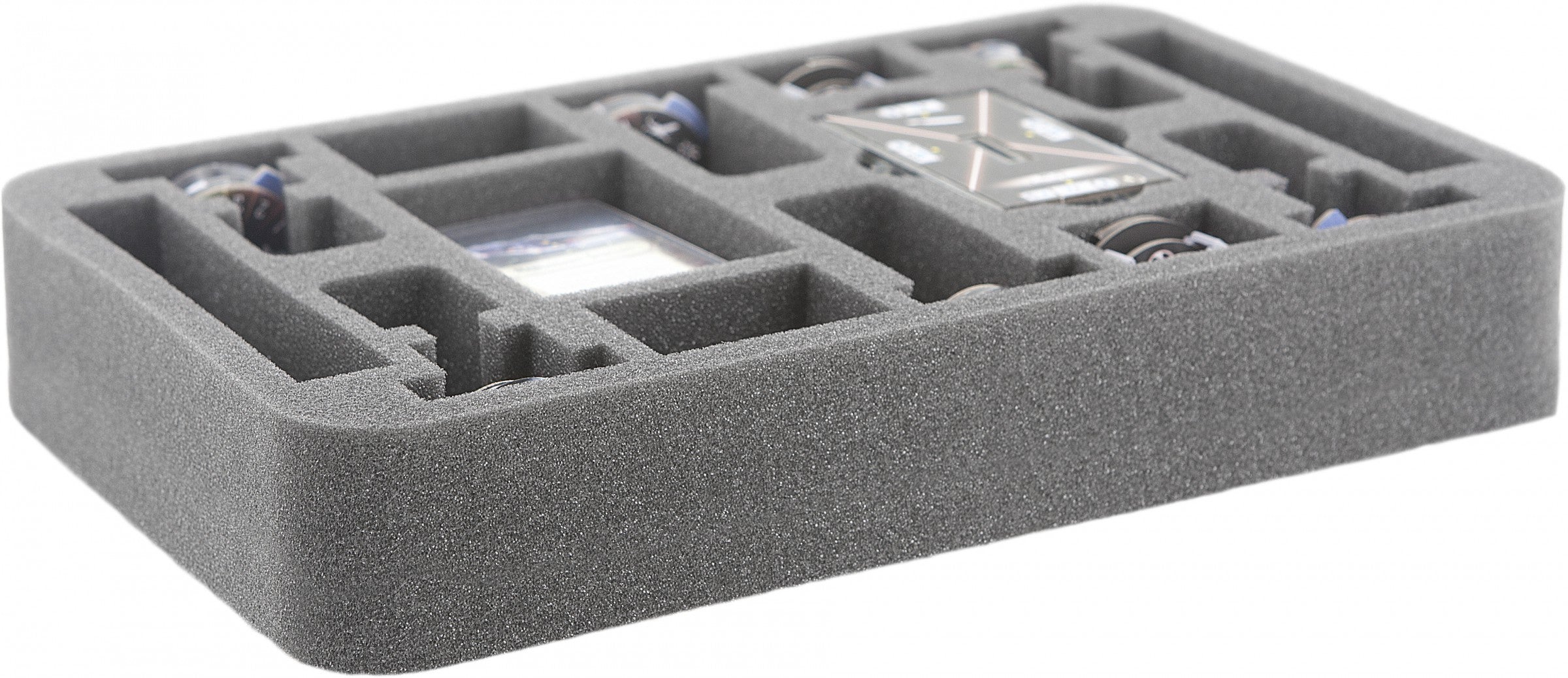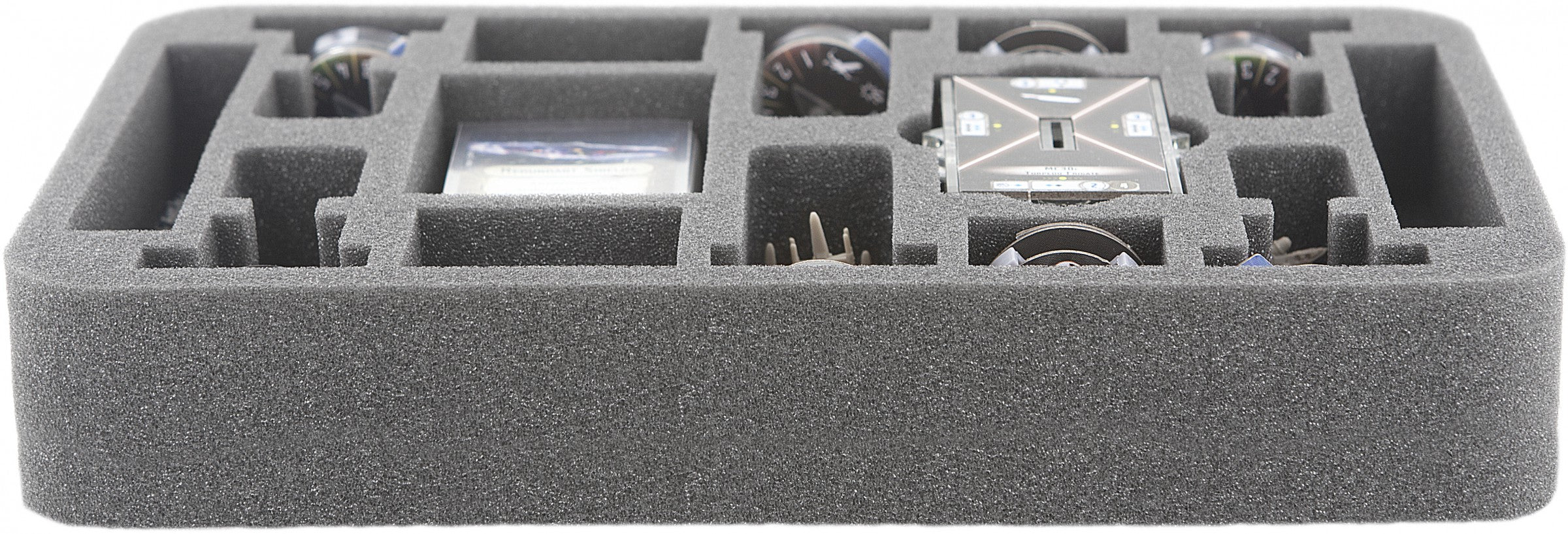 Specialmente per il vassoio in schiuma Star Wars Armada Wave II. C'è abbastanza spazio per contenere due Fregate d'Assalto Mark II, basi più spazio extra per gettoni o dadi. Inoltre, c'è spazio per le carte nelle maniche.