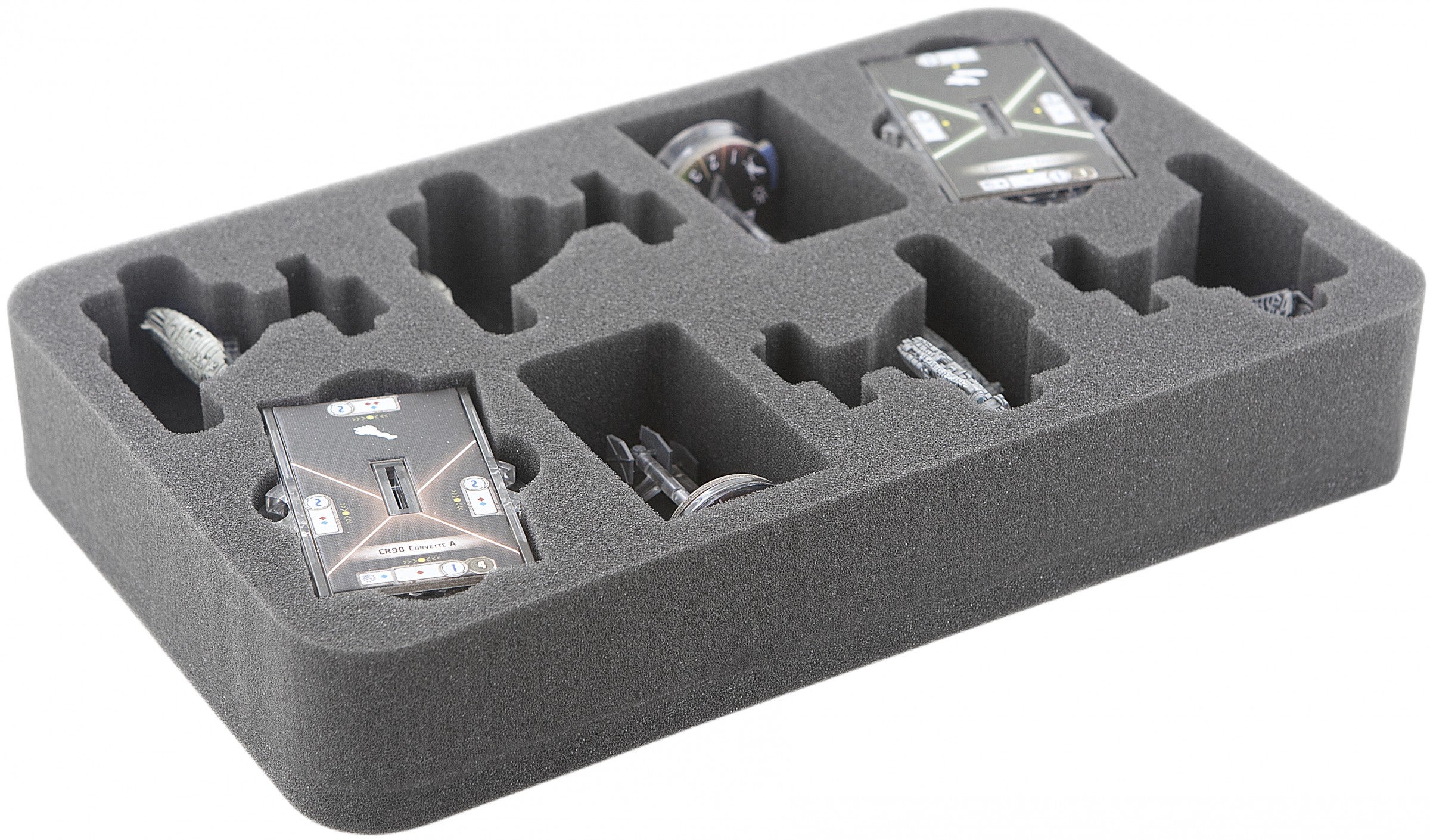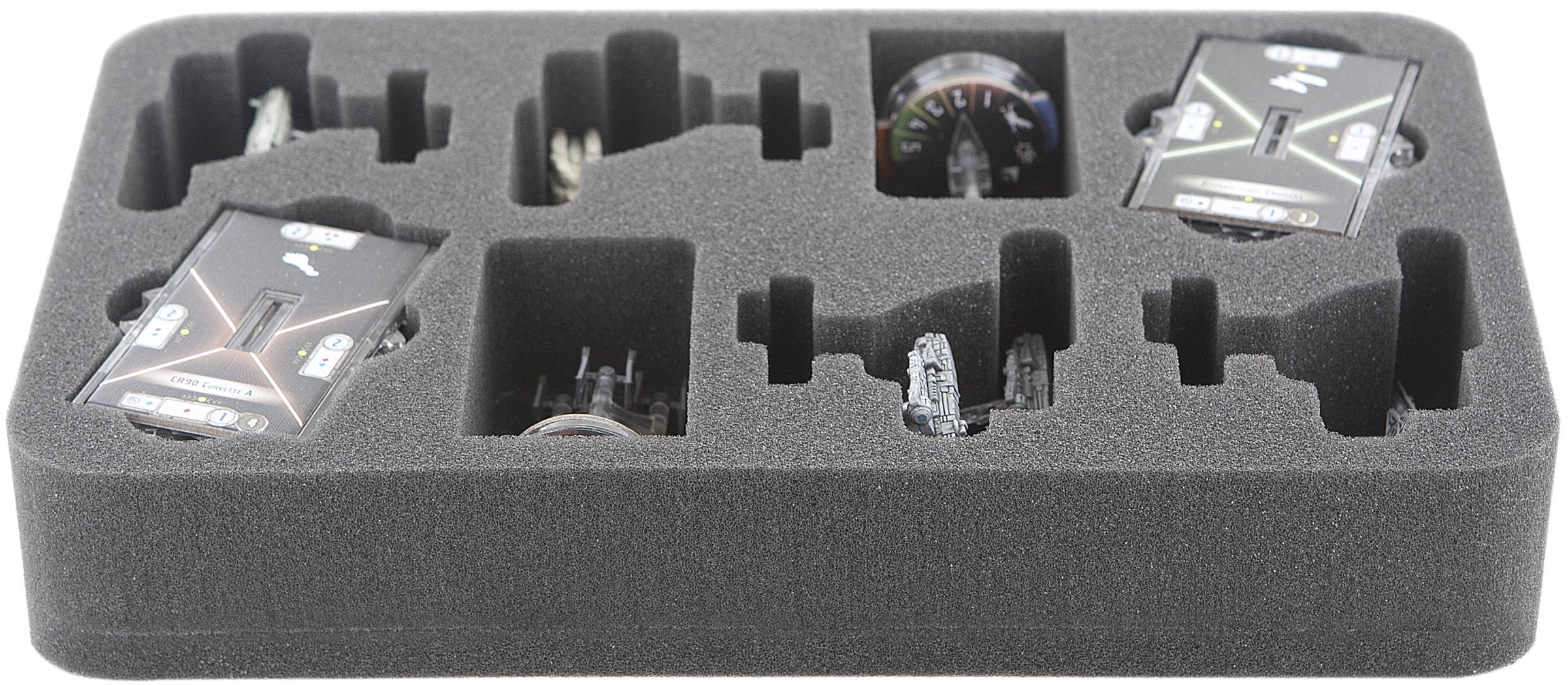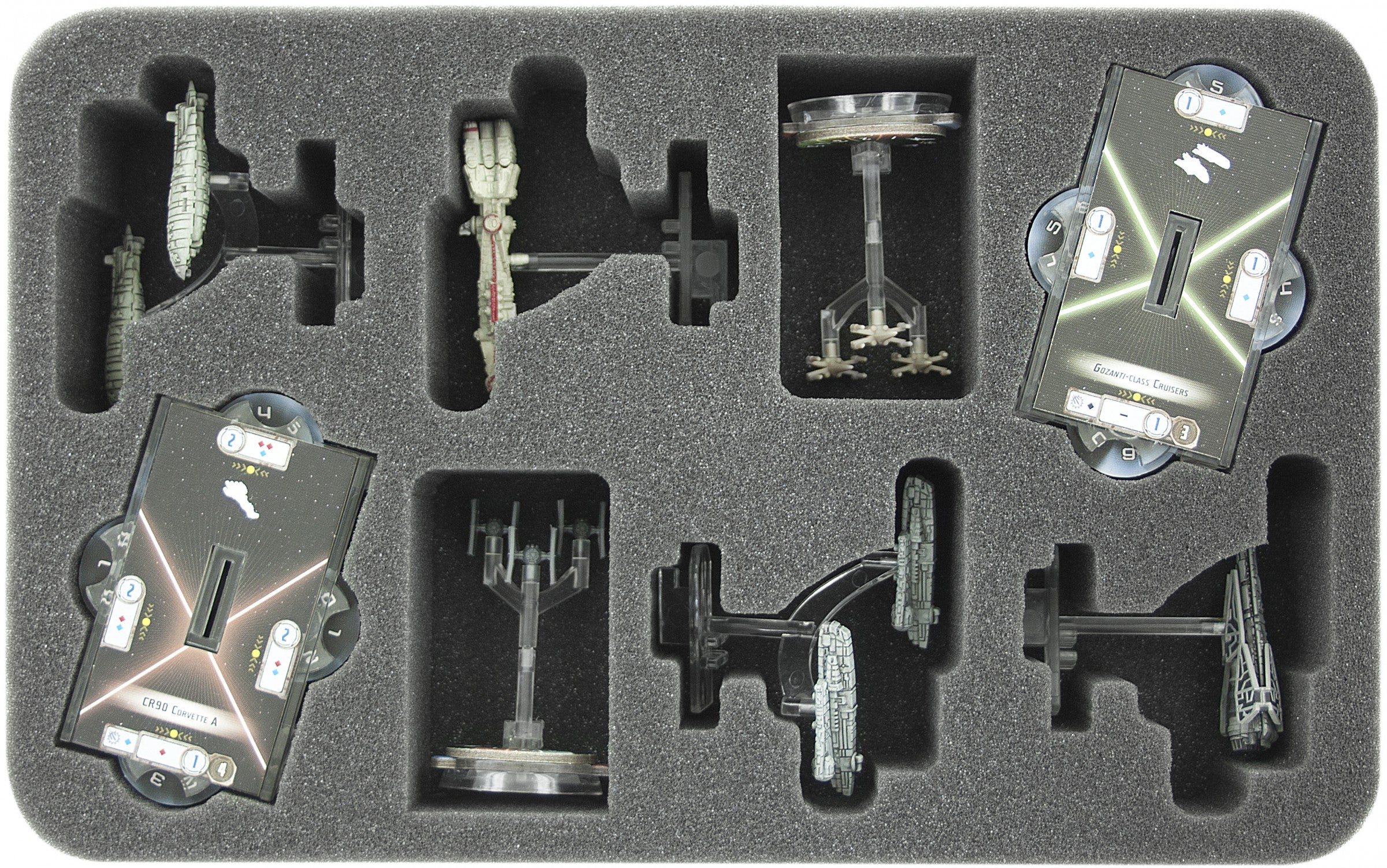 Especially for the Star Wars Armada Wave III foam tray. There is enough space to store 4 Imperial Assault Carriers (Gozanti) and / or Rebel Transports Flotillas (compartments can also be used for Wave 2 Imperial Raider and / or Wave 1 CR90 Tantive!). In addition, there is enough space for 4 bases, standard size, Star Wars Armada Star Ships with base, Command and Speed Dials