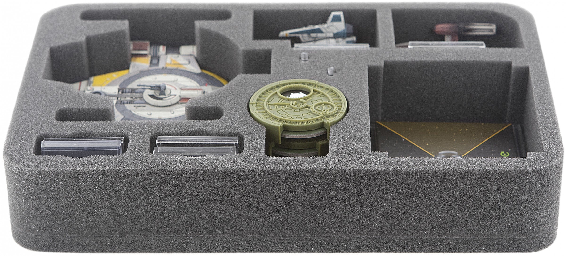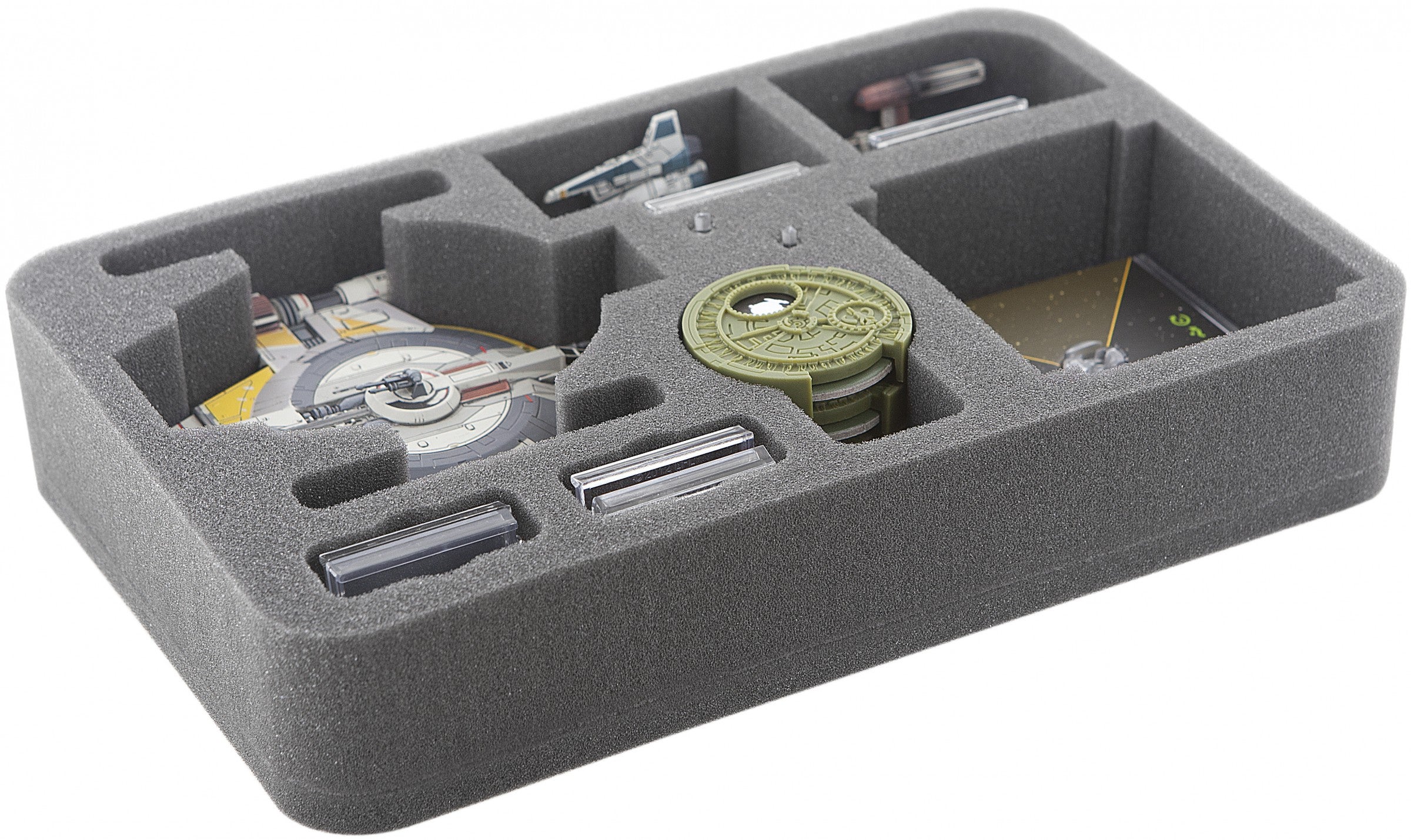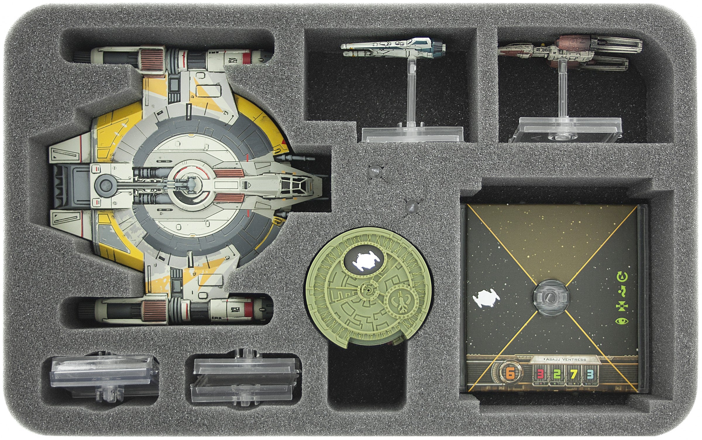 Especially for the Star Wars X-Wing Wave 9 Shadow Caster made foam tray. The trays fits perfect one Shadow Caster. In addition still fit up to three Fighters in the foam tray. Of course, the foam tray offers even space for accessories.