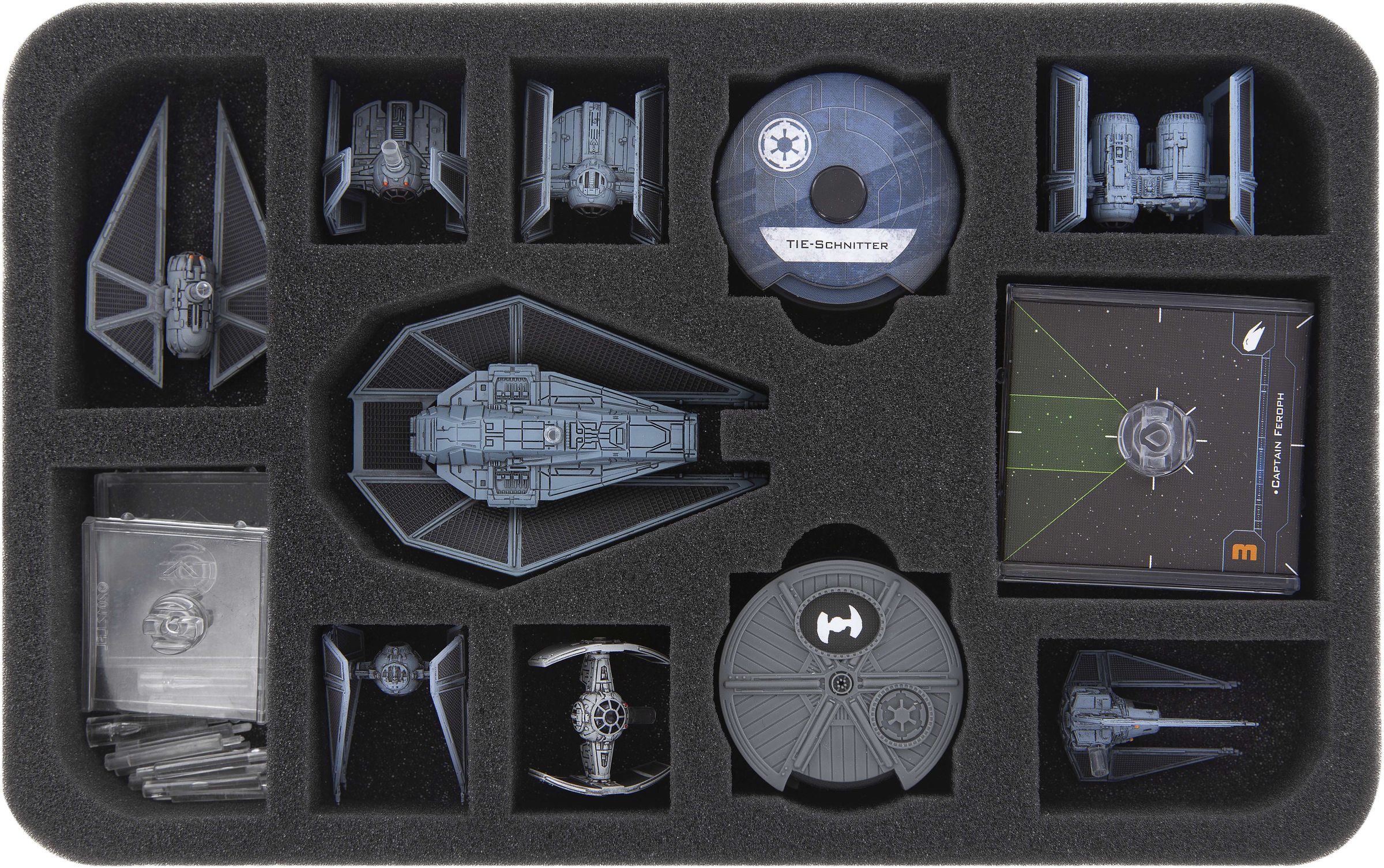 Additional miniatures of your Imperial Fleet, e.g. the TIE Striker or TIE Bomber, can be stored in seven additional compartments: