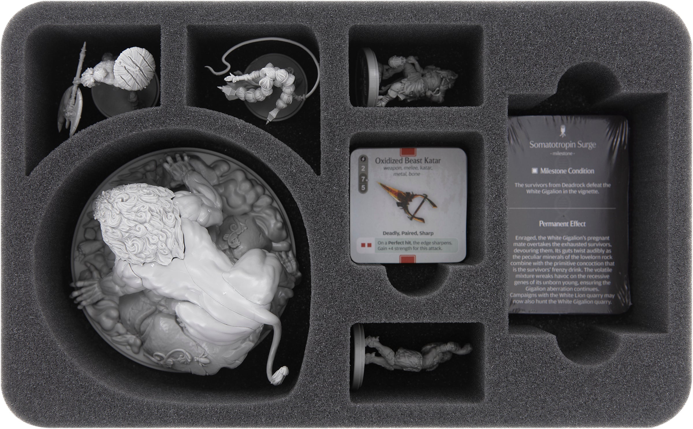 Adam Poots did it again: The miniatures of "Vignette of Death: White Gigalion" are among the best the board game market has to offer. White Gigalion and the four survivors are brimming with breath-taking, fantastic details. To make sure your exclusive models are still in the best of shapes in a few years to come, Feldherr has this custom cut insert for you.