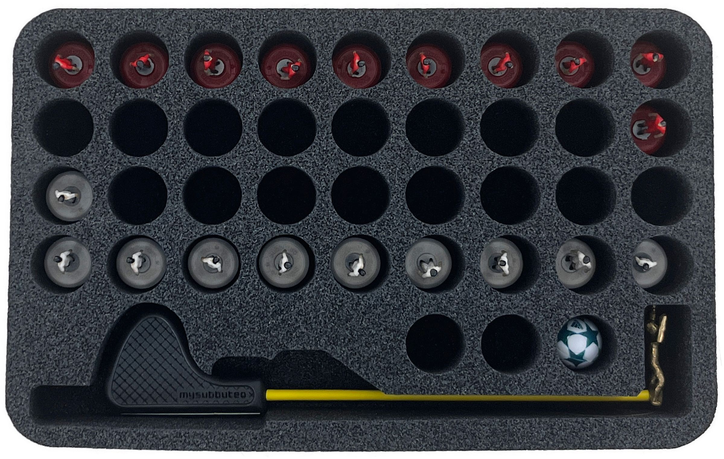 This Half-Size foam tray offers space for a total of three Subbuteo teams, each with 12 field players. In addition, there are 3 compartments for transporting balls or single players and a tailor-made compartment for your goalkeeper.