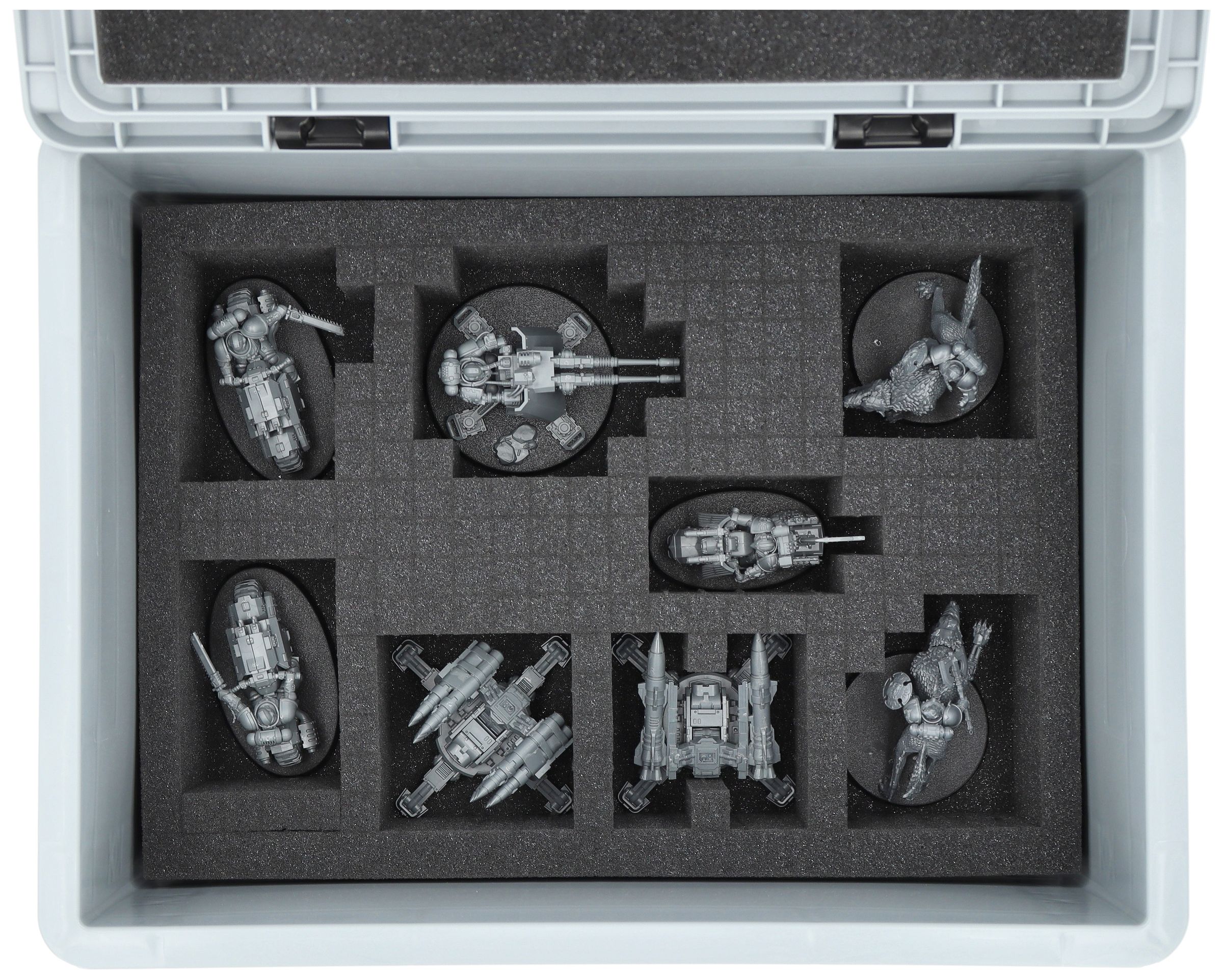 This Feldherr Eurobox set provides safe and organized storage for your entire tabletop army. Six precisely fitting foam inserts hold up to 192 miniatures, while the 60 mm high pick & pluck foam insert offers flexible storage for large or bulky models such as vehicles or monsters. Perfect for wargaming systems like Warhammer 40,000, Age of Sigmar, The Old World, Kill Team, BattleTech, Marvel Crisis Protocol, and Warcry.