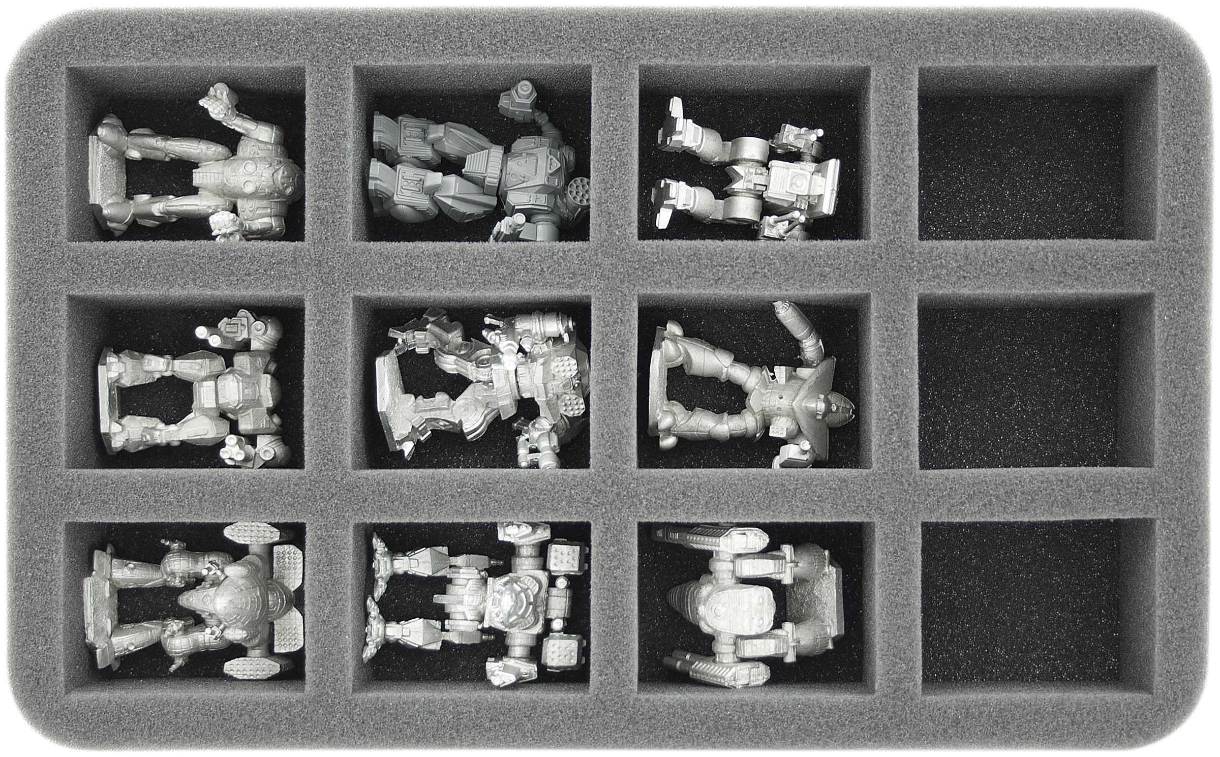 - 1 Half-Size foam tray with 12 compartments for miniatures (HS050I012BO)