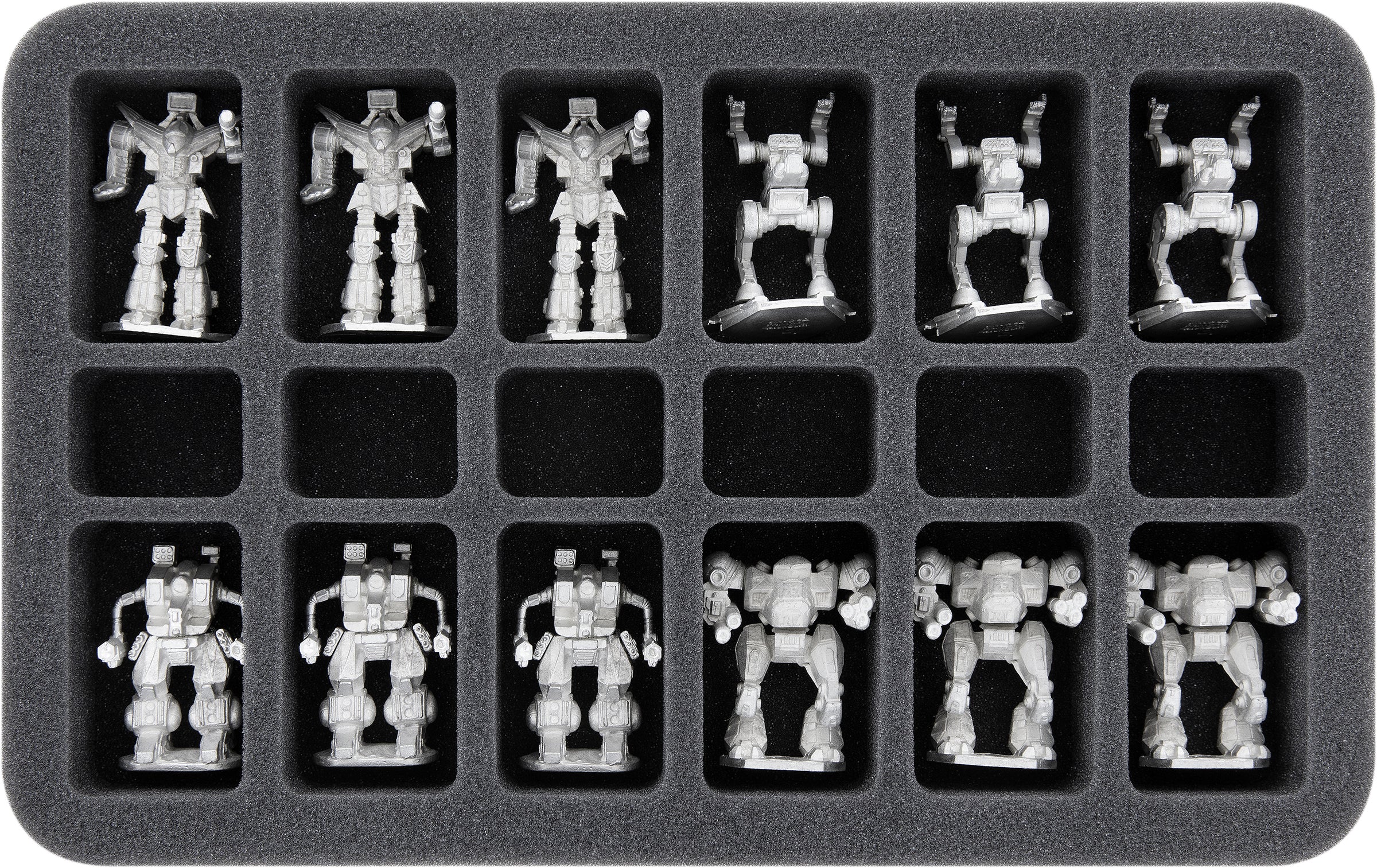 This foam tray with its 18 compartments is ideal for storing up to 12 of your BattleTech miniatures plus accessories or extra human infantry, clearly arranged and well protected.