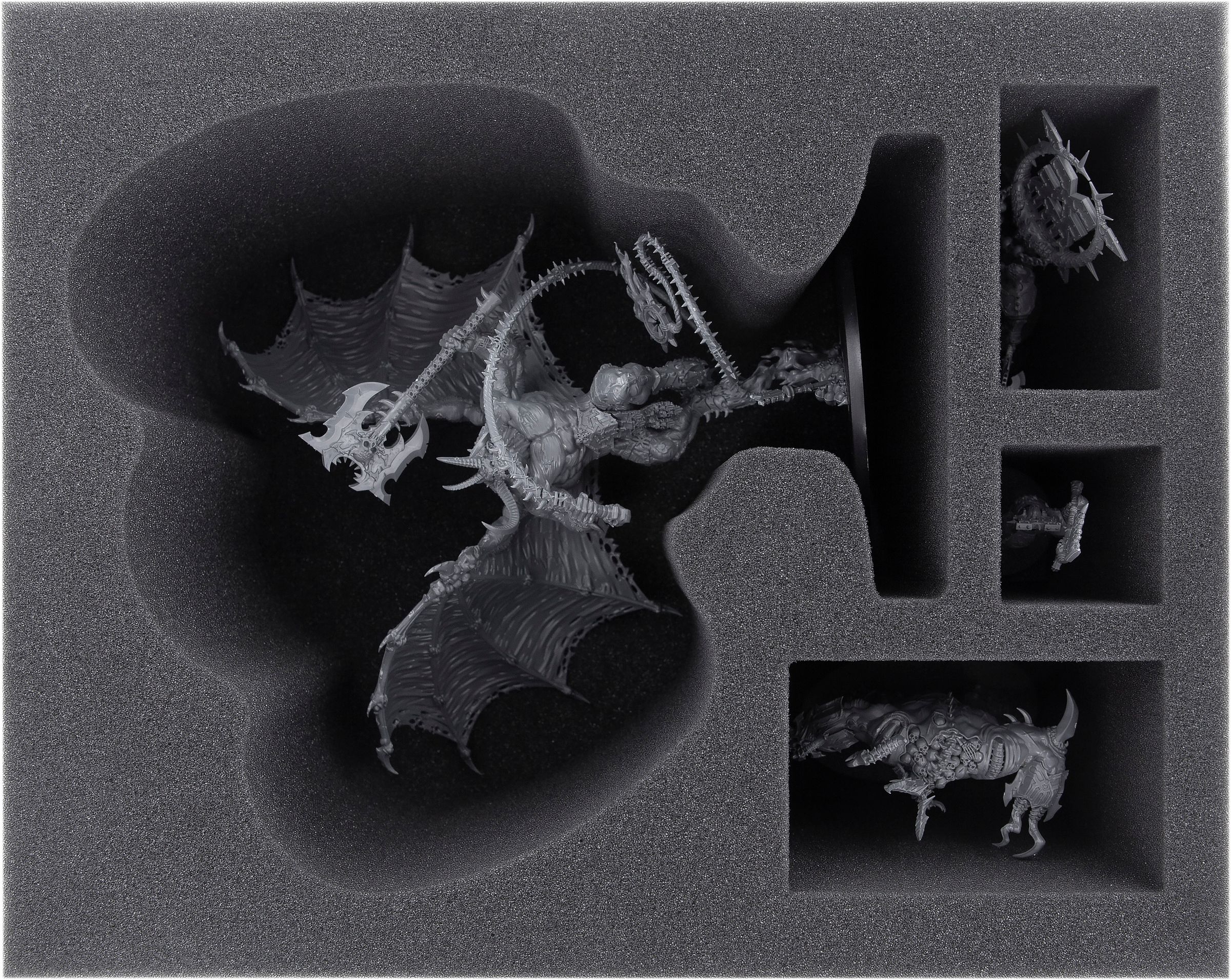 With a compartment tailored exactly to the miniature, it offers optimum protection for this fine detailed model. Not only the sensitive parts, such as the claw studded wings or his axe, are safe from damage. Thanks to the precise cut, the figure does not slip around during transport. Thus also the colors of the painted miniature remain unharmed.