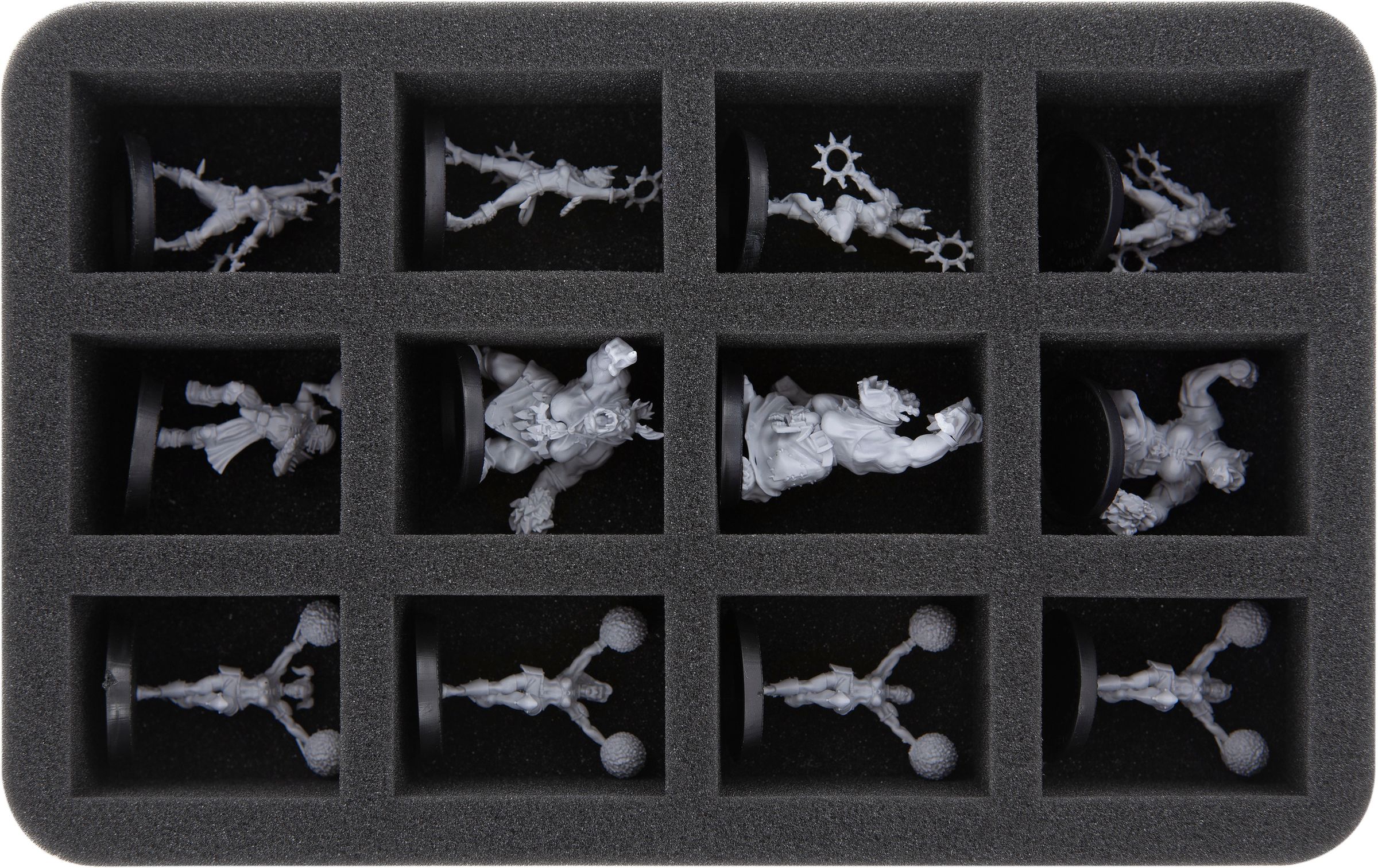 - 1 Half-Size foam tray with 12 compartments for standard figures on up to 40 mm bases like Reaverettes, the Waaghs!, Damned Damsels, and models with similar dimensions (HS050I012BO)