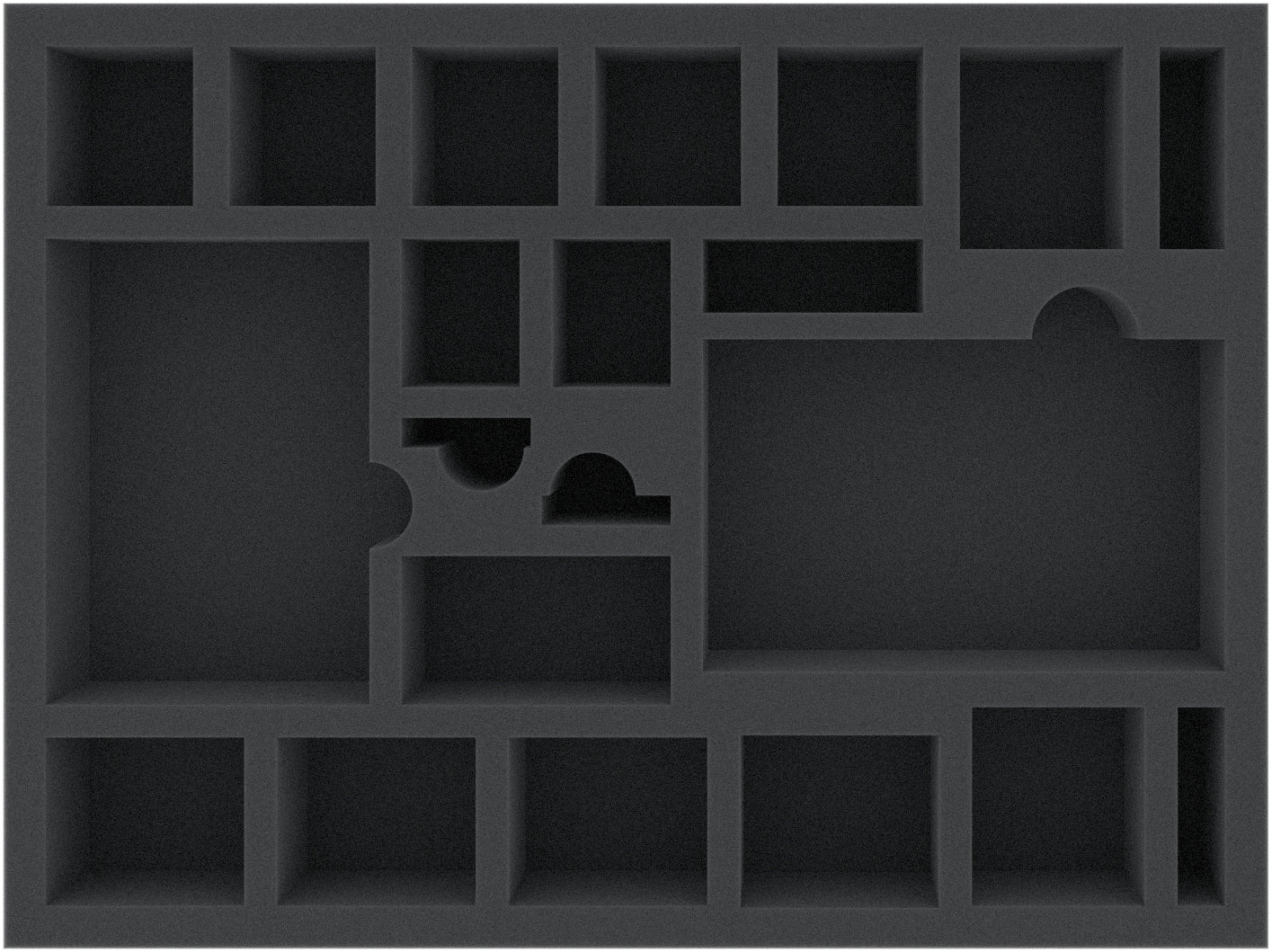 This 45 mm mm high foam tray is divided into 21 compartments. It is particularly suitable for the safe storage of tabletop and board game miniatures, as well as other fragile models and small parts.