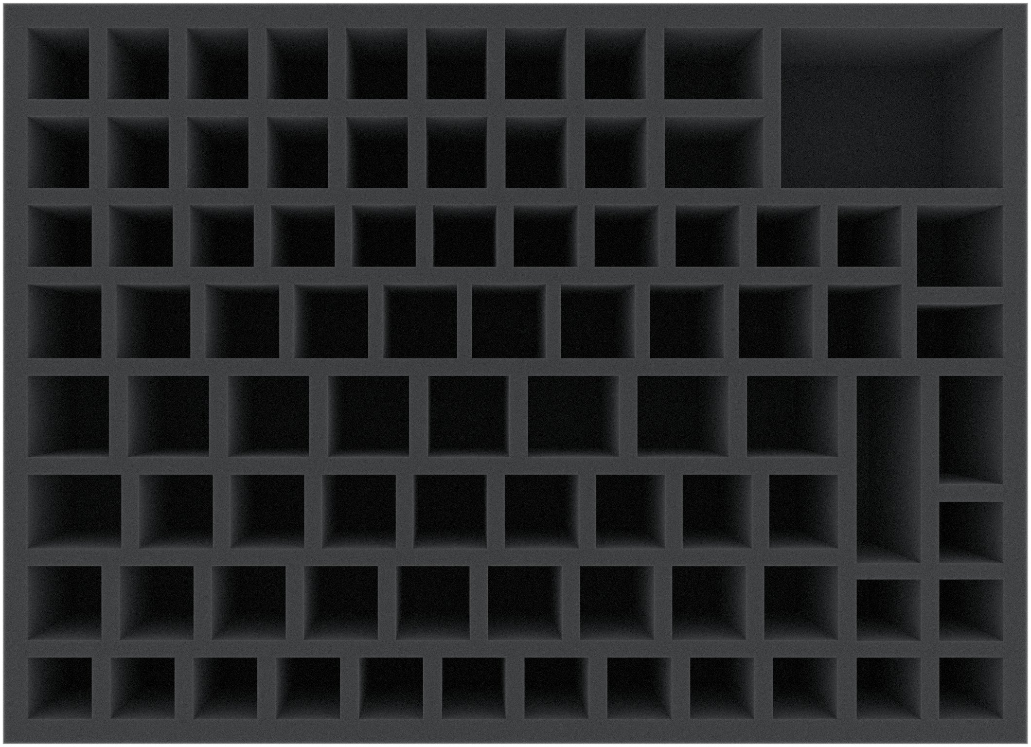 This 75 mm high foam tray is divided into 81 compartments. It is particularly suitable for the safe storage of tabletop and board game miniatures, as well as other fragile models and small parts.
