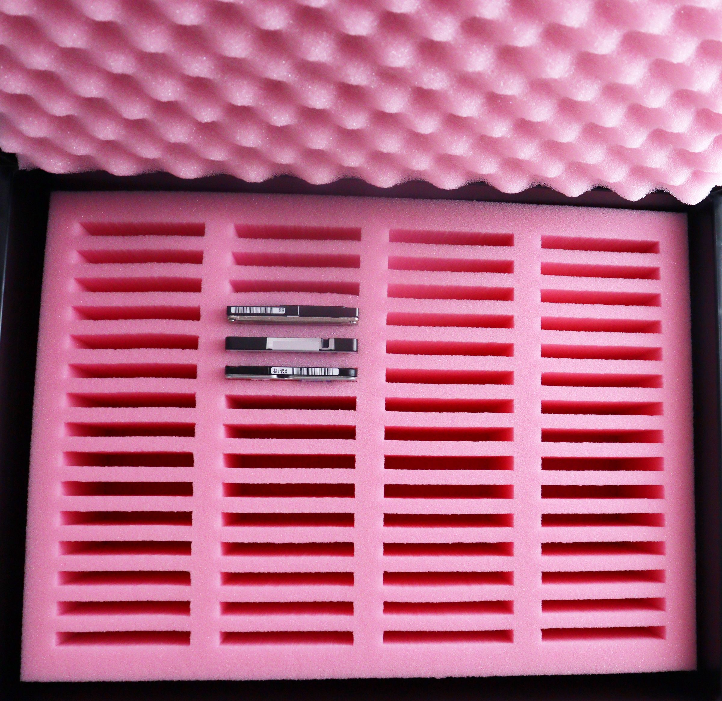Thoughtful full protection design: ESD foam insert with 60 cutouts, 2 foam bases (20mm each), ESD leveling base (10mm) and self-adhesive convoluted foam form a seamless protection system. Each component provides specialized protection against electrostatic discharge and mechanical impacts.