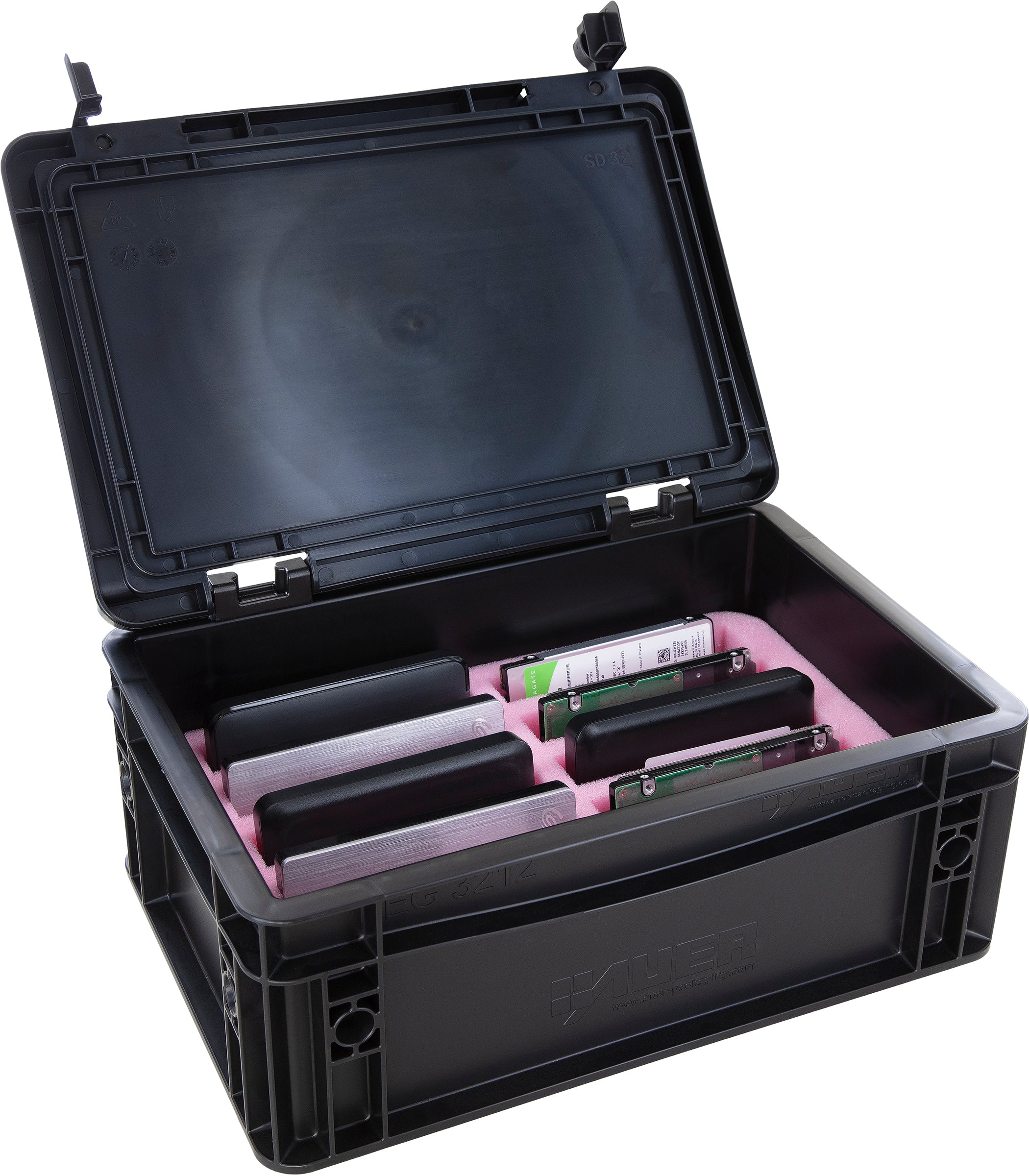 This professional ESD foam Eurobox provides certified protection against electrostatic discharge for up to 10 external 2.5-inch hard drives. Data loss from ESD is a thing of the past - our proven antistatic system with surface resistance of 10^10 to 10^11 Ohm ensures absolute protection of your critical data.