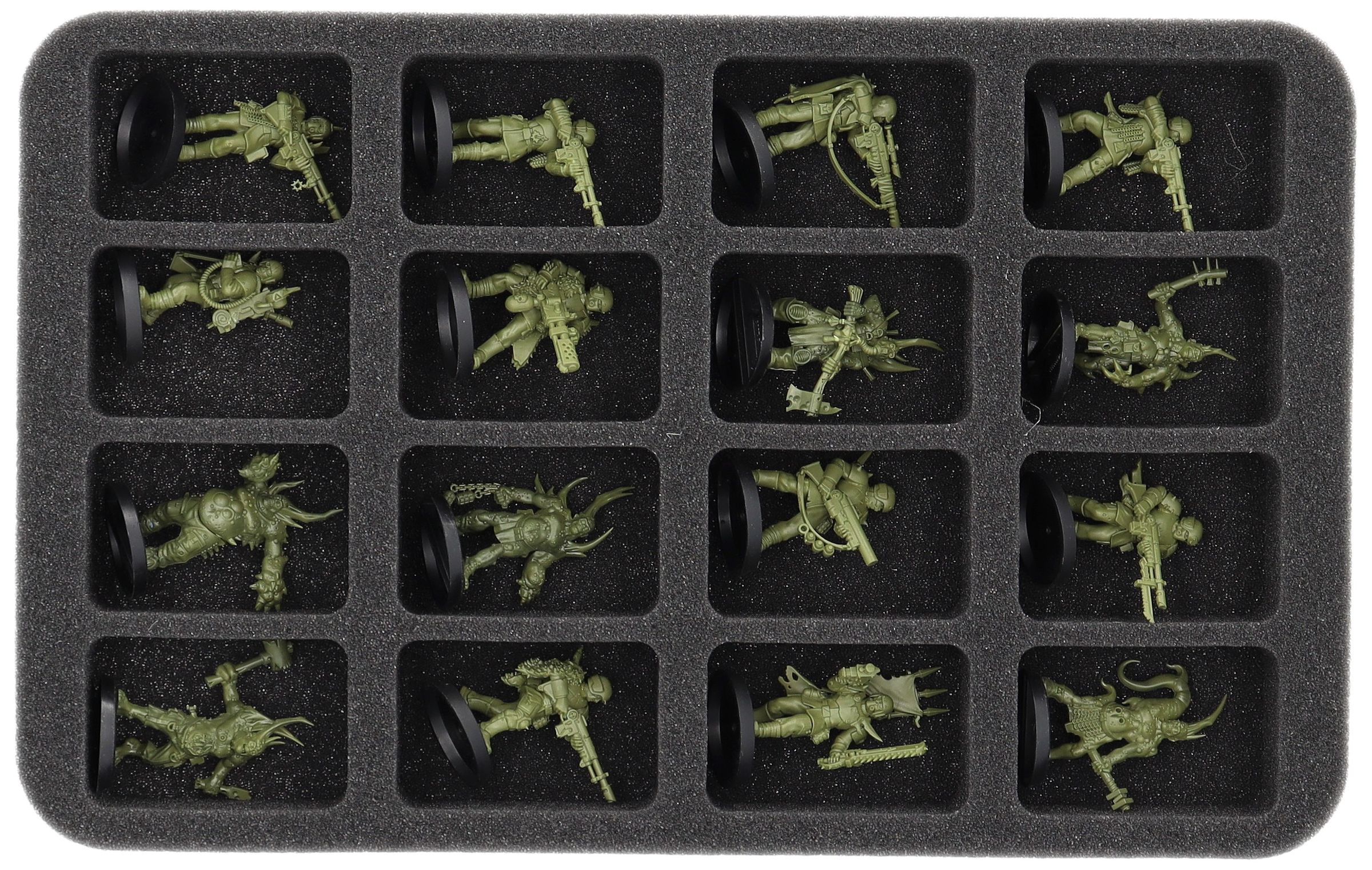 - 1 Half-Size foam tray with 16 compartments for miniatures like Pox Walkers, Traitor Guardsmen, and similarly sized miniatures (HS035BF05BO)
