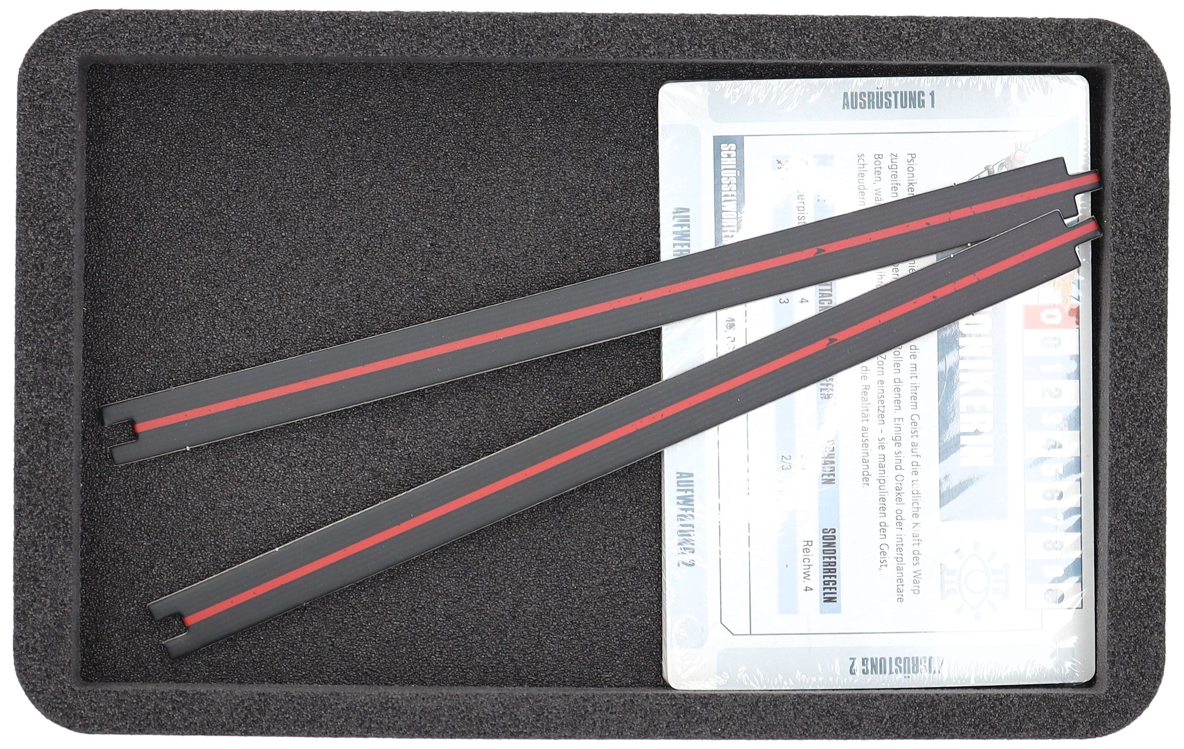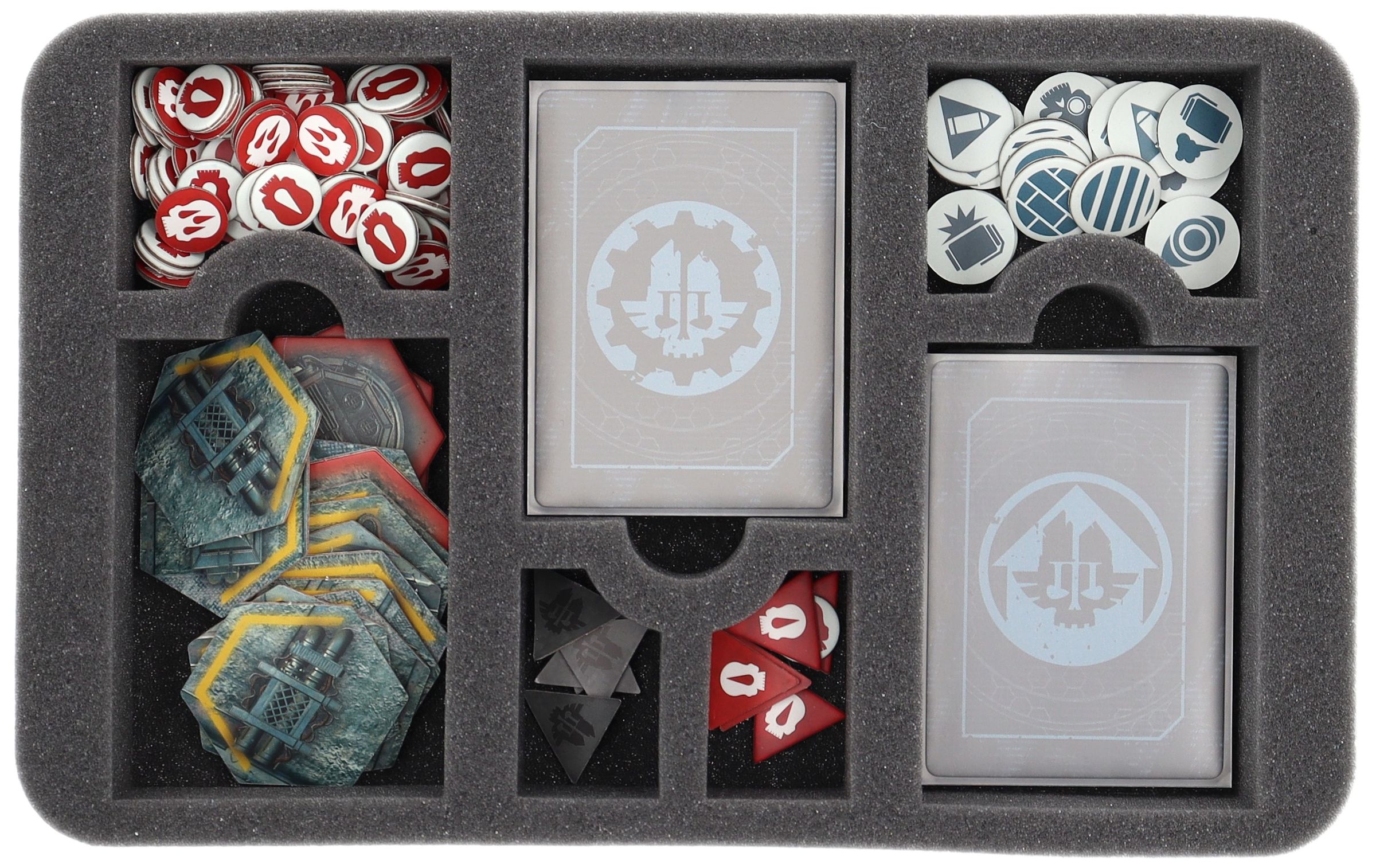 - 1 Half-Size foam tray with 7 compartments for game materials like cards in the format 63 mm x 88 mm (Standard Card Game Size), tokens, and dice (HSMEQO050BO)