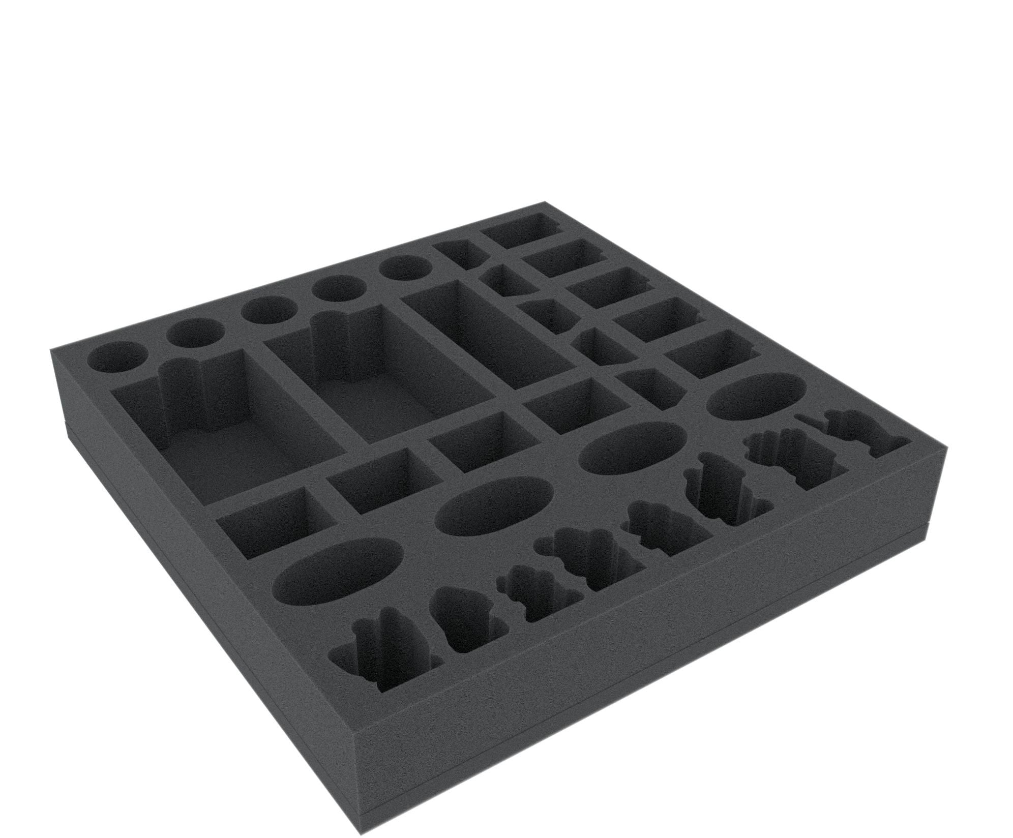 The Feldherr foam tray has the dimensions: 285 mm x 285 mm x 40 mm height. The 40 mm depth of the foam is result from 10 mm foam base and slot foam tray with 30 mm effective depth