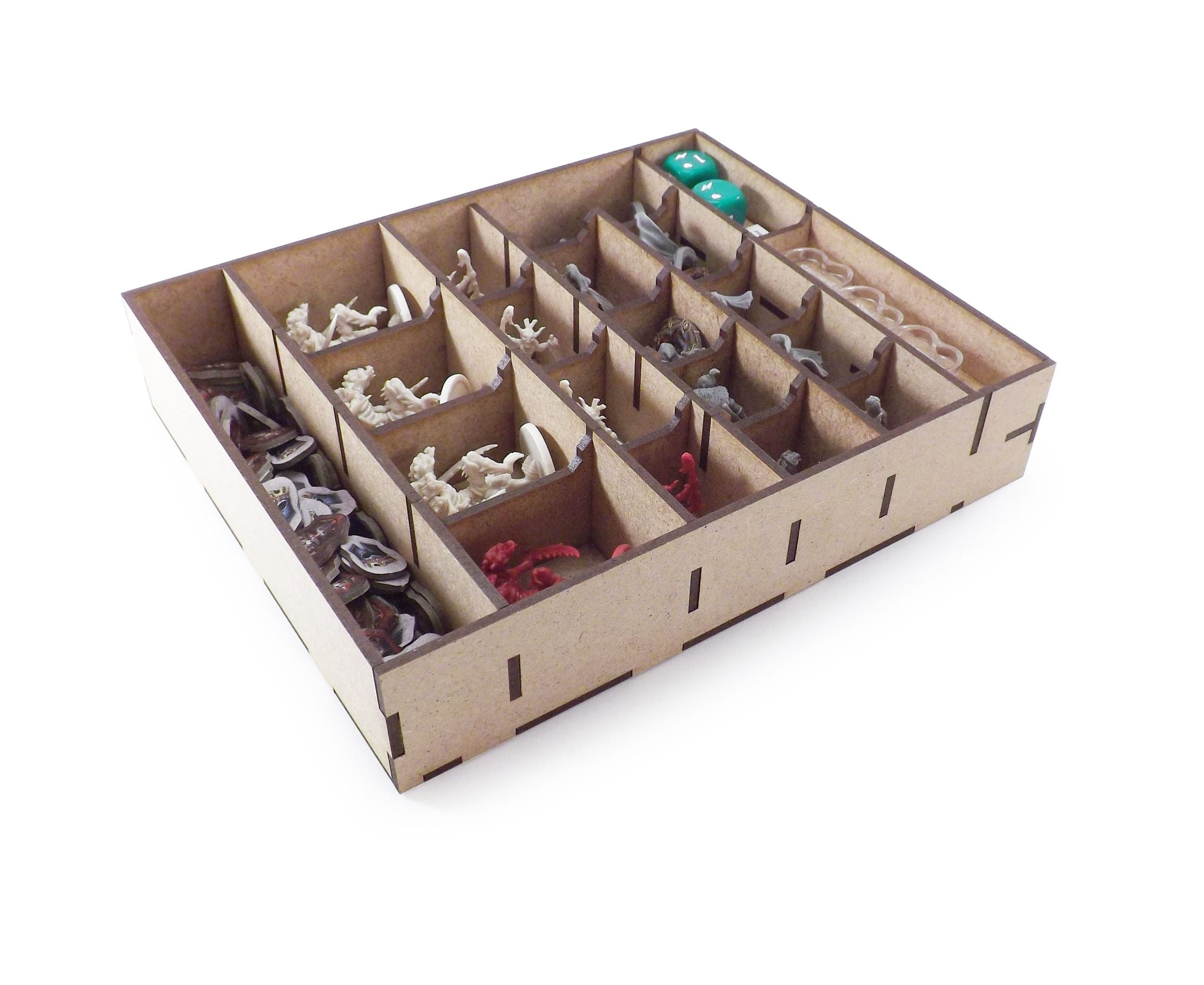 To bring the epic struggle between brave heroes and evil overlord to the table, the game comes with a wealth of map tiles, monsters, dice, doors, tokens and cards. Our insert sorts and groups all these components for an orderly descent into the next dungeon.
