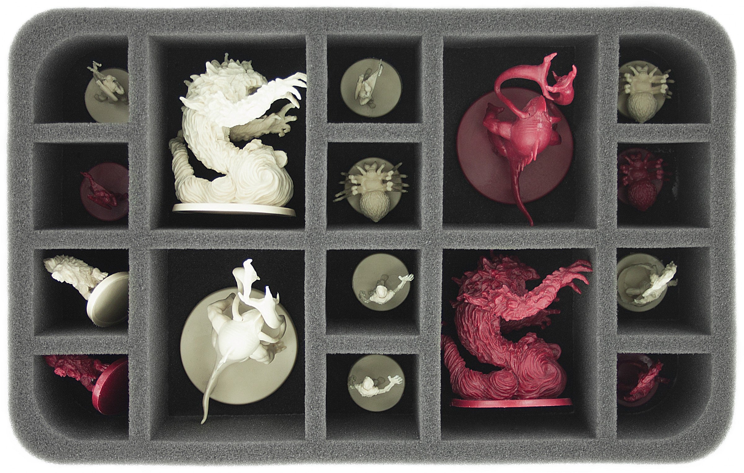 Tailor-made foam trays prevent the figures from slipping or colliding. Colors of painted miniatures do not flake off. Sensitive parts such as swords, claws or wings are protected from bending or breaking.