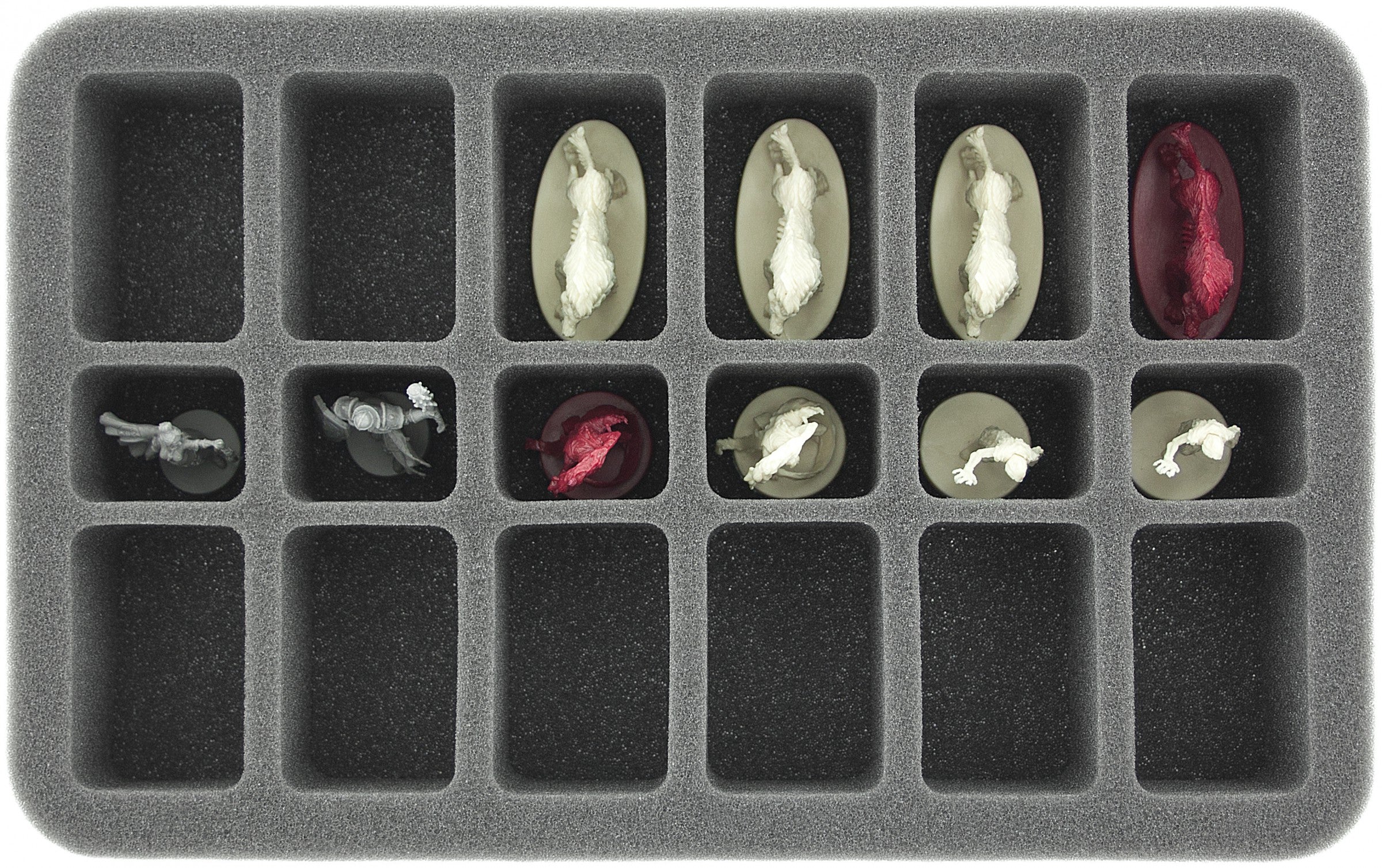 One Half-size foam tray with 20 conical compartments. Here 20 heroes, monsters or lieutenants can be clearly stored horizontally.