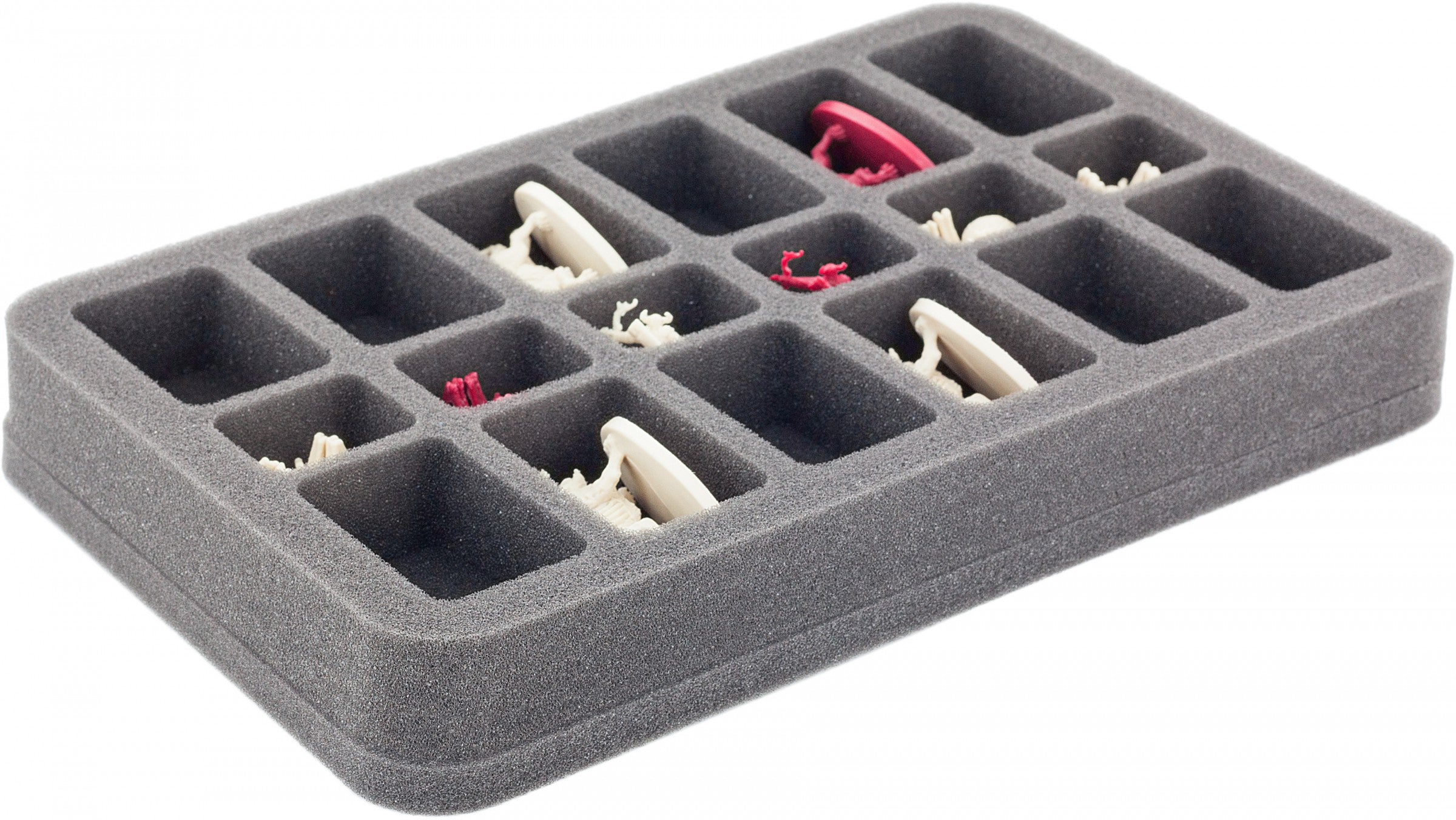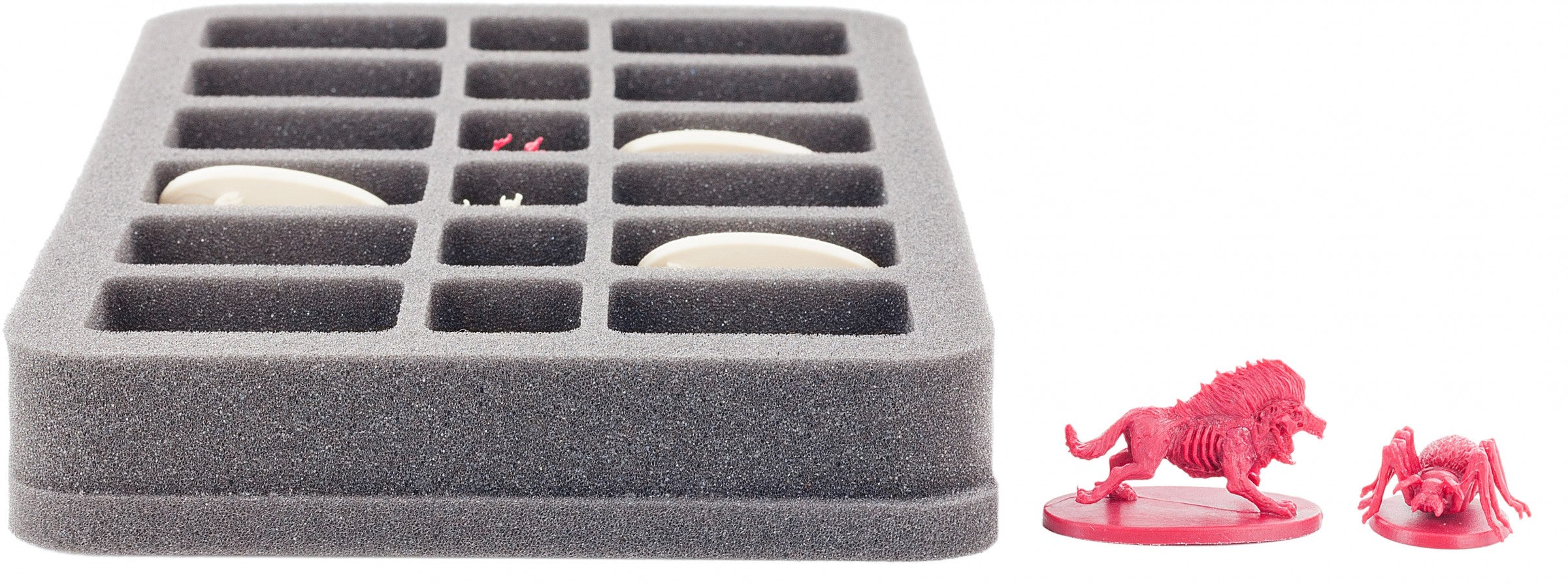 E' diviso in 18 scomparti. 12 di loro misurano 54 mm x 35 mm x 25 mm di altezza e sono ideali per le miniature Descent con base allungata, come le Barghests. Al centro ci sono altri sei scomparti di 27 mm x 35 mm della stessa altezza. I Goblin Archers e Cave Spiders, per esempio, si sentiranno a proprio agio qui dentro. La base in schiuma di 10 mm di spessore protegge le miniature dal basso. Questo riassume il vassoio fino ad un'altezza totale di 35 mm.
