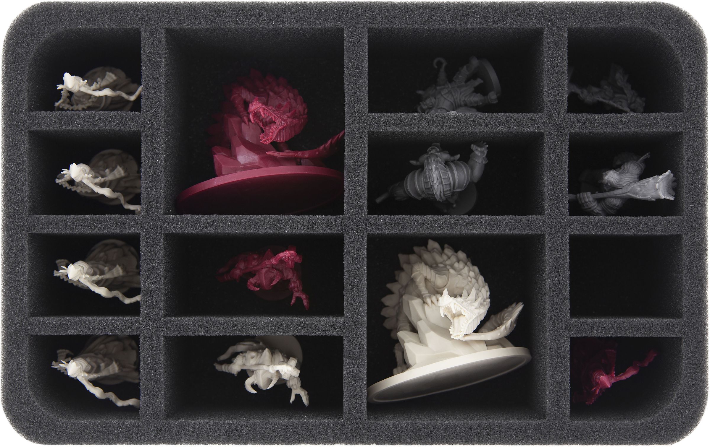 The foam tray provides a safe shelter for all miniatures from the expansion. The two tall Ice Wyrms will get the big compartments. The two Dark Minotaurs, as well as the heroes One Fist and Steelhorns fit into the medium-sized ones. The five Shades and the heroes Karnon and Arvel Worldwalker are distributed into the smaller compartments. The miniature-precise cutting prevents the figures from slipping around and colliding during transport. This will protect painted figures from abrasion. Sensitive details, such as the claws and cloth of the Shades, also remain undamaged.