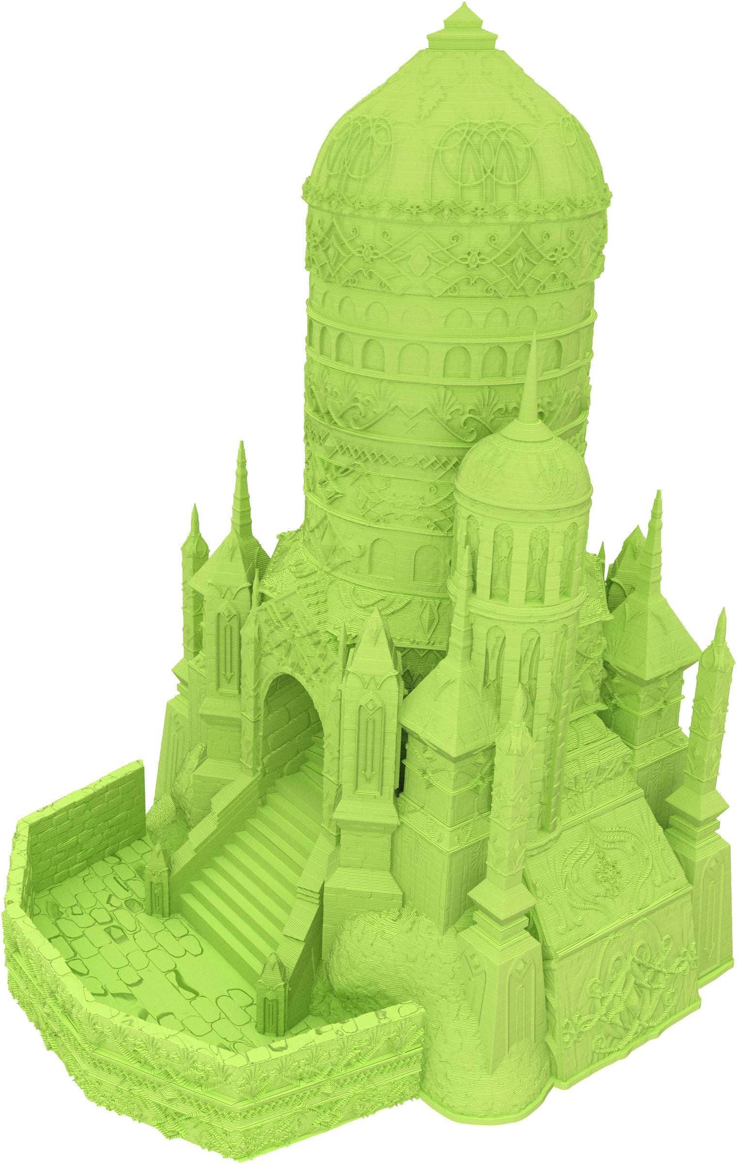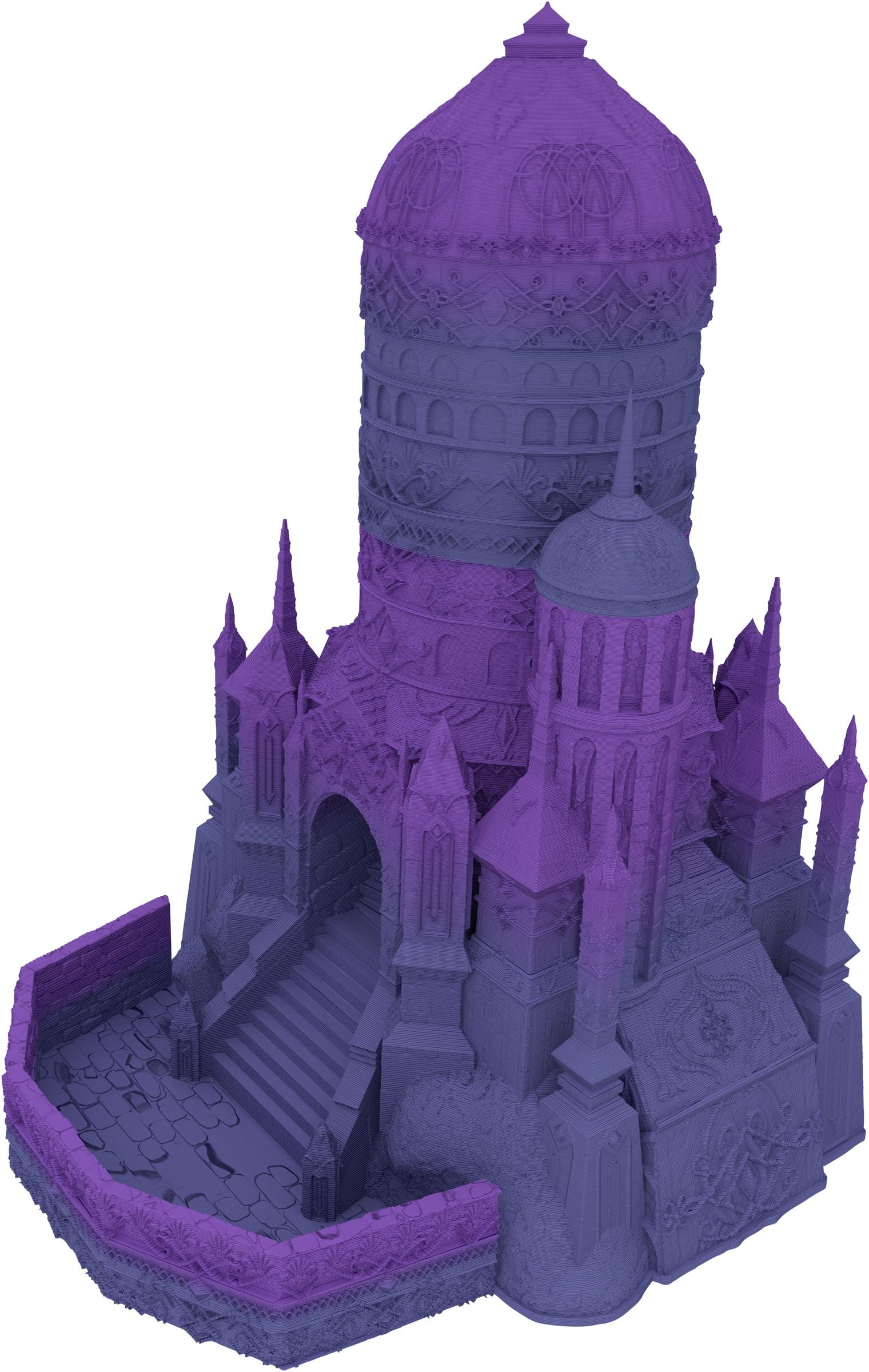 3D printed - detailed dice tower, with removable roof and exchangeable dice tray. The Dice Tower can also be used as a terrain part for your miniatures game or as a center piece for your next DnD session.