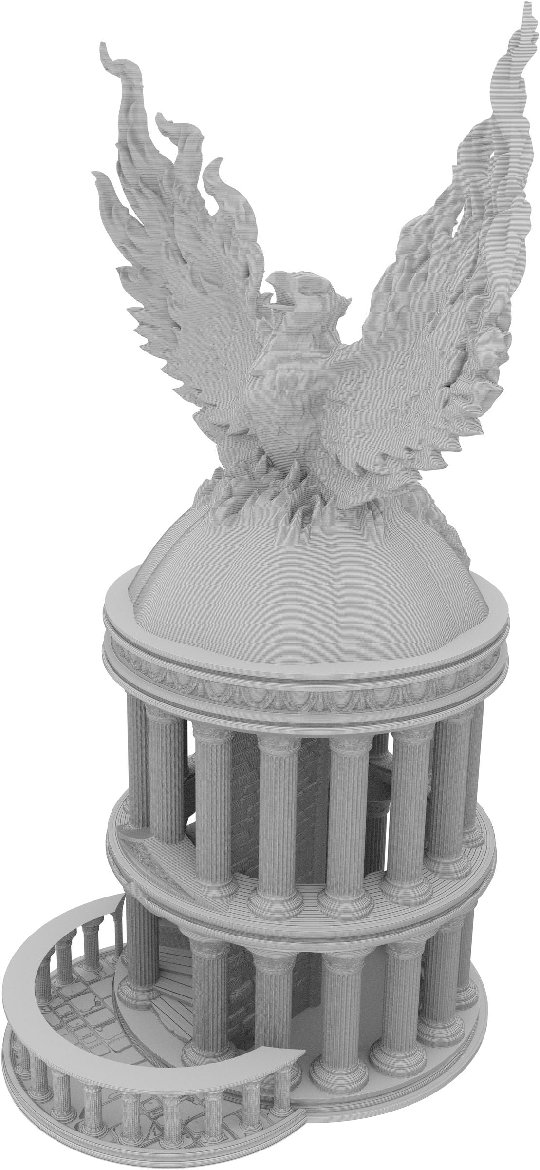 3D printed - detailed dice tower, with removable roof and exchangeable dice tray. The Dice Tower can also be used as a terrain part for your miniatures game or as a center piece for your next DnD session.