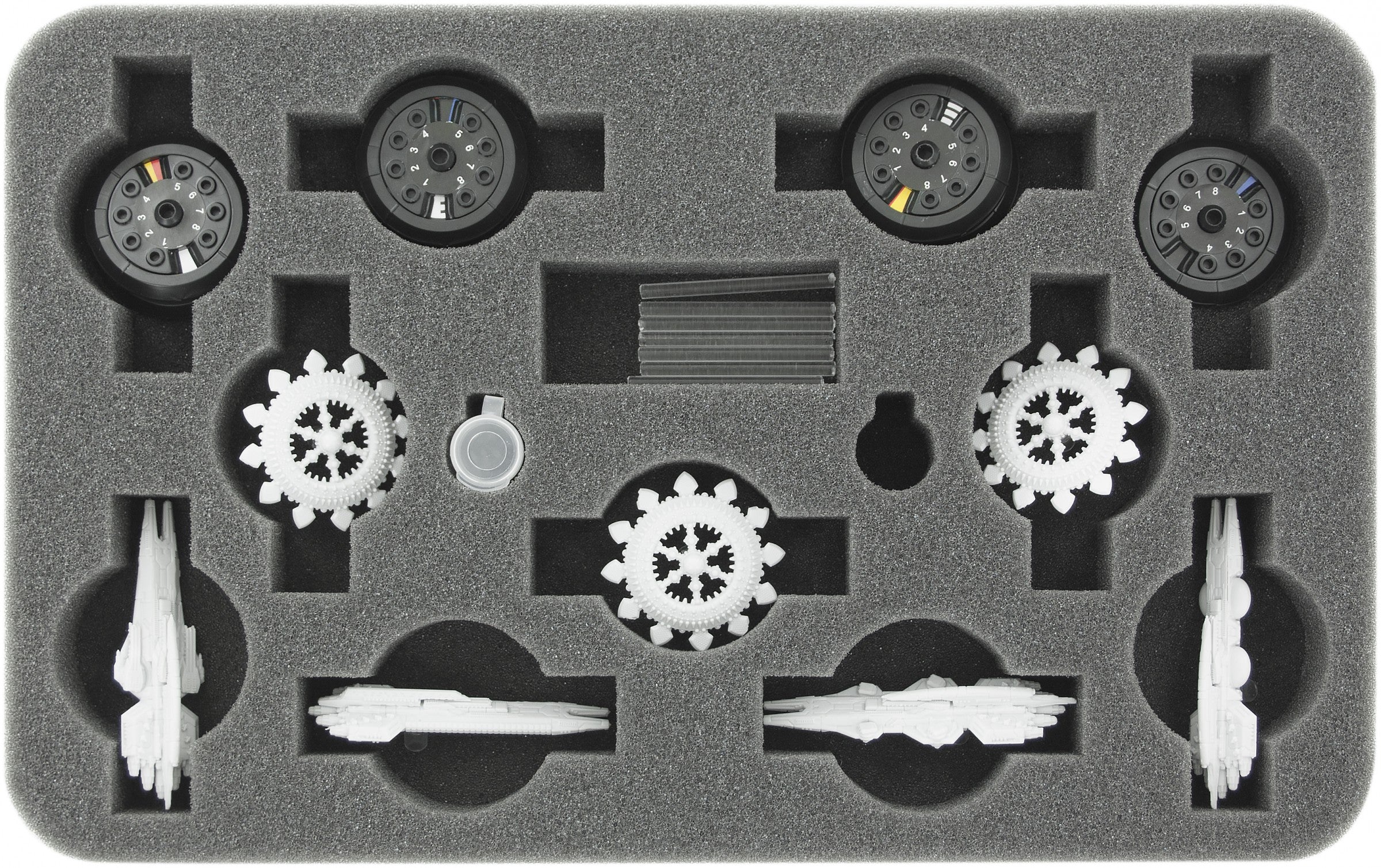 The foam tray provides space for up to 11 UCM Frigates or Shaltari Voidgates. On the tray there are 3 additional compartments for playing material. In addition a FREE capsule for the damage pegs included!