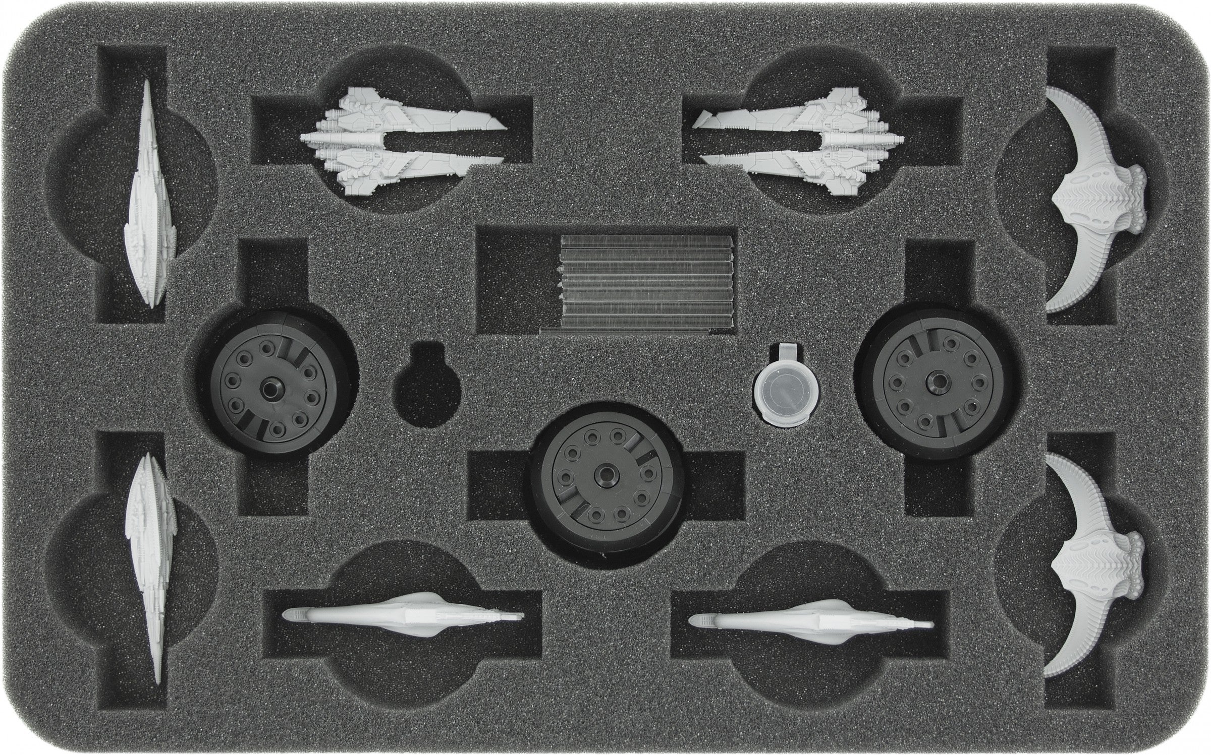 The foam tray provides space for up to 11 corvettes. On the tray there are 3 additional compartments for playing material. In addition a FREE capsule for the damage pegs included!
