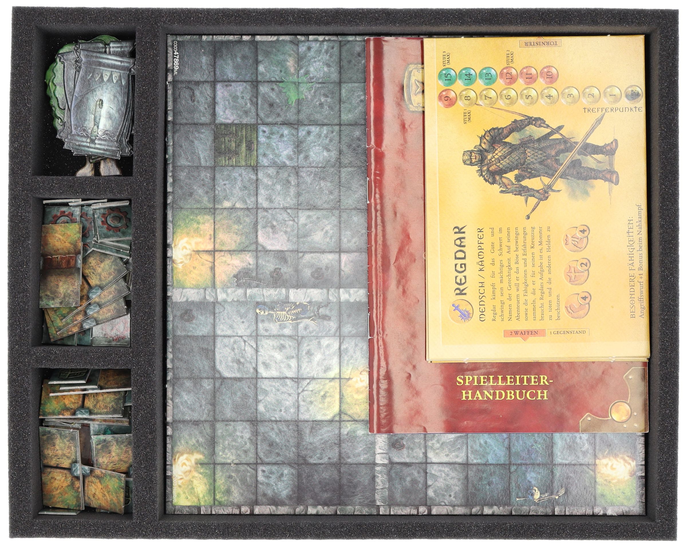 - 1 Half-Size foam tray with 7 compartments for game material like dice, tokens and game cards (HSMEQO050BO)