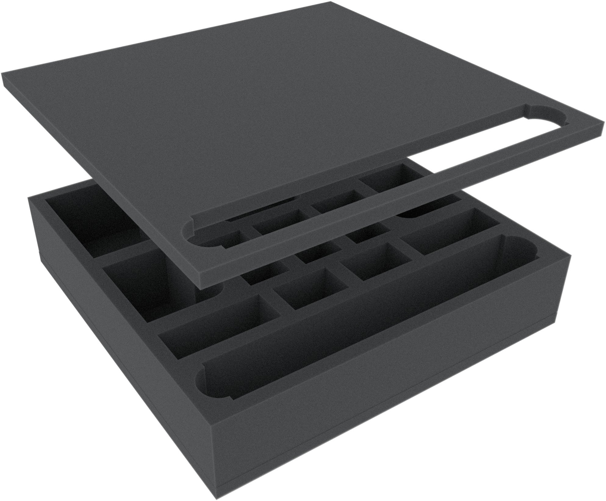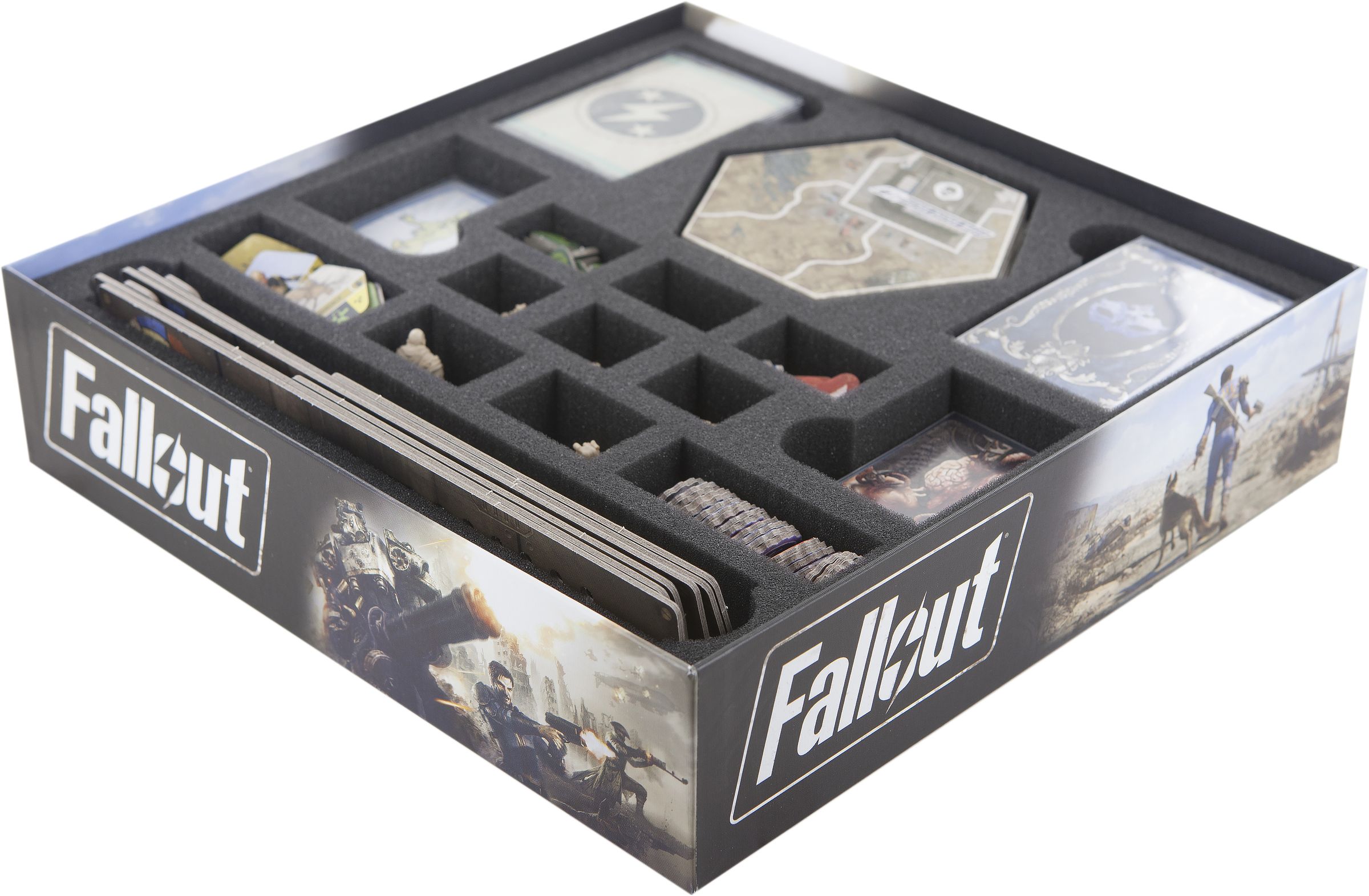 This foam tray is especially designed for Fallout. You can protect and transport your material of the original Fallout game box with this foam tray. In the 16 compartments you can stow your Fallout figures, the different cards in sleeves, tokens and dice in shaped cut outs. The mat fits in the original game box.