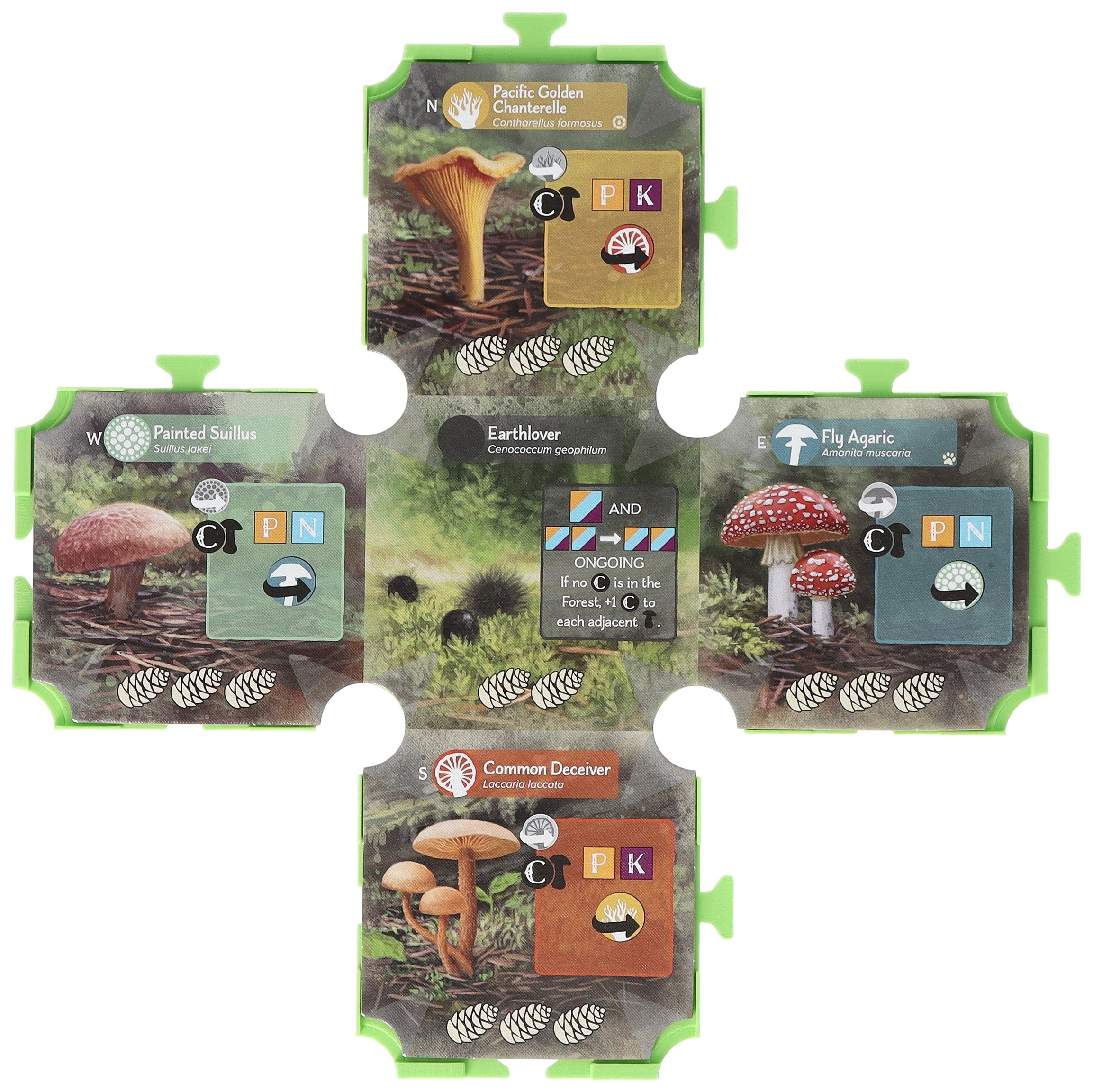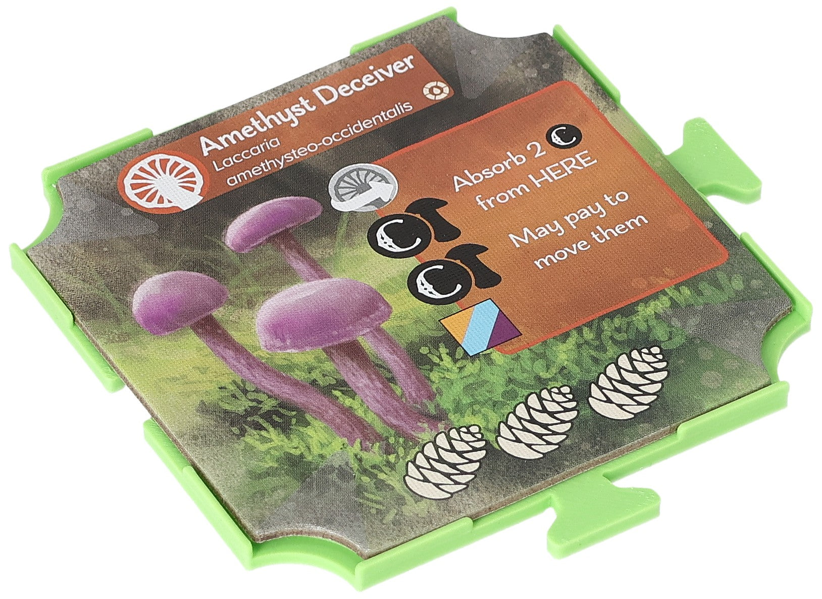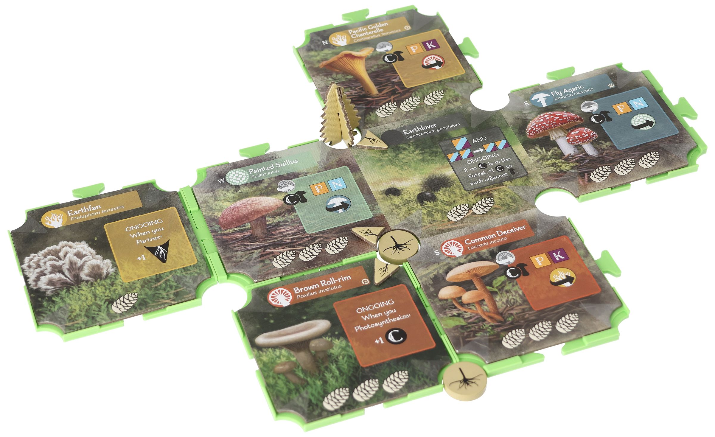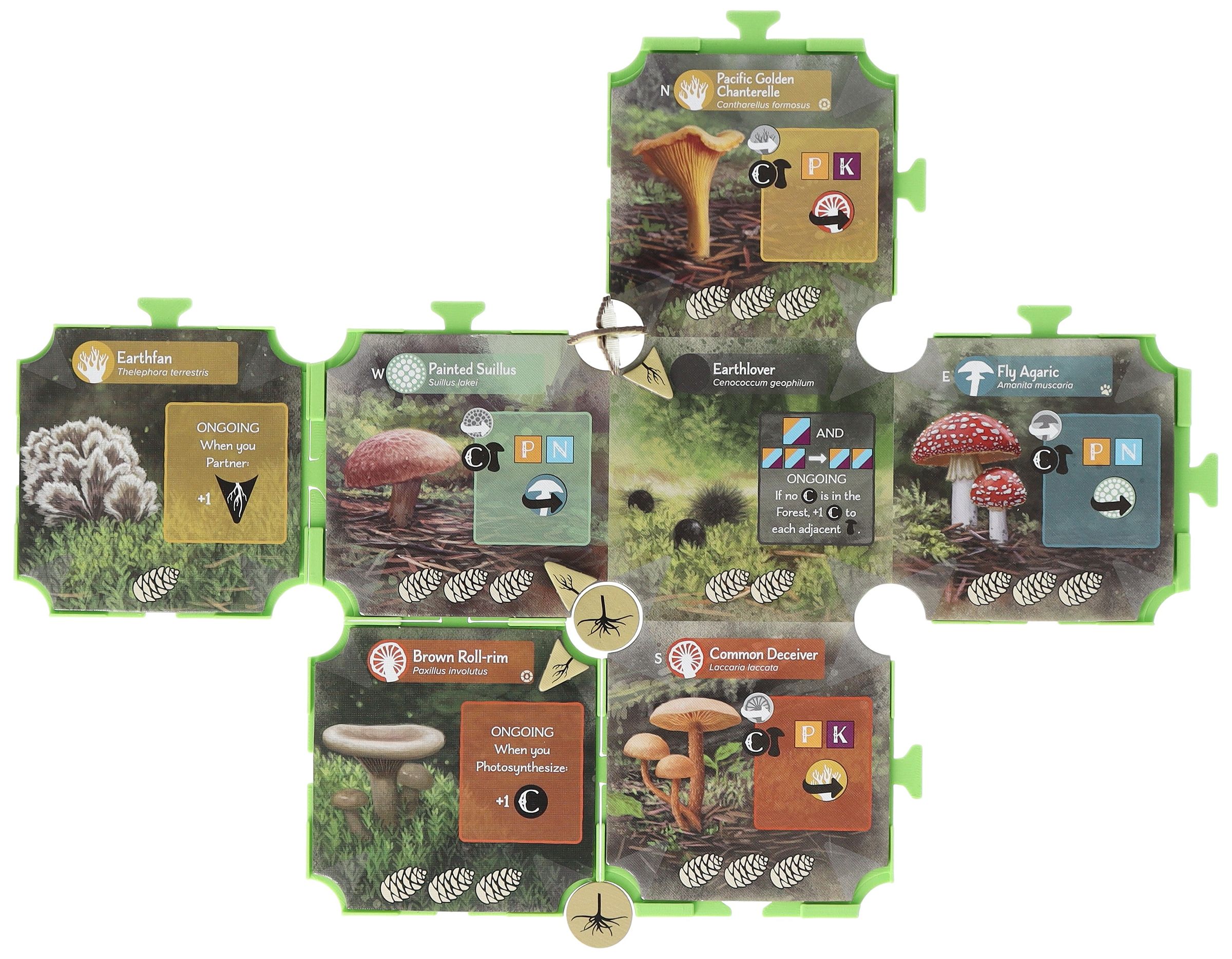 - With round cutouts: Provides space for storing Tree and Seedling Tokens between the Mushroom Tiles.