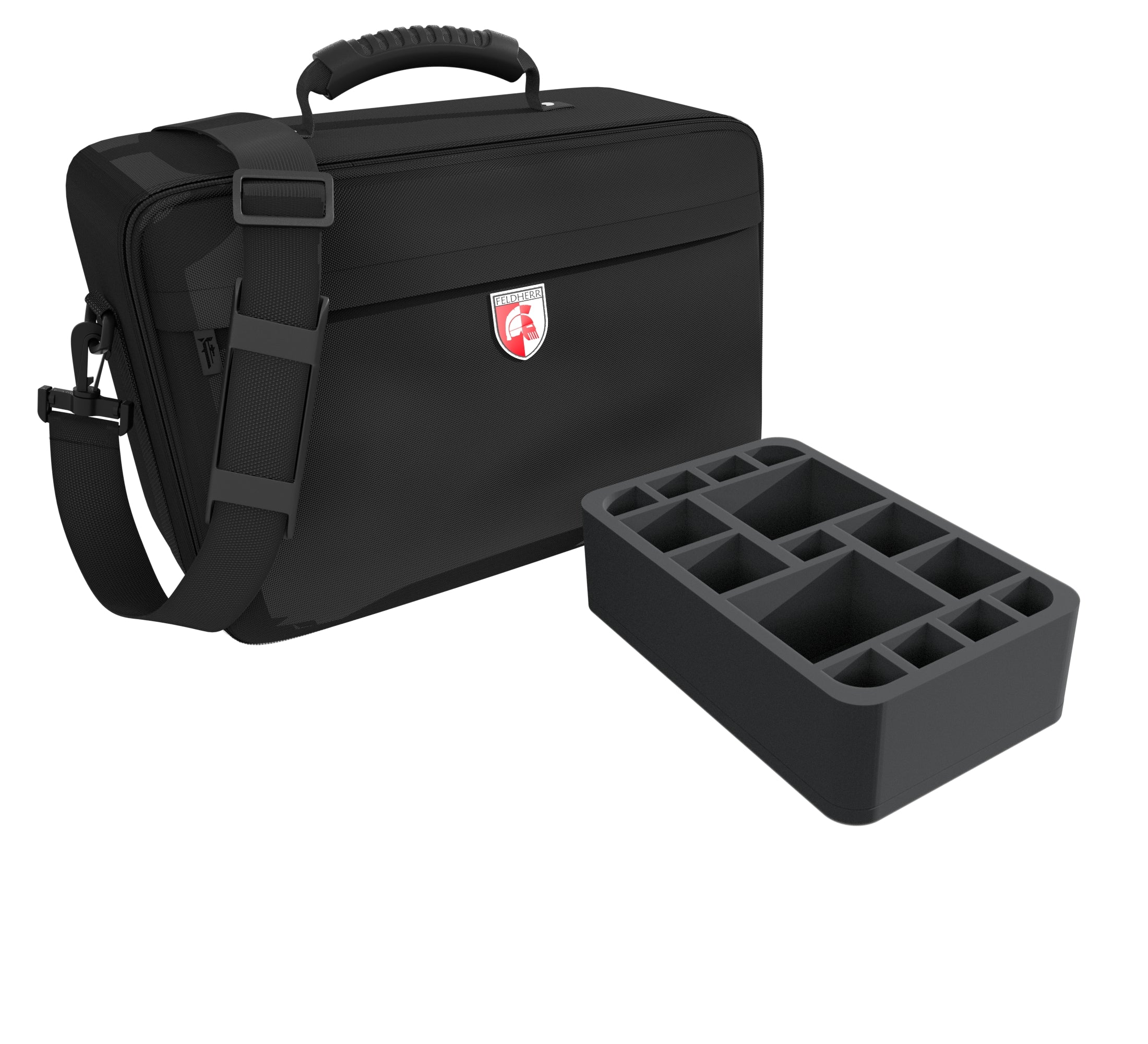 The black Feldherr MAXI bag is made of particularly hard-wearing fabric. Padded side panels and a reinforced base additionally ensure that the contents are optimally protected from external influences even when transported by car or train. Next to the large main compartment, the bag has a smaller pocket with a zipper at the front, e.g. for booklets. There is a rubberized, easy-grip carrying handle on the top. If you prefer to keep your hands free, you can also use the bag as a shoulder bag thanks to the removable shoulder strap.