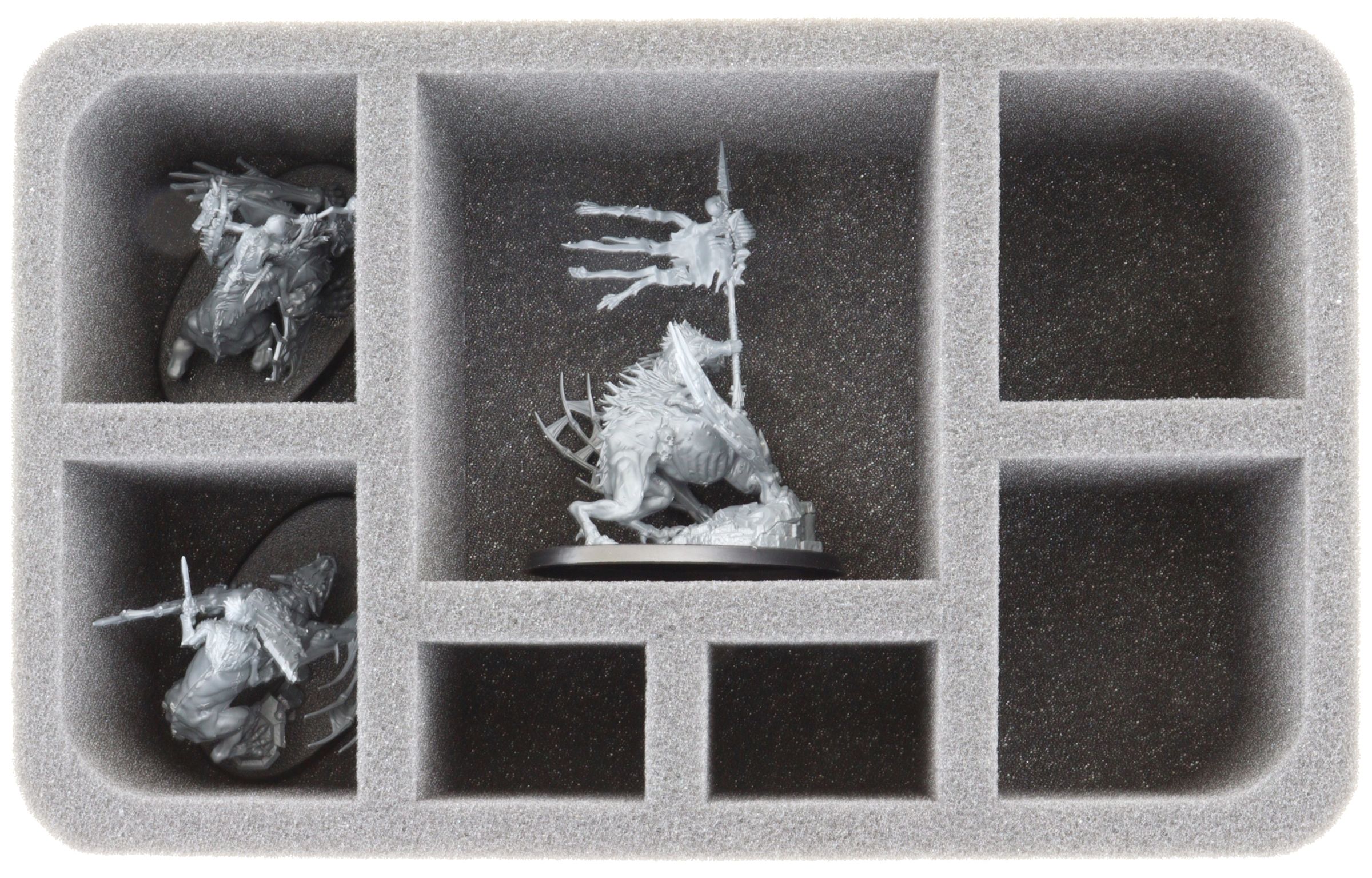 On this Feldherr foam tray, you have space for a total of 7 miniatures from your Flesh-eater Courts army. The large compartments are ideal for storing cavalry units like Morbheg Knights.