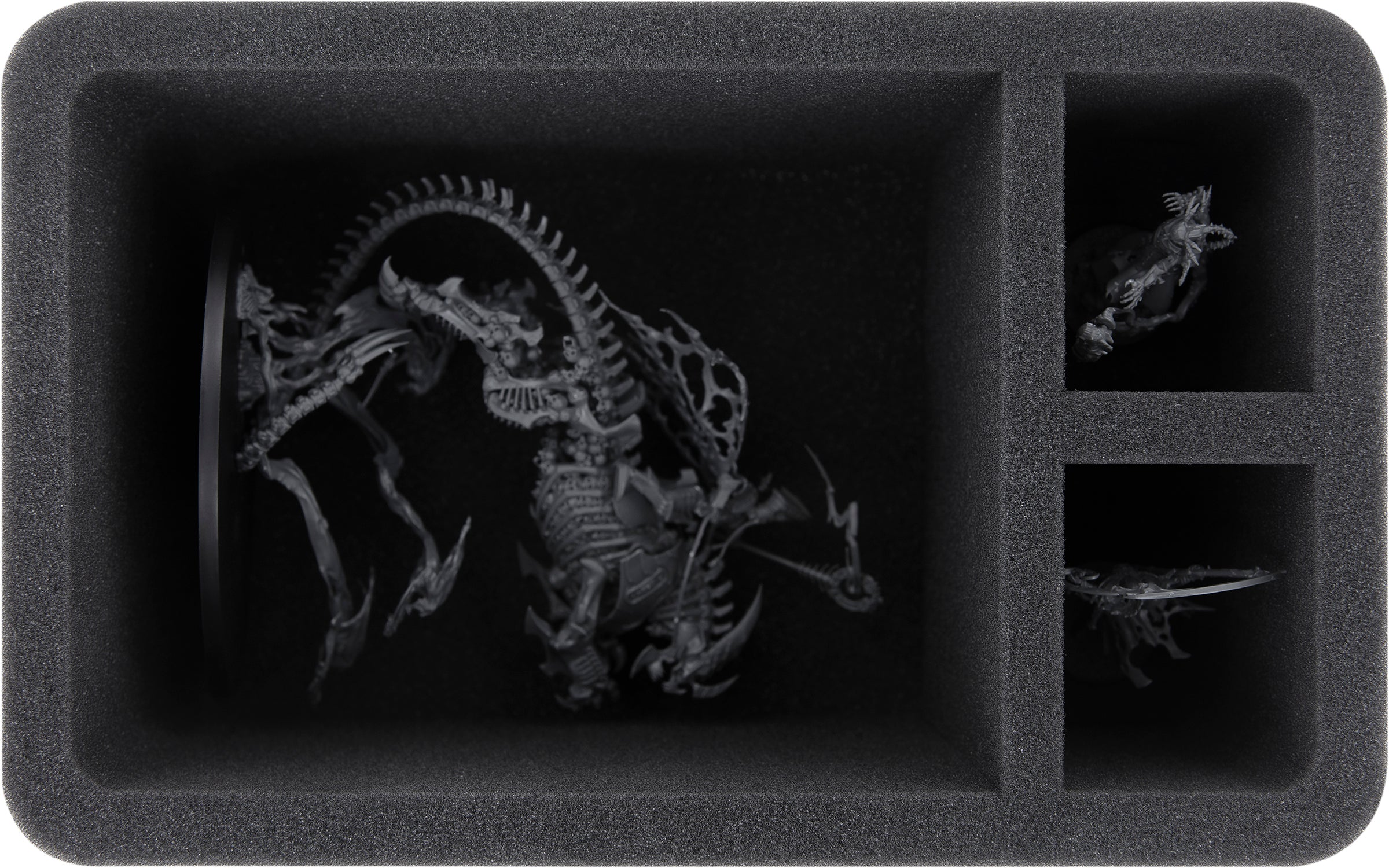 A large compartment is tailor-made for one miniature of the Mortach. In the custom-cut compartment made of soft foam, not only the many filigree details are well protected from damage. Also the colors of the painted miniature remain free from scratches and Abrasion.