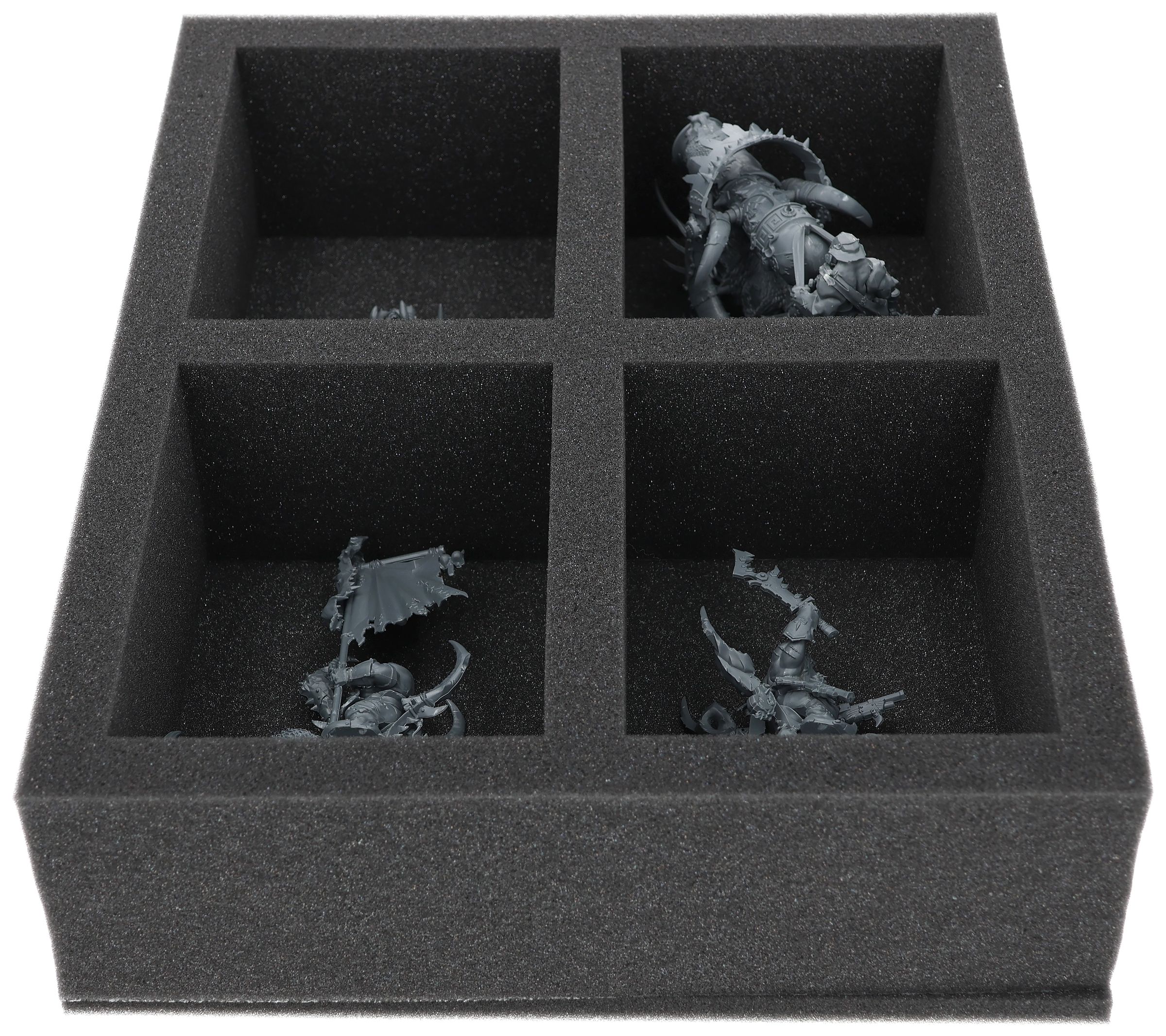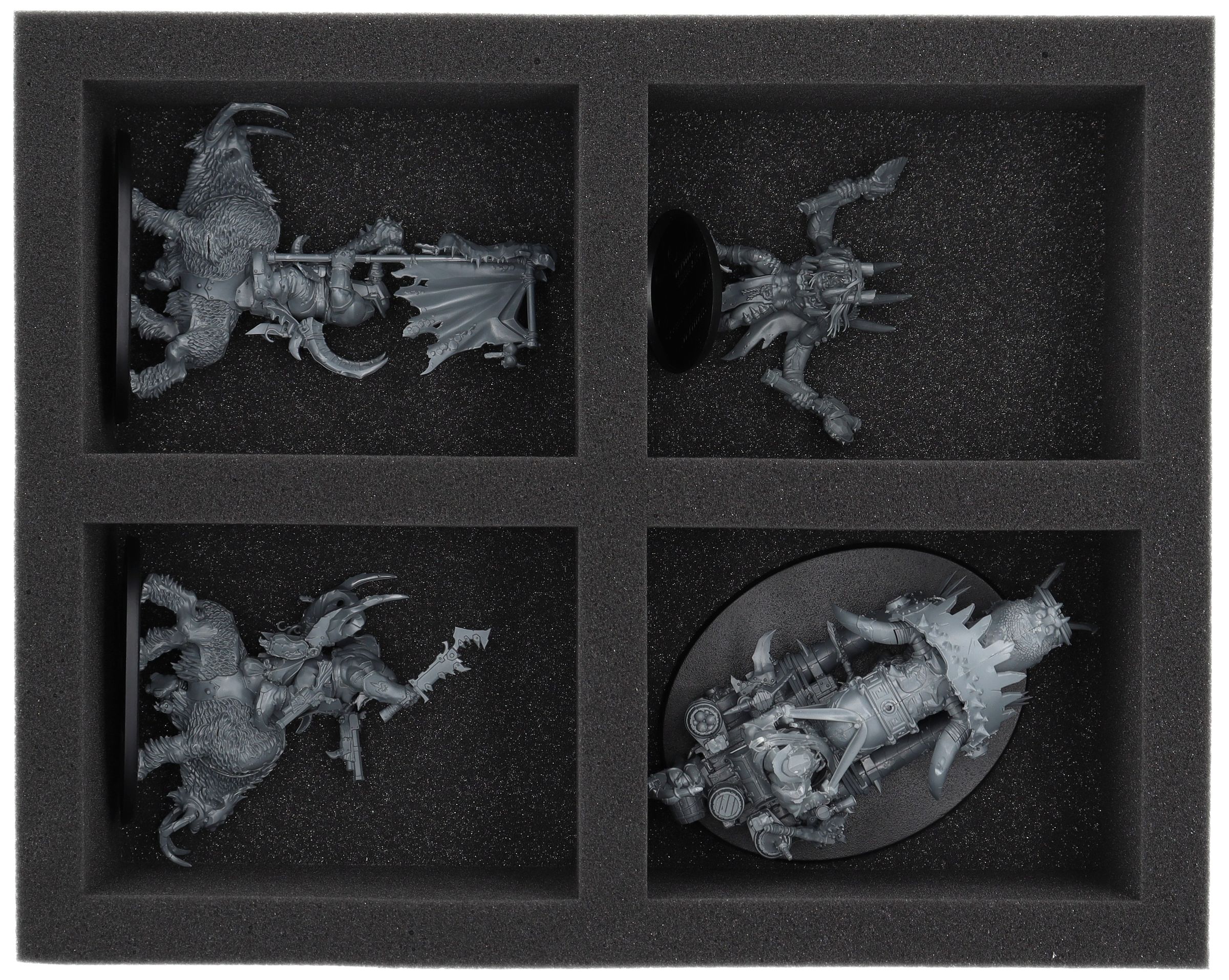 On this Feldherr foam tray you have space for up to 4 miniatures of your army. The insert is especially suitable for storing the Ironblaster, Gnoblar Scraplauncher, Mournfang Riders and similar sized models.