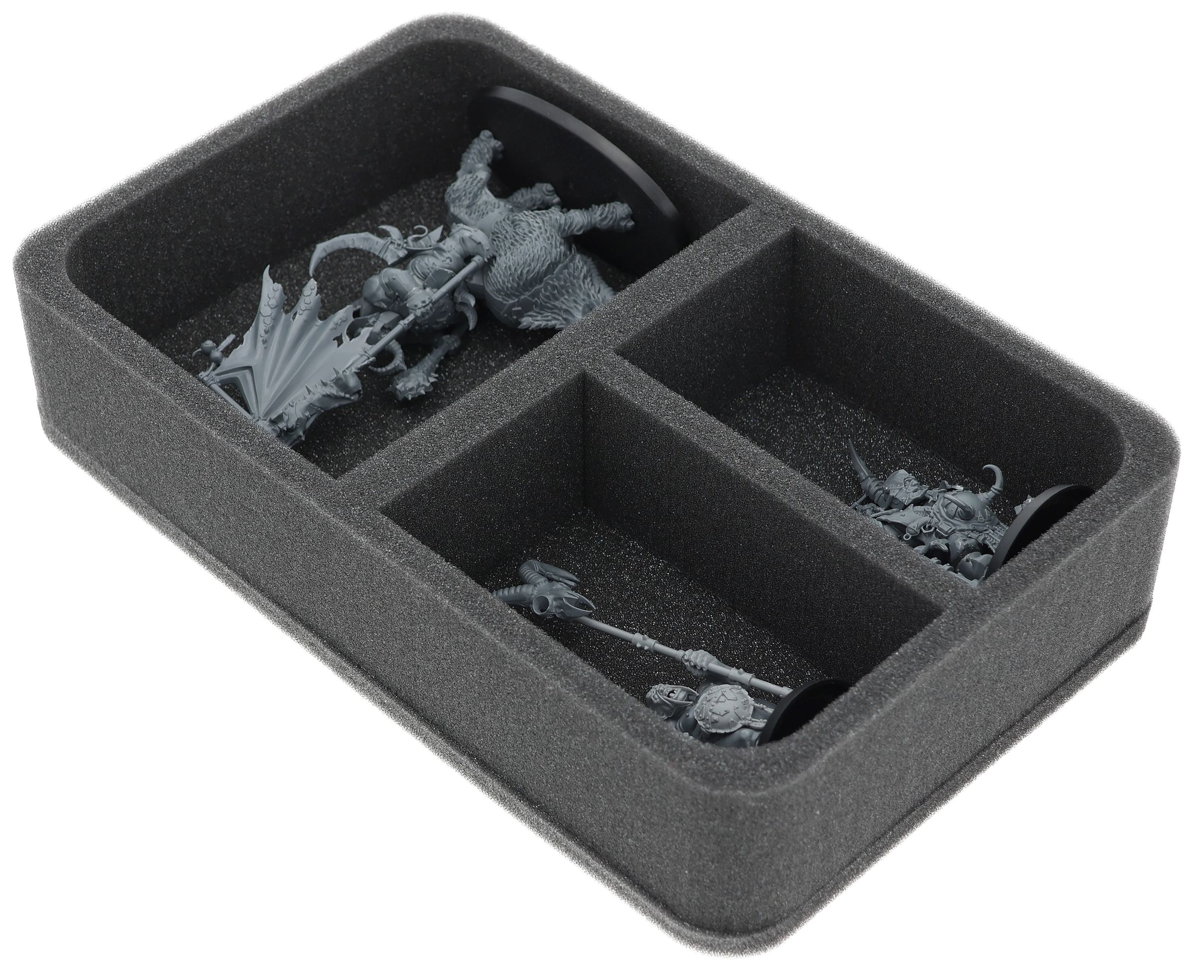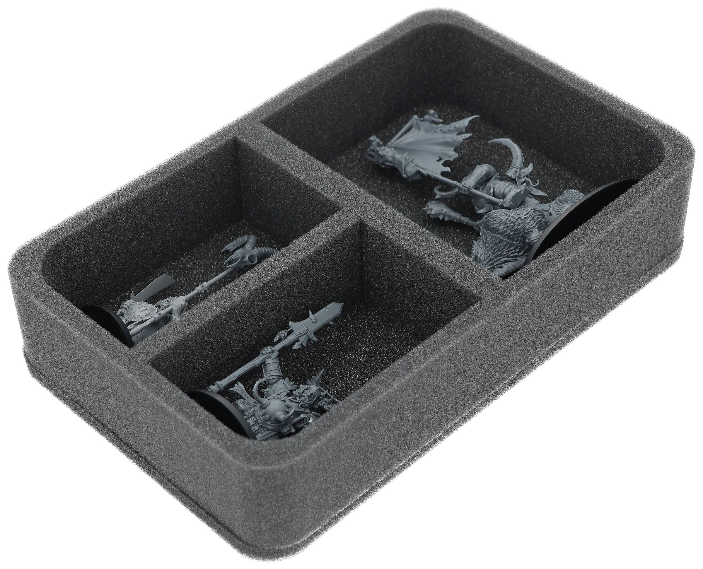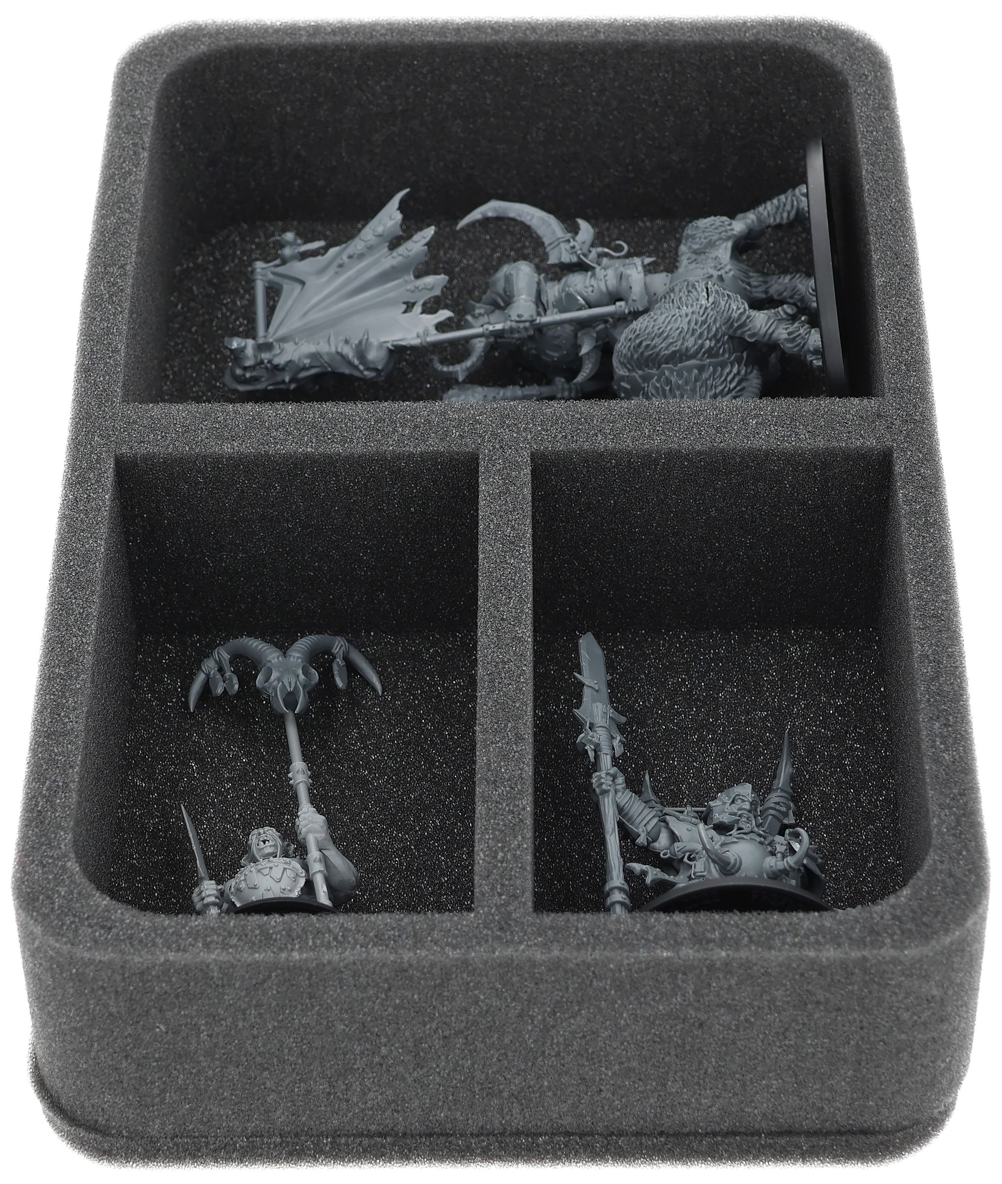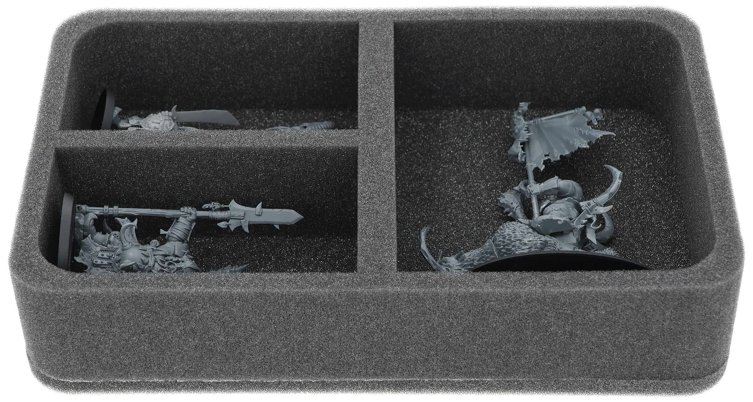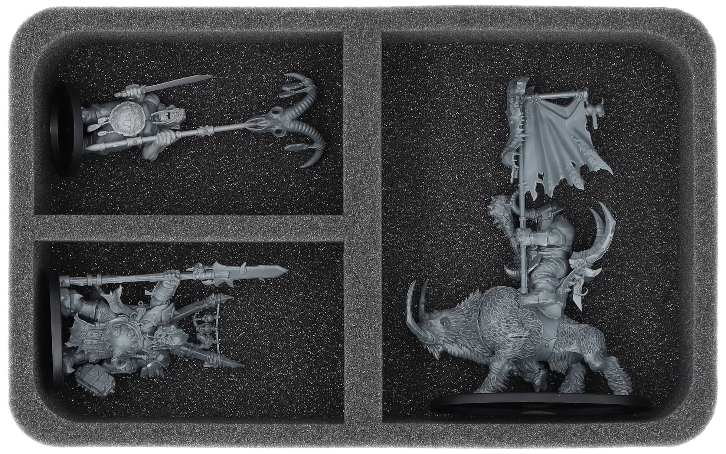On this Feldherr foam tray you have space for up to 3 miniatures of your army. The insert is especially suitable for storing the Leadbelchers Icon Bearer, Gluttons Icon Bearer, Mournfang Riders and similar sized models.