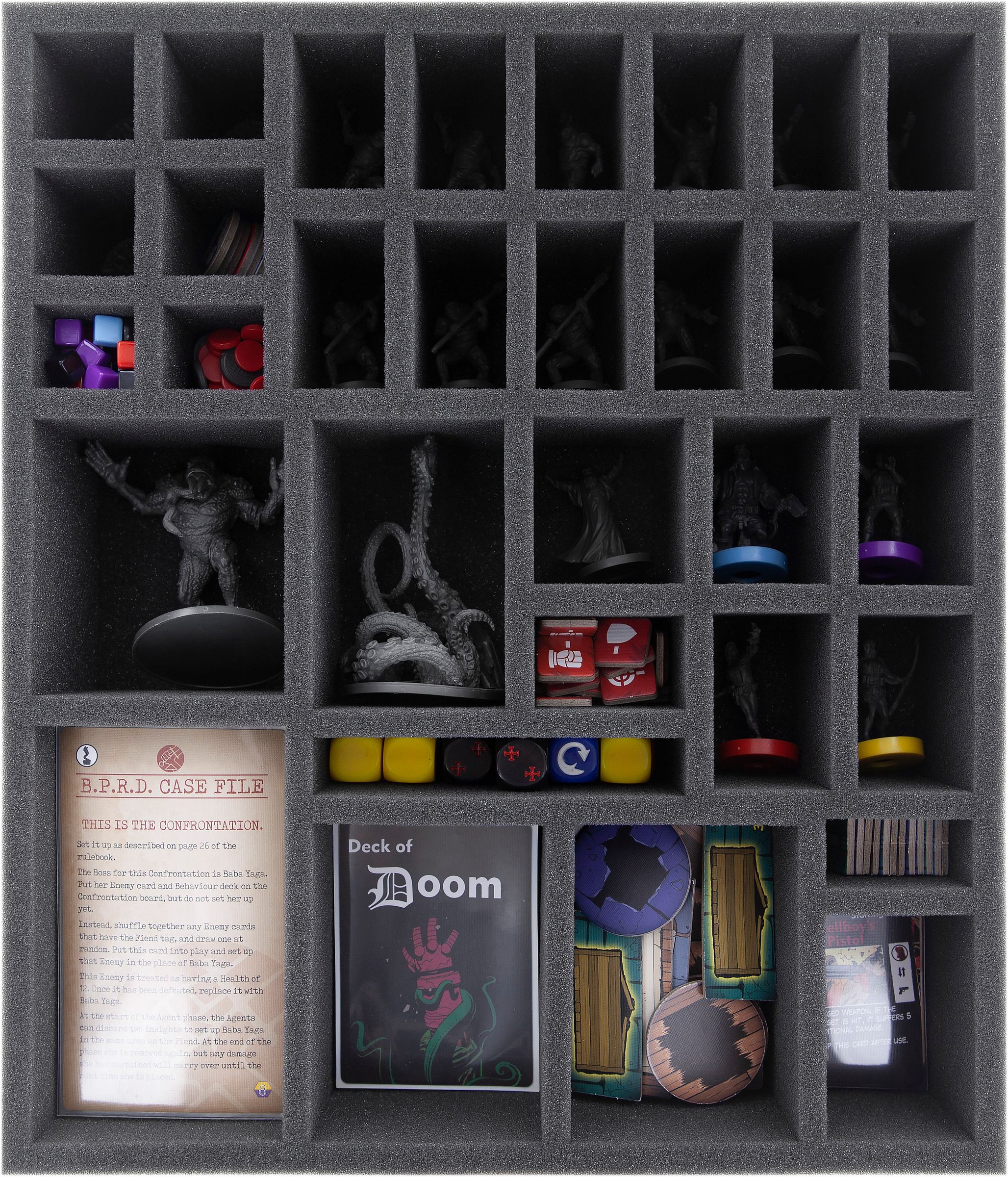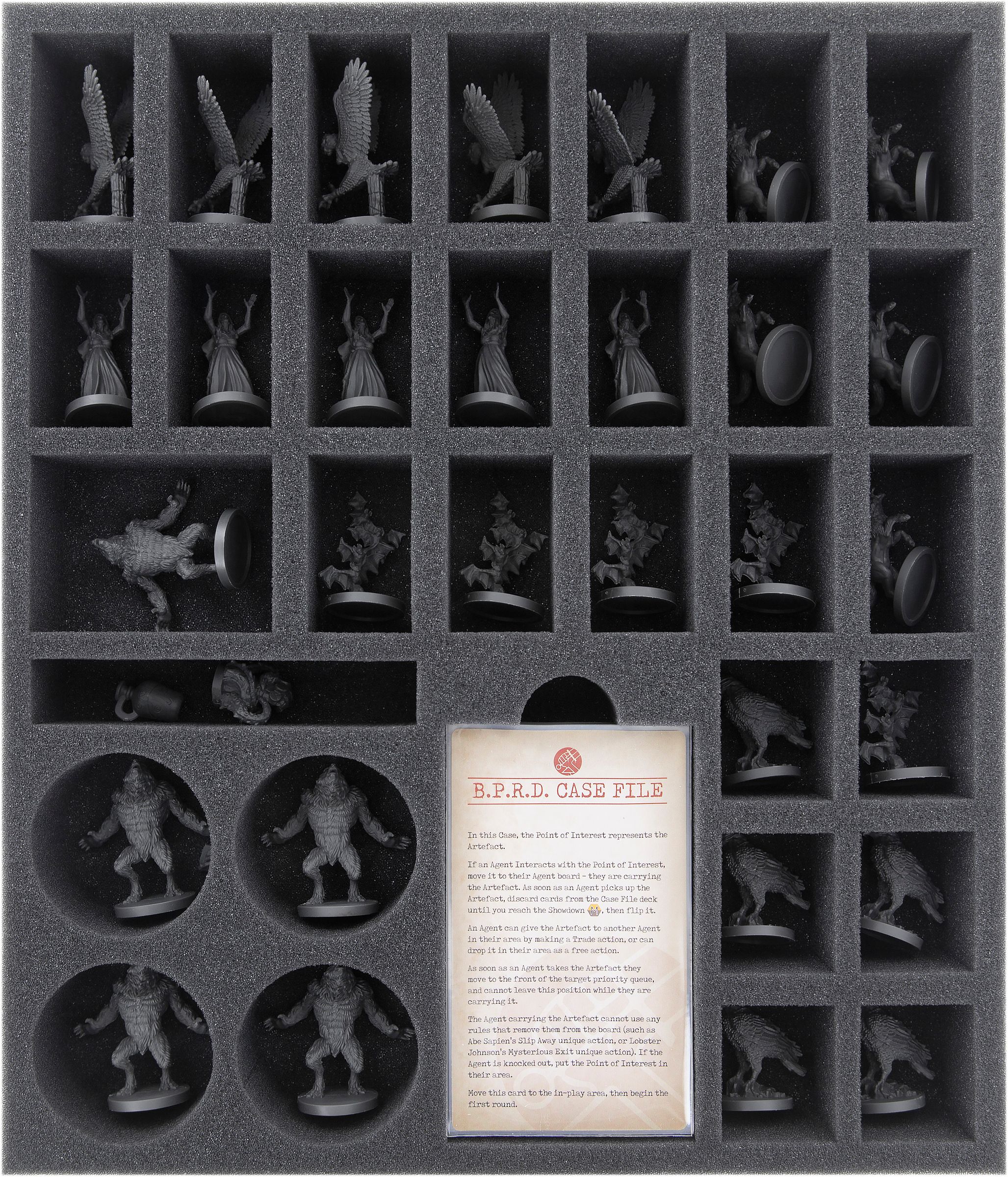 - Suitable for all miniatures of the Core Game, all miniatures of the "Conqueror Worm Expansion", all miniatures of the "BPRD Archives Expansion", the "Kickstarter exclusive Hellboy" miniature, all "Bonus Minions" miniatures and all "Stretch Goal" miniatures (except the 3-D Terrain Models). In addition, the set will hold all tokens, dice and (sleeved) cards (except Core Agent cards) of the "Agent Pledge".