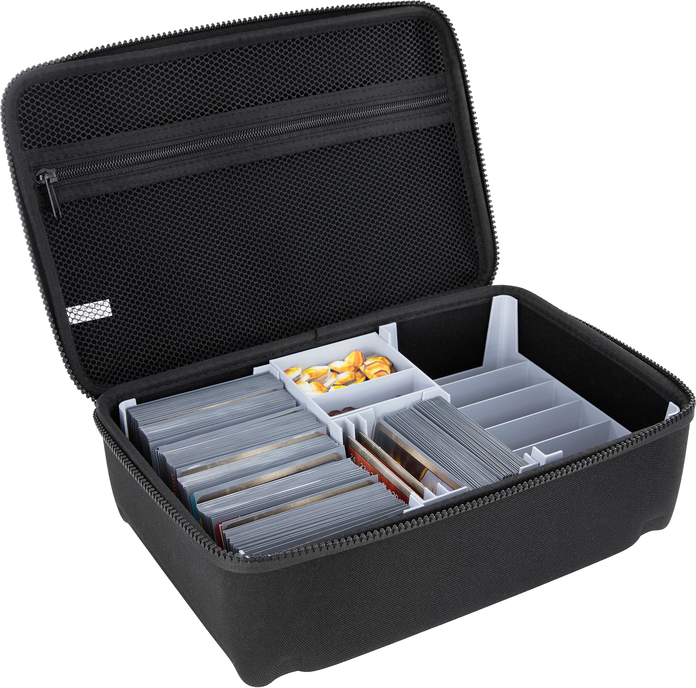 • On the inside of the lid is an additional compartment with a zipper. Here you can store game manuals and additional game material like the Gamegenic Chain Tracker.