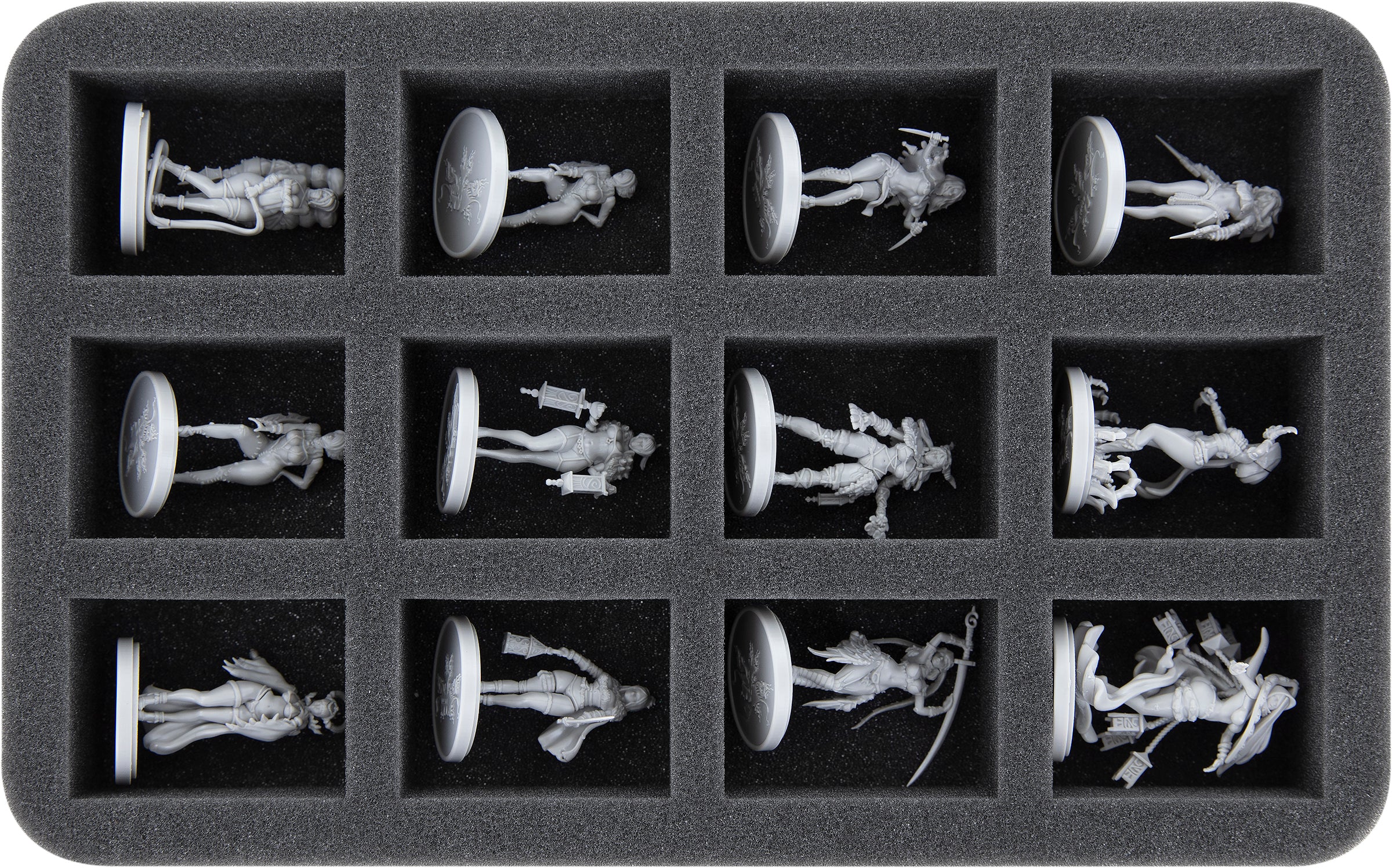 On this Feldherr foam tray, you have space for up to 12 miniatures from your Kingdom Death: Pinups Of Death - Series II collection. The insert is especially suitable for storing miniatures like Pinup Dragon Sacrifice, Lantern Festival, Leather Queen, Lioness, Phoenix Dance, Primal Huntress, Rawhide Dame, Regeneration Suit, Silk Assassin, Sunstalker Dancer, Twilight Witch, and similar-sized models.