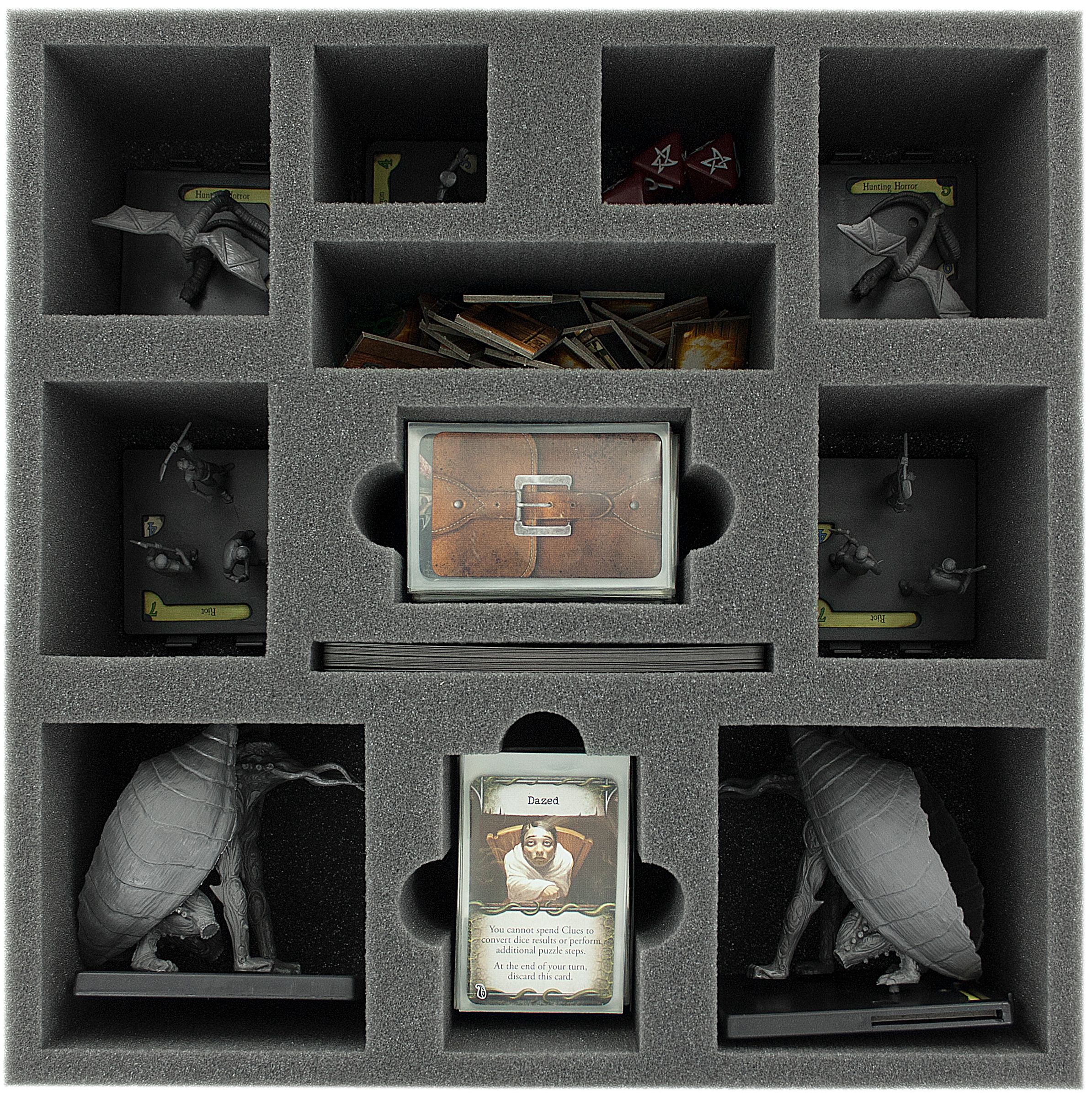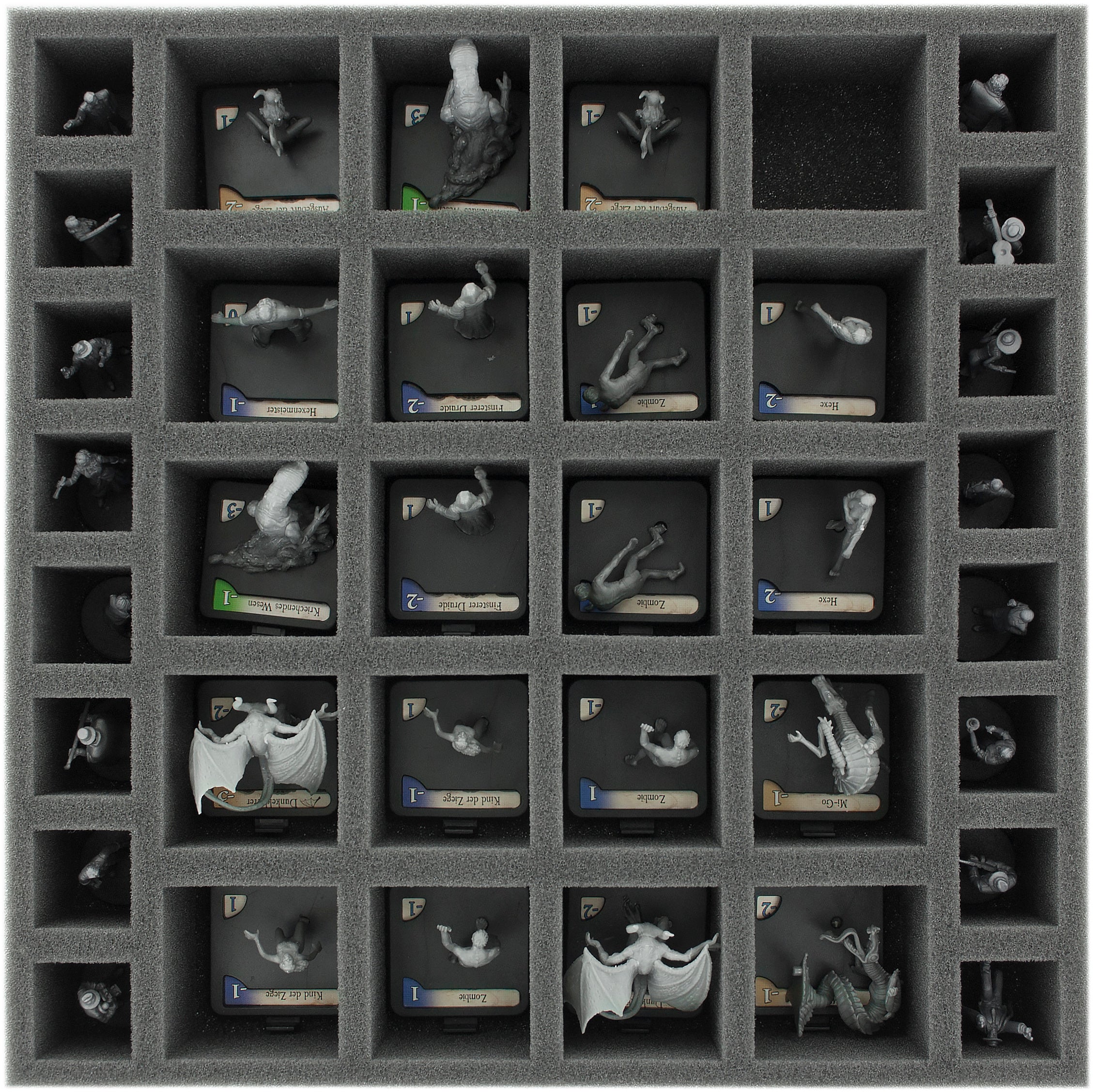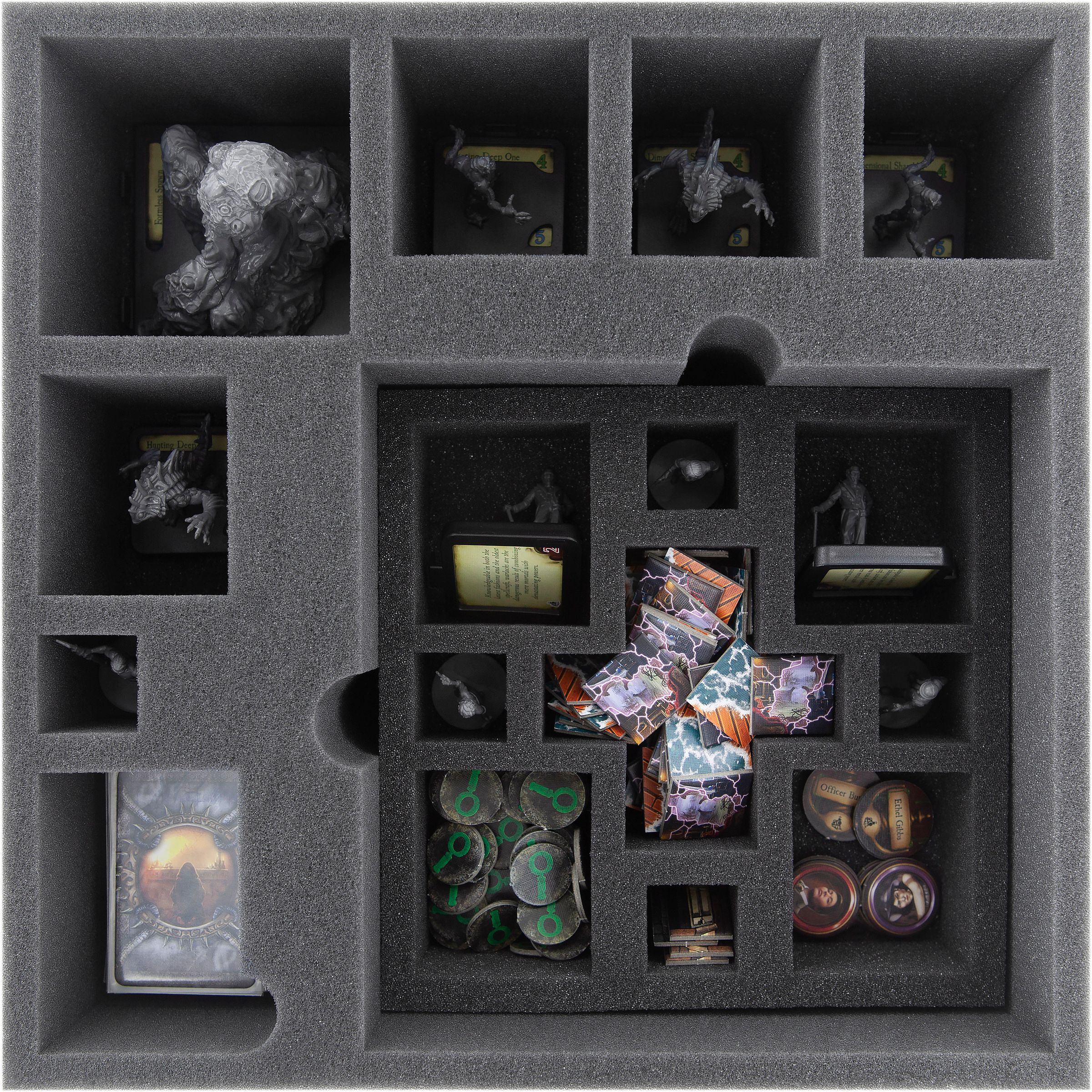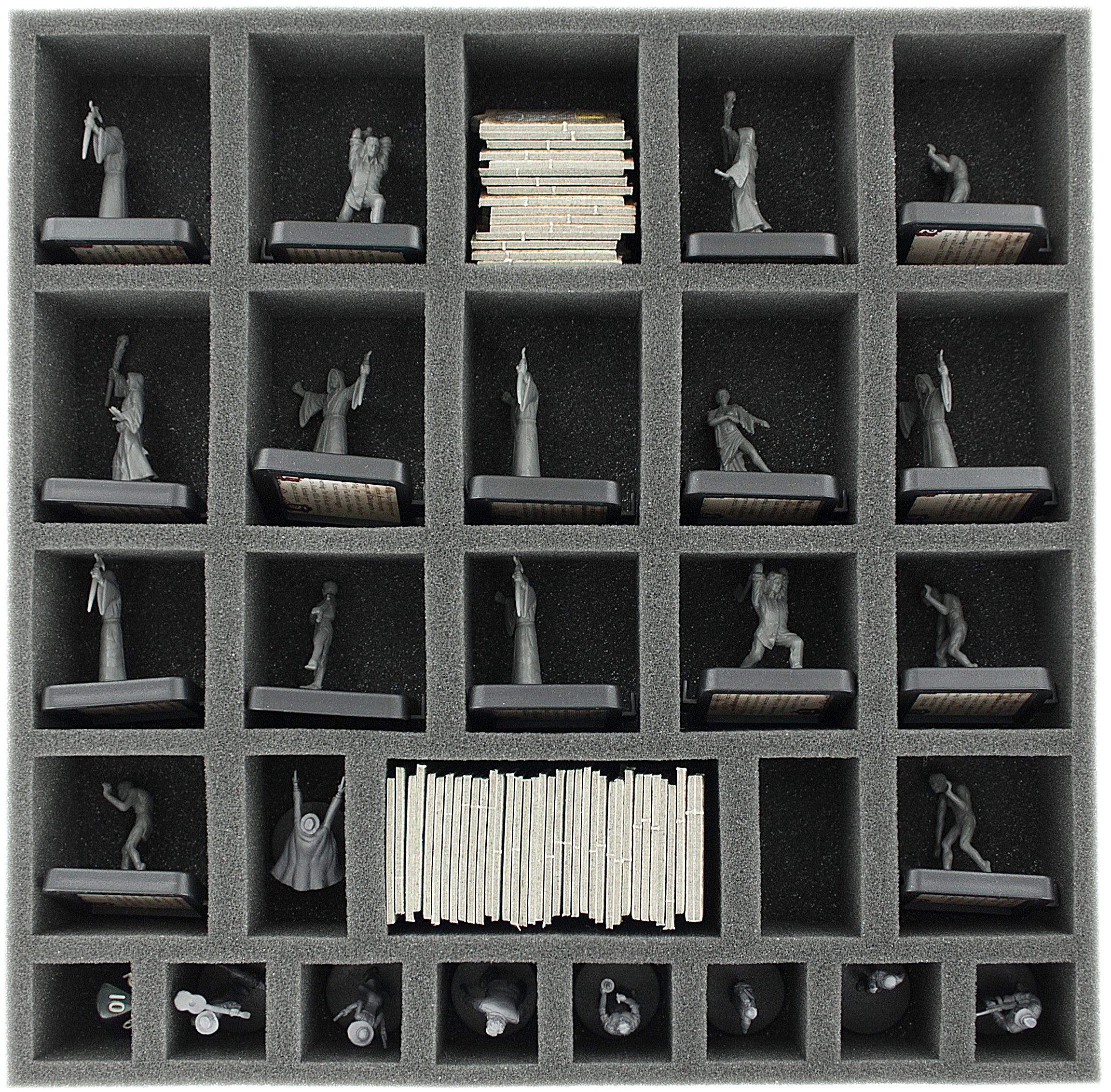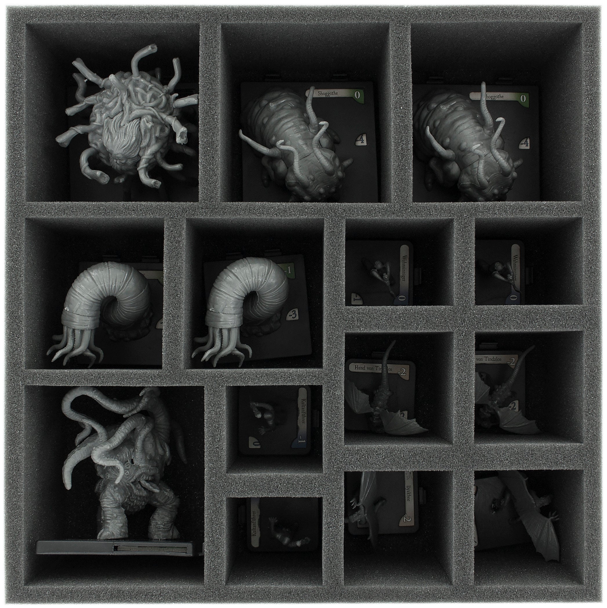 From the Shoggoths to the Chtonians to the Hounds of Tindalos and the investigators - every figure (including base) gets a suitable compartment. Thanks to the custom-fit cut, it is ensured that the miniatures stay in place during transport. Nothing slips around and no figure has to share a compartment with another.