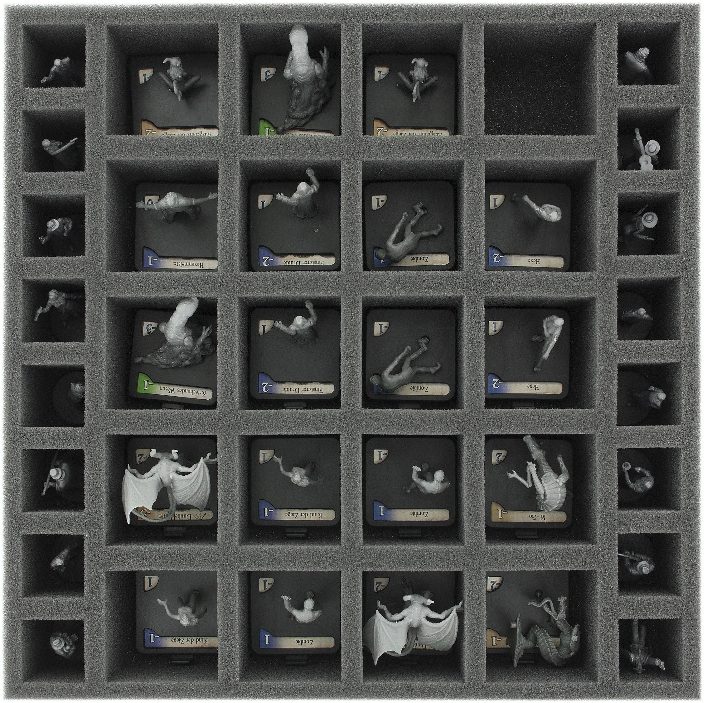 The set enables you to sensibly sort all miniatures, tiles, tokens and (sleeved) cards so that you are ready to start playing at any time. Of course, the fine-pored foam provides reliable protection for your game material – fragile miniature details stay intact, sensitive surfaces remain free from scratches and abrasion.