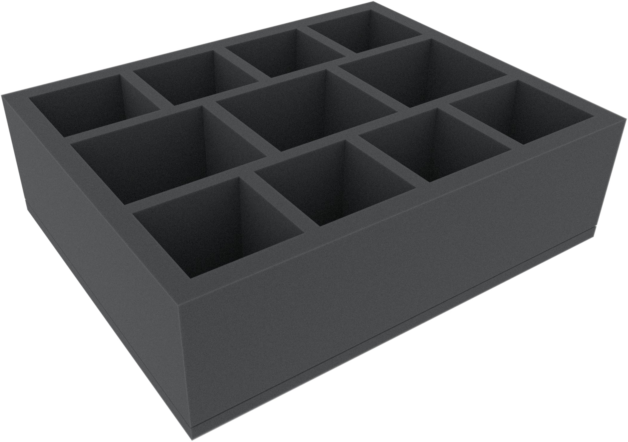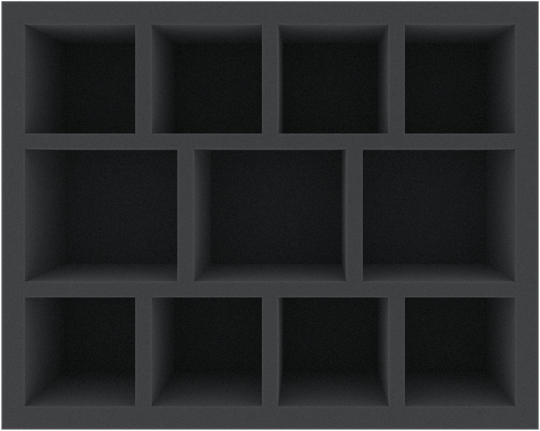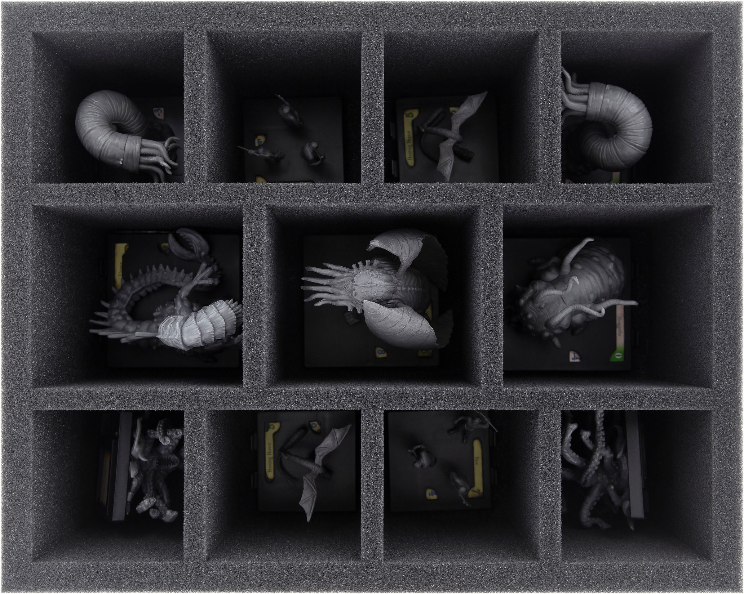 On this Feldherr Full-Size foam tray, divided into 11 compartments in two different sizes, you have room for your large and medium-sized monster figures. The three large compartments are designed for the miniatures on large base, such as the Shoggoths. In the 8 small compartments you can safely store the figures on medium base (e.g. Star Spawn or the Chtonians).