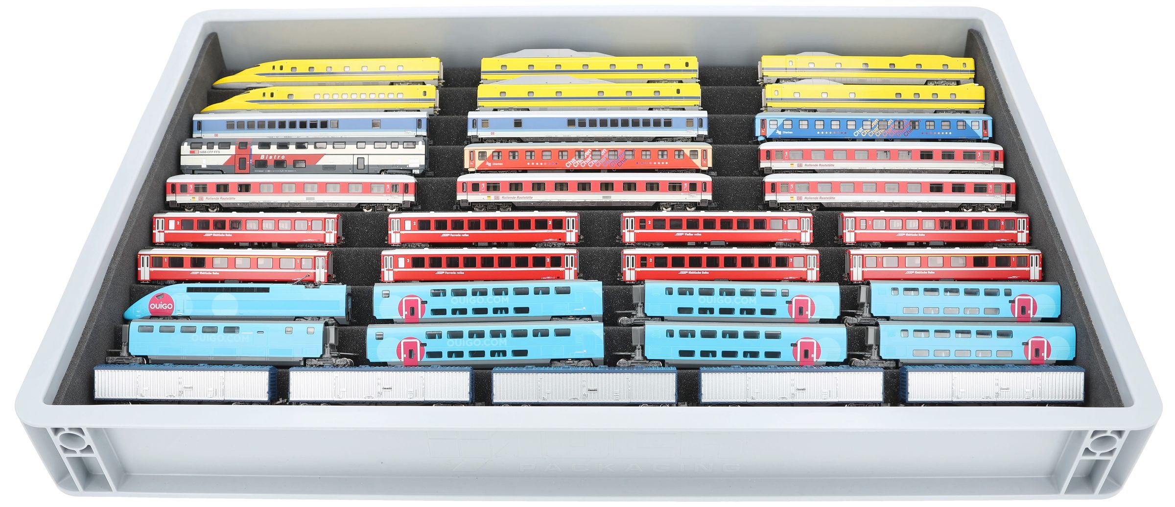 Several trains and carriages can be stored next to each other in one compartment. The set also contains the matching foam spacers to prevent them from colliding or accidental coupling. Additional spacers are available separately (HS025A002).