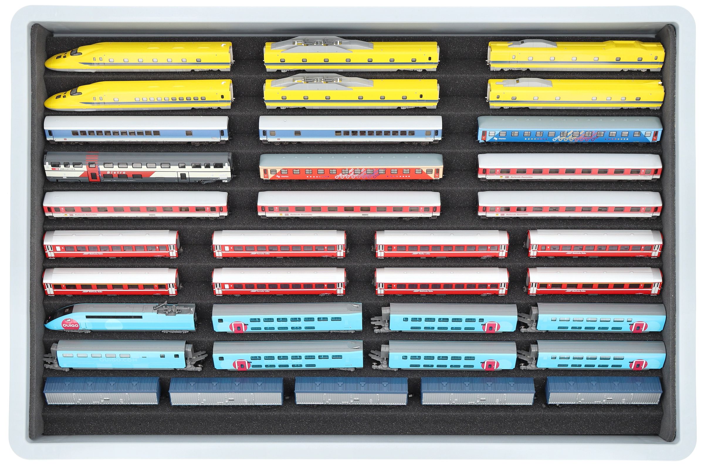 Ten compartments, tailor-made for model railways in gauge N, offer your locomotives and wagons reliable protection for storage and transport.