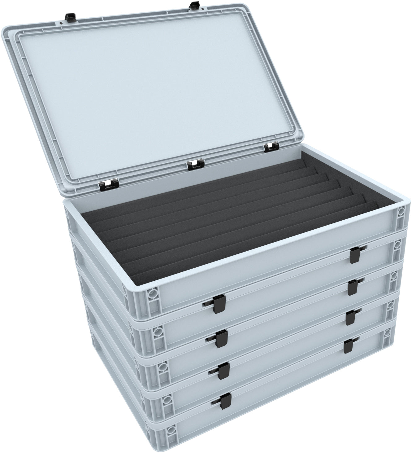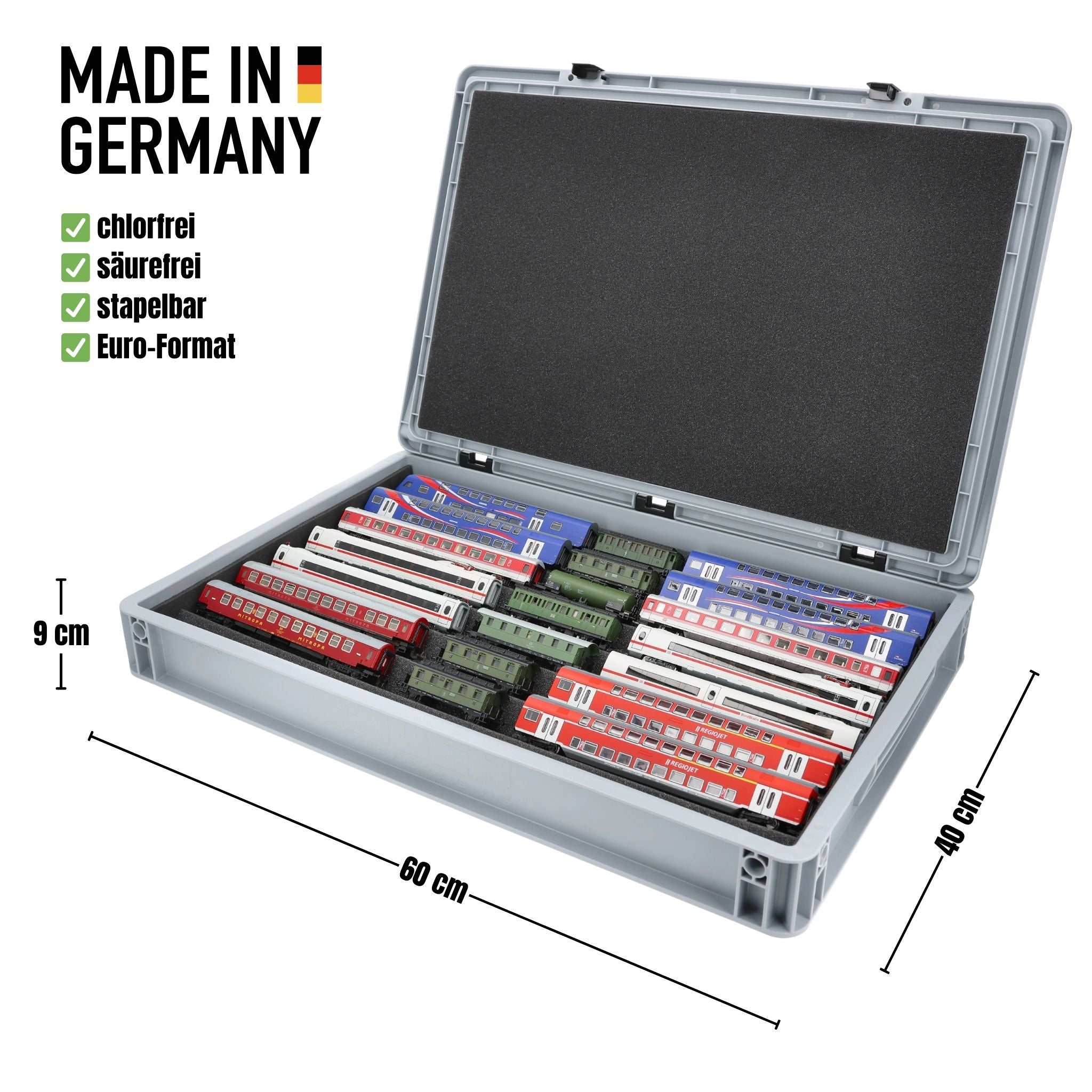 Your model railroad collection is stored absolutely safely in the robust Euro Container case from AUER Packaging made of shock-resistant and dimensionally stable plastic. The lid, with an easy-to-use hinge system and two locking levers, reliably protects the contents from dust and dirt. The box is stackable and can be carried with the recessed grips on the sides.