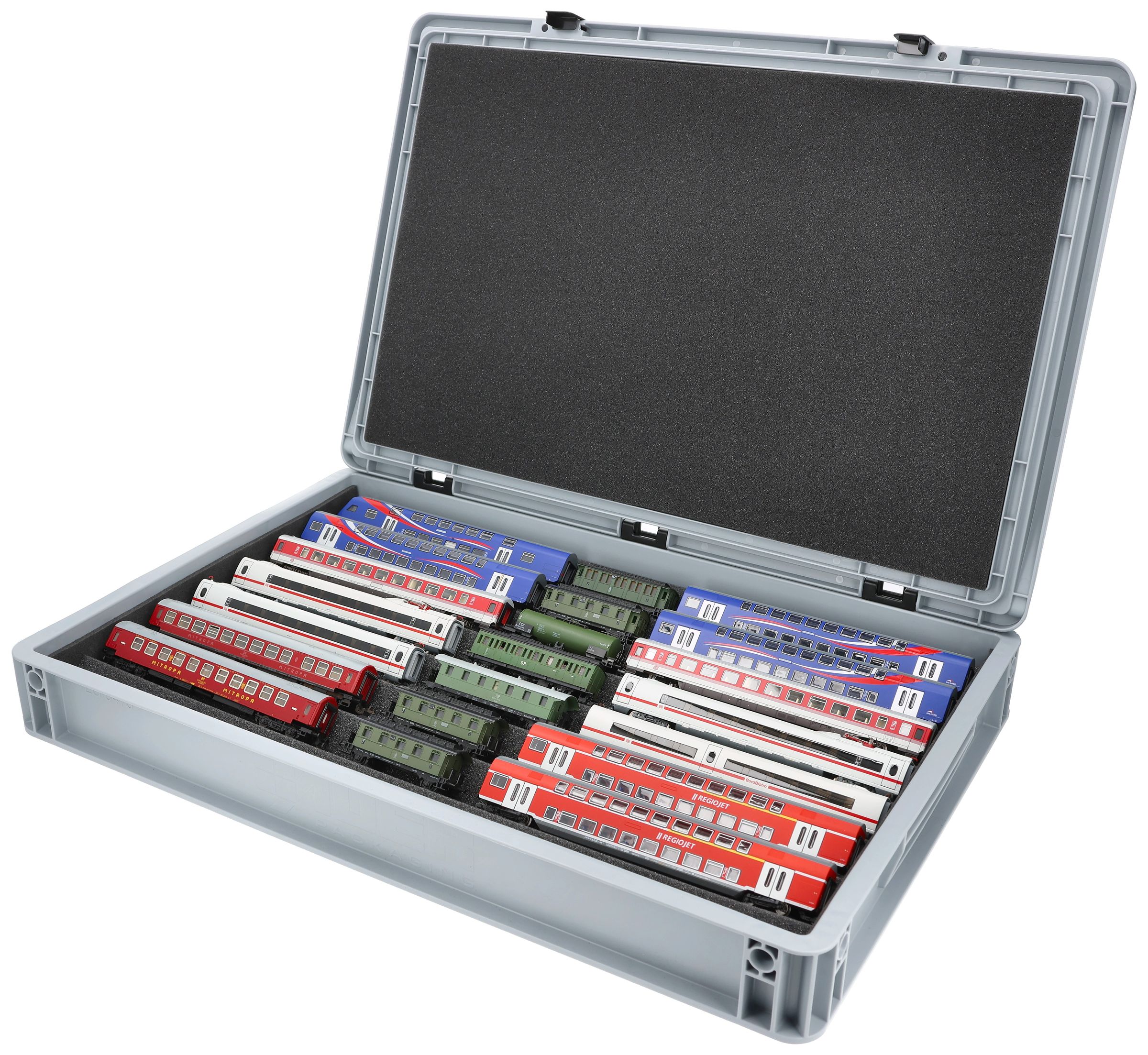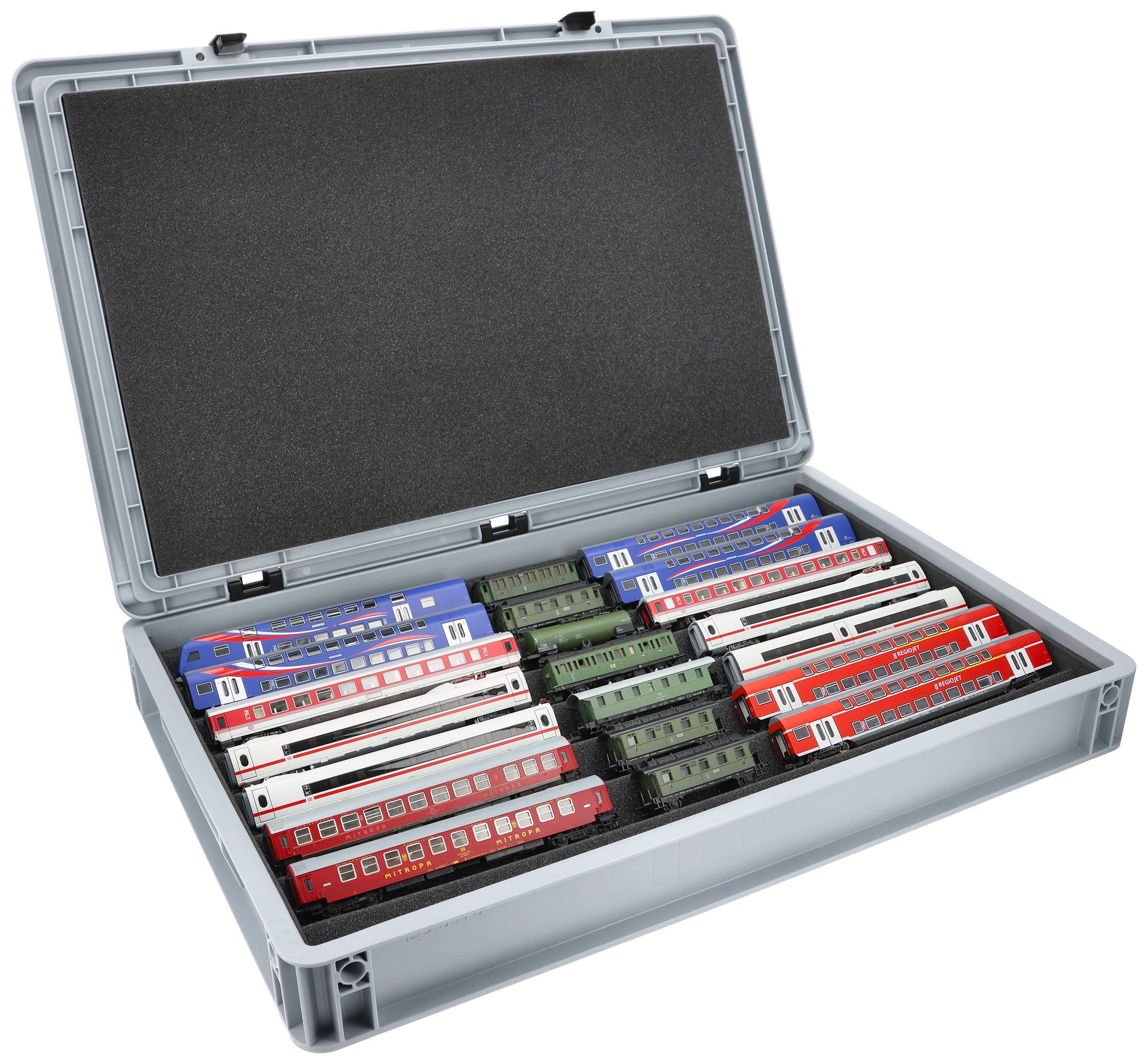 Stored properly, presented clearly and transported safely - The all-round foam inlay for model railways in TT gauge in the solid Eurobox.