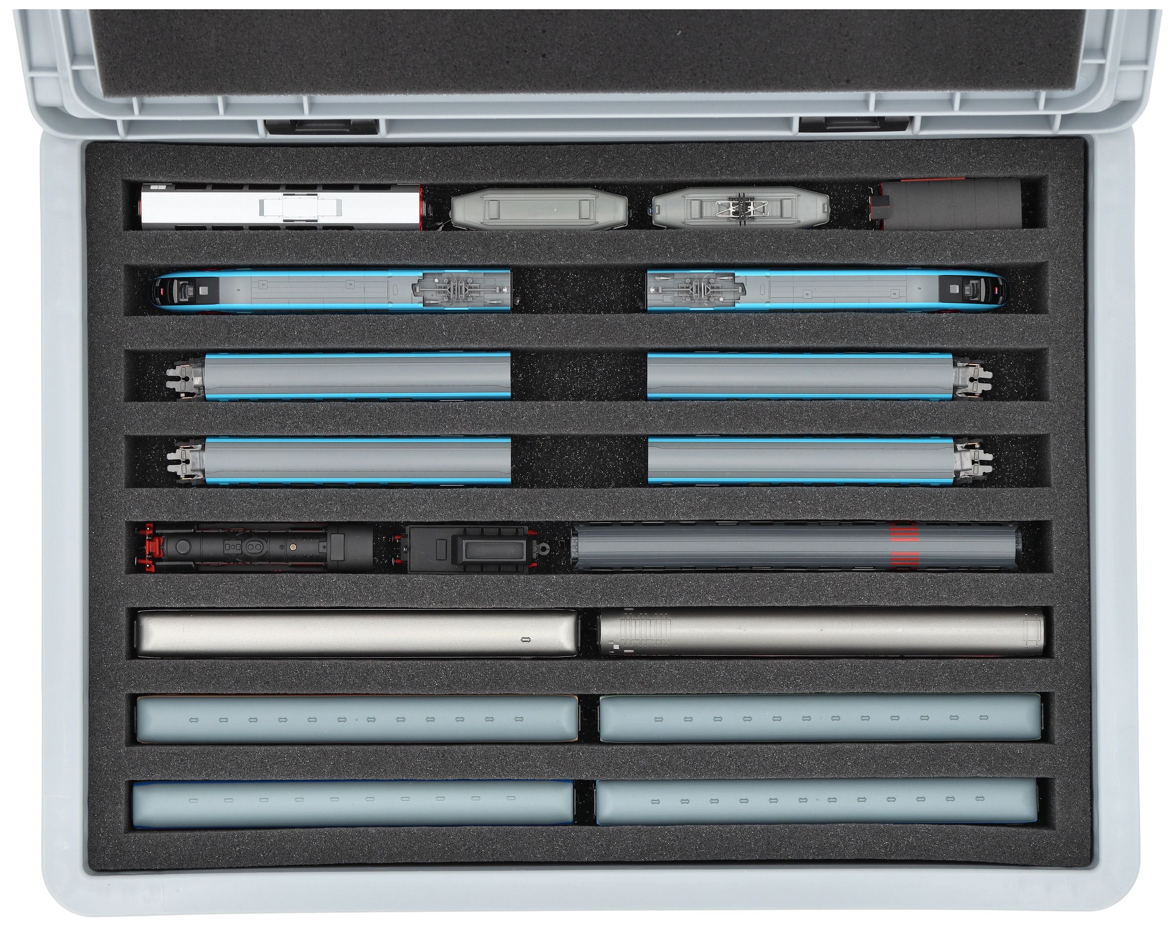 For anyone who wants to transport their N scale locomotives, wagons and vehicles safely and compactly: this Feldherr set combines a stackable Eurobox with a custom-fit foam insert. Whether for trips to the model railroad club, module meetings, or as a space-saving storage solution at home, your models are well protected at all times.