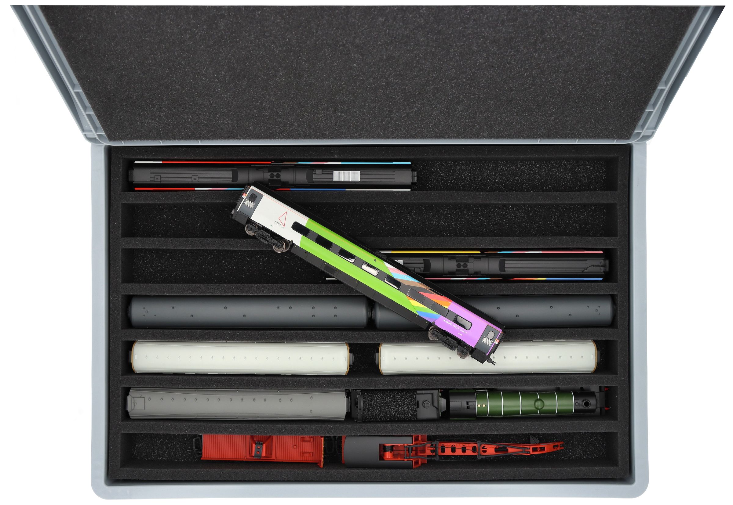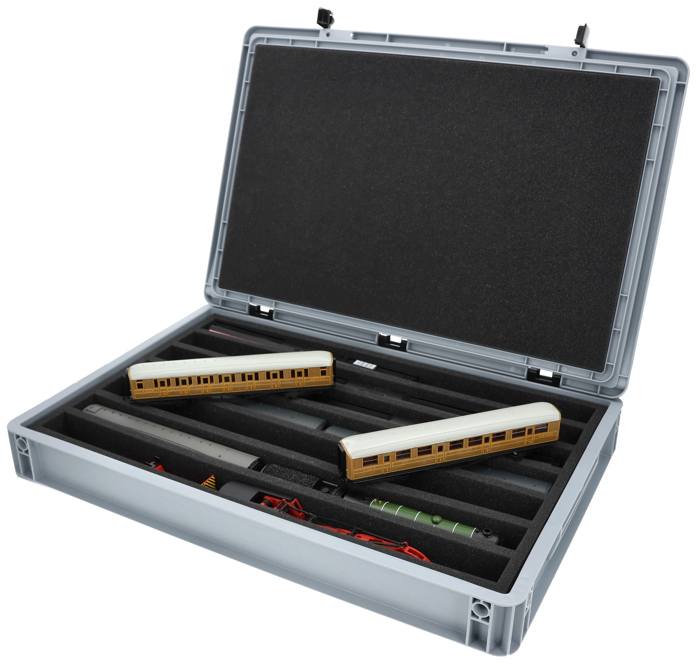 For anyone who wants to transport their 00 scale locomotives, wagons and vehicles safely and compactly: this Feldherr set combines a stackable Eurobox with a custom-fit foam insert. Whether for trips to the model railroad club, module meetings, or as a space-saving storage solution at home - your models are well protected at all times.
