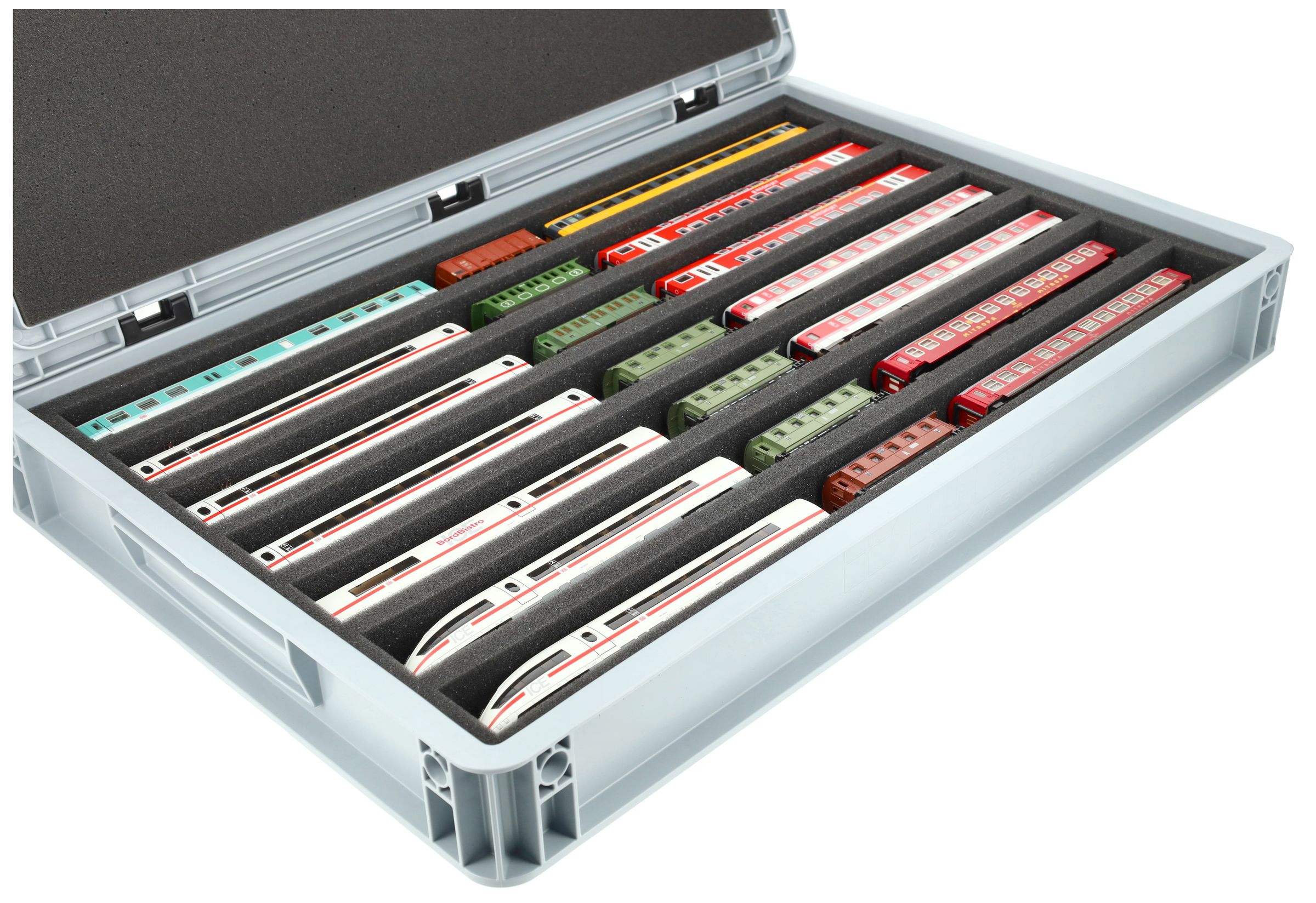 For anyone who wants to transport their TT scale locomotives, wagons and vehicles safely and compactly: this Feldherr set combines a stackable Eurobox with a custom-fit foam insert. Whether for trips to the model railroad club, module meetings, or as a space-saving storage solution at home - your models are well protected at all times.