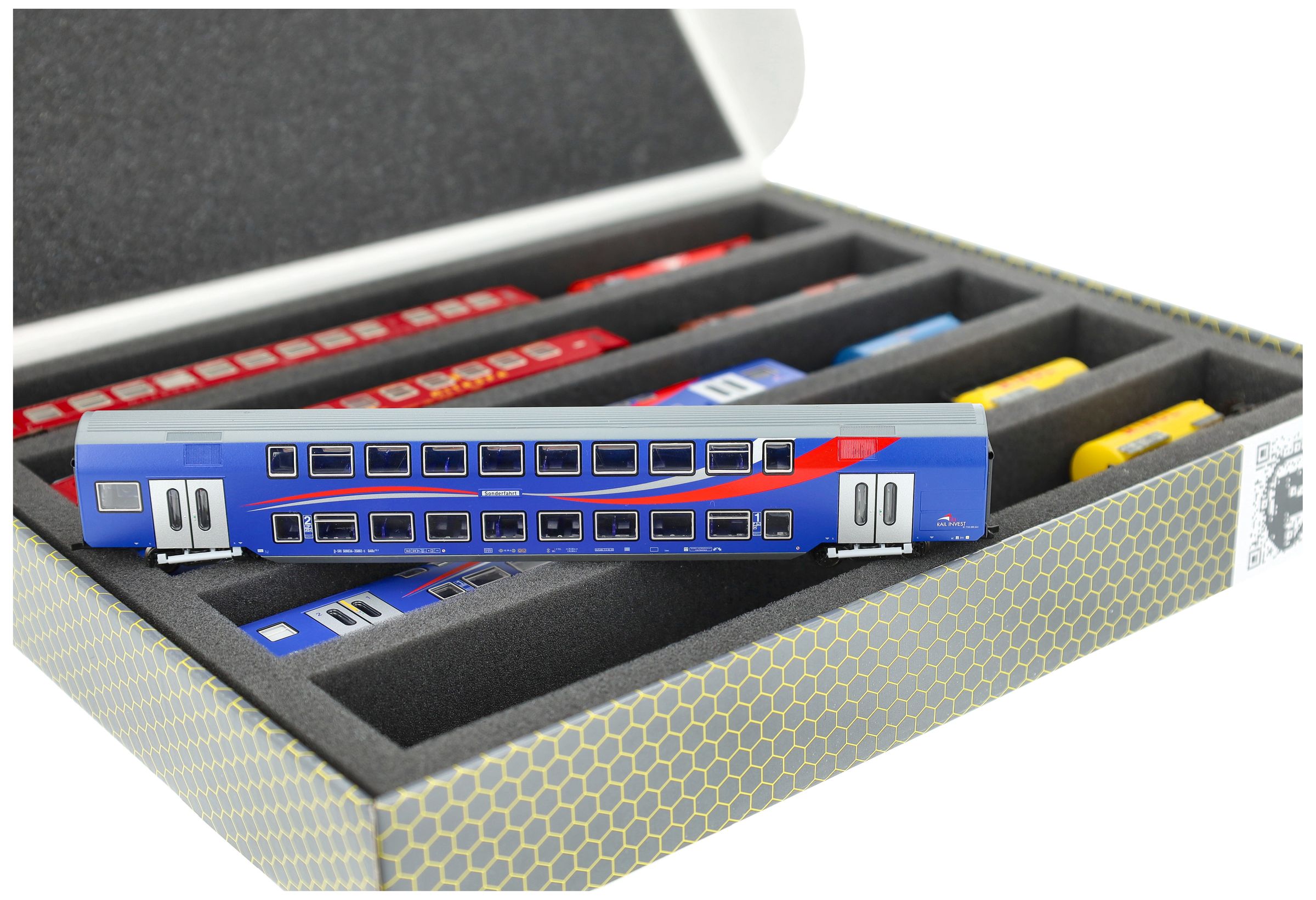 Several trains and carriages can be stored next to each other in one compartment. In order to prevent collision or unintentional coupling, we offer suitable foam spacers (HS040A003) to separate your vehicles.